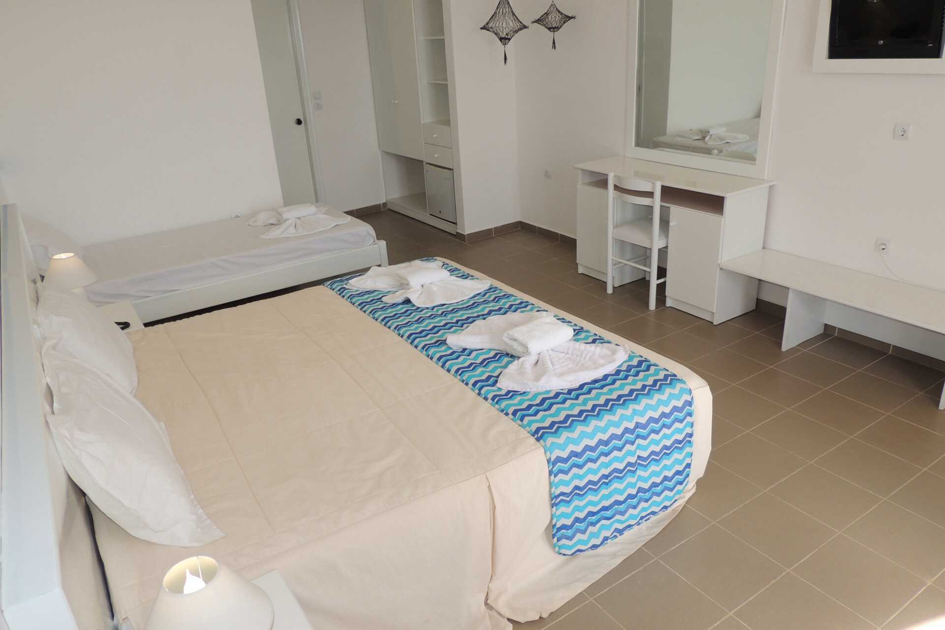 Dubbelrum med balkong och havsutsikt. En dubbelsäng. Wifi och luftkonditionering ingår. Litet kylskåp. Tv med lokala kanaler. Hårtork. Badrum med dusch och wc. Städning 6 ggr/vecka. Barn under två år räknas in i max antal personer i rummet.