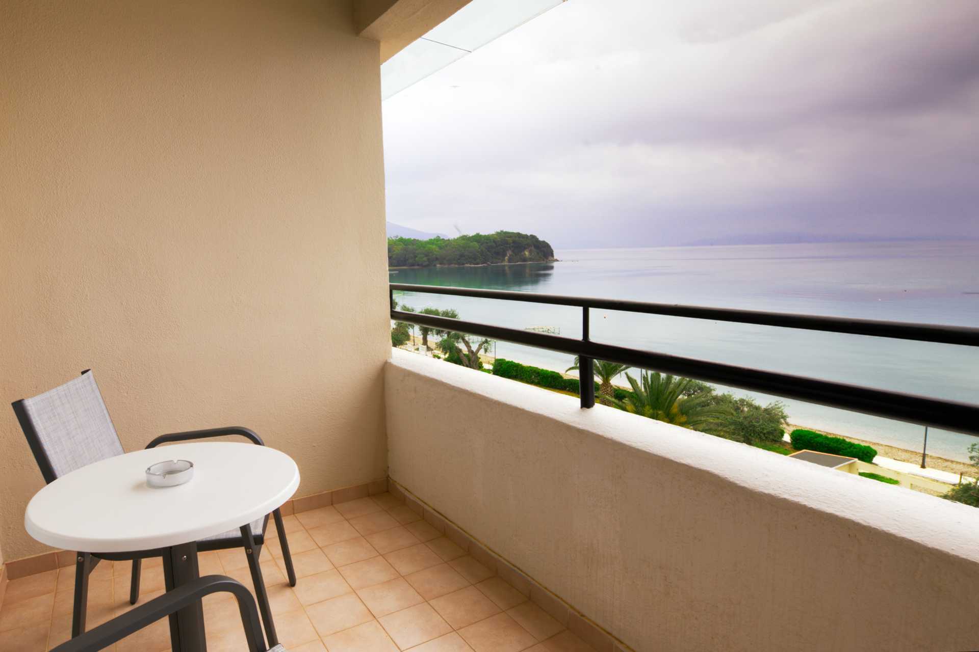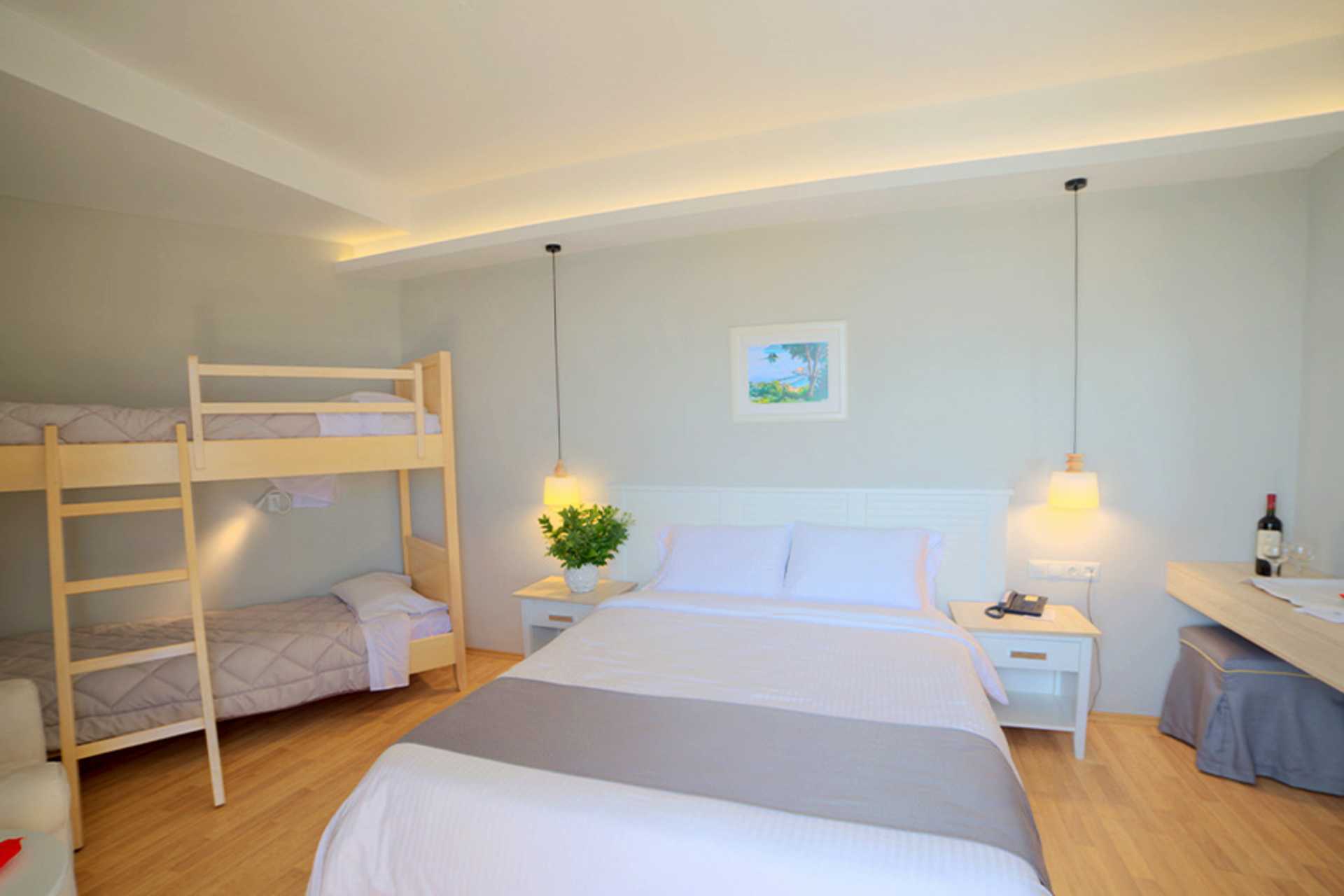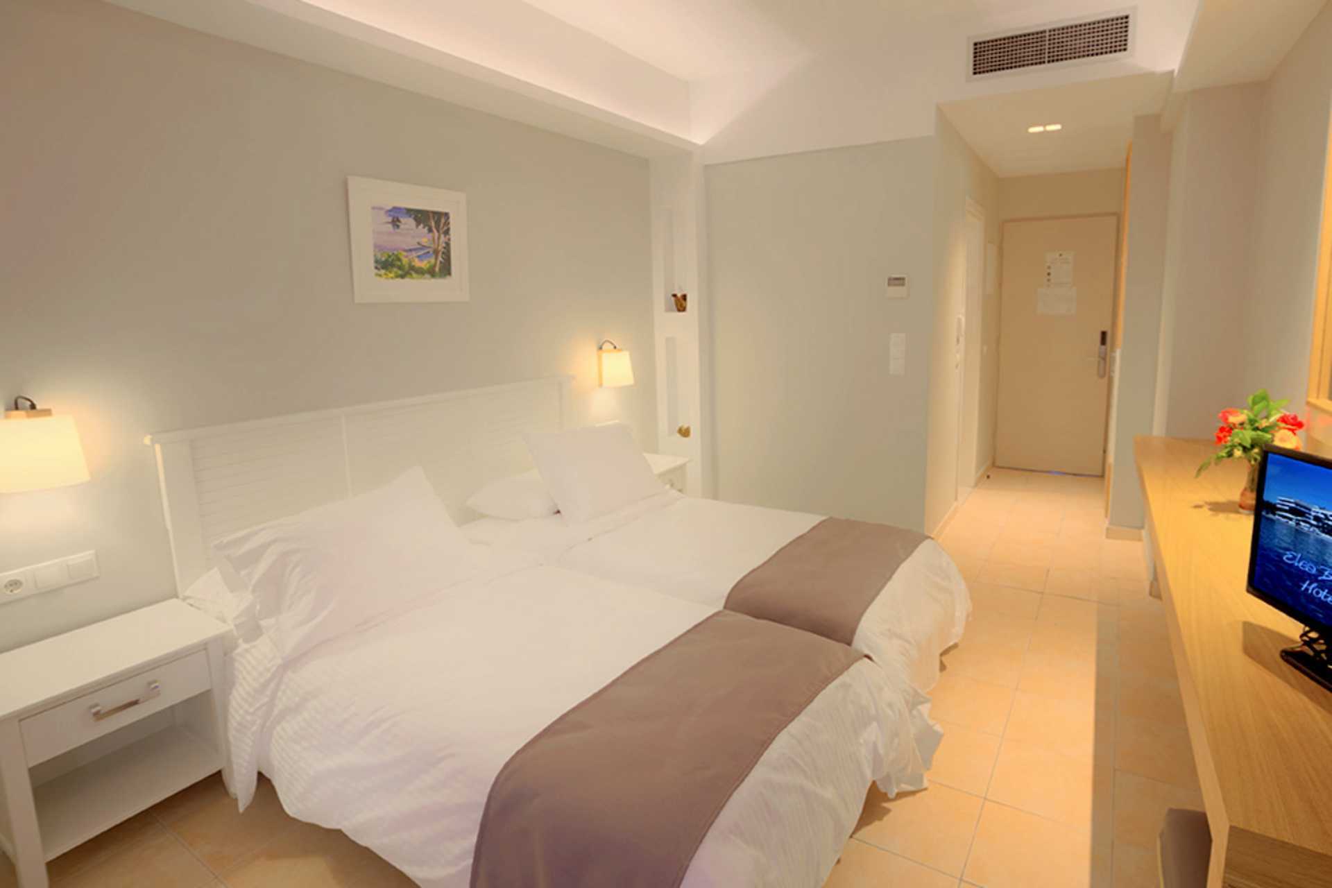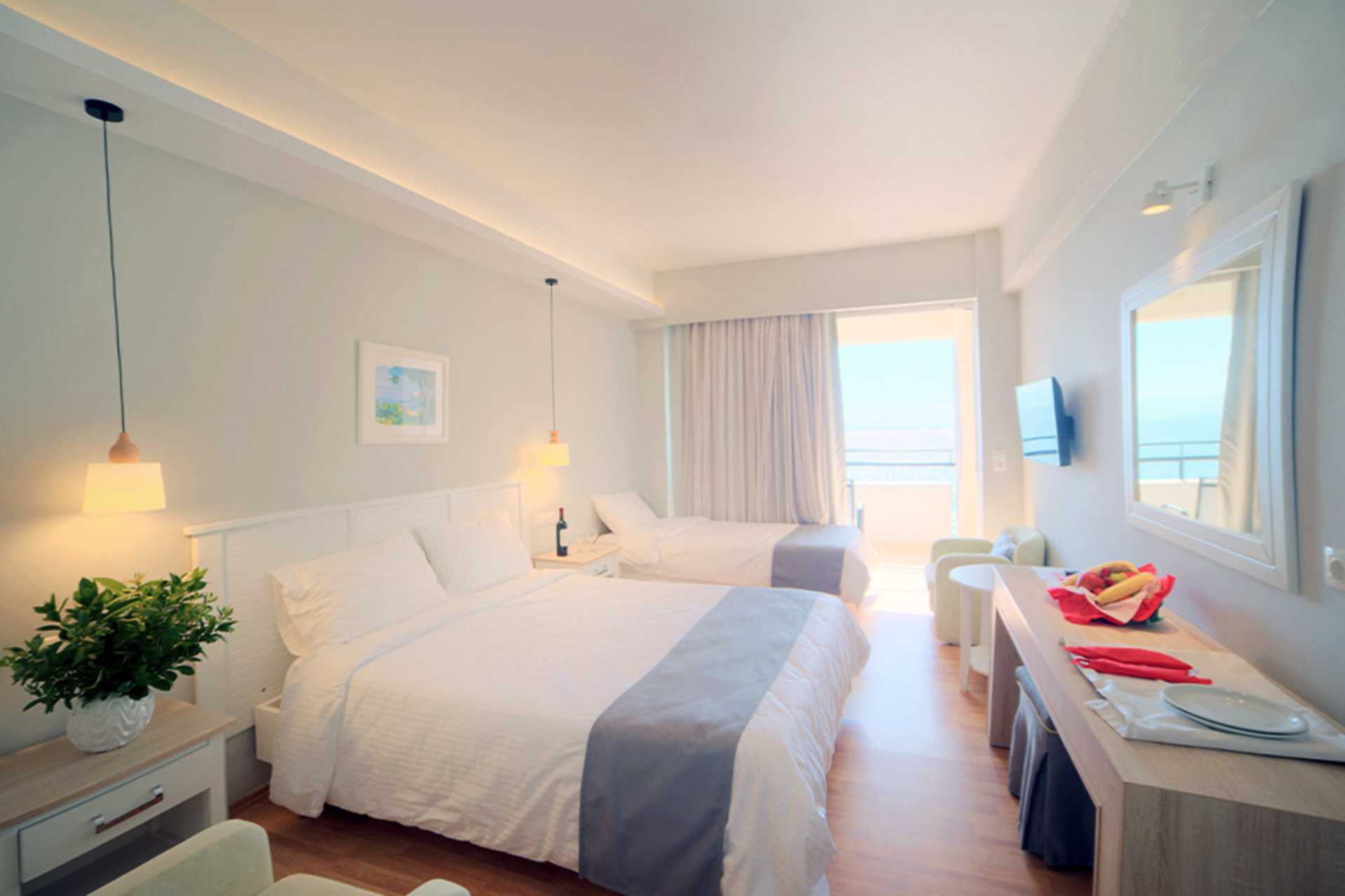 Familjerum med balkong och begränsad havsutsikt. En dubbelsäng eller två enkelsängar. Möjlighet till extrabäddar i våningssäng. Wifi och luftkonditionering ingår. Deponering mot avgift. Kylskåp. Vattenkokare samt kaffe och te. Tv med internationella kanaler. Hårtork. Badrum med badkar eller dusch samt wc. Städning 7 ggr/vecka