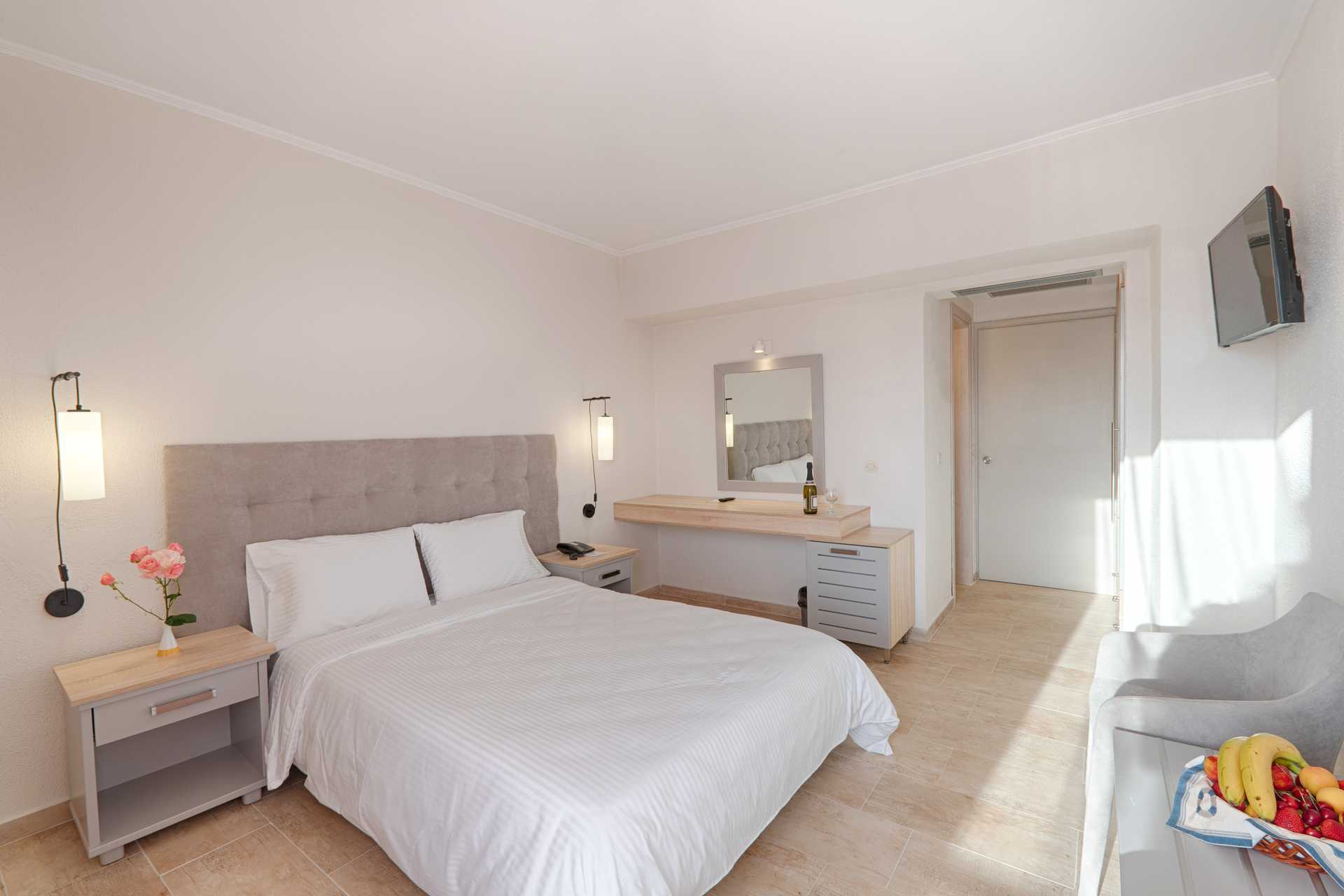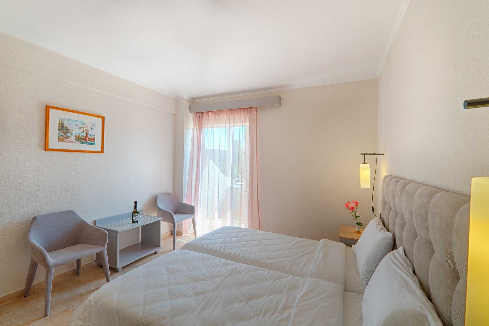 Dubbelrum med balkong. En dubbelsäng eller två enkelsängar. Möjlighet till extrabädd. Luftkonditionering och wifi ingår. Deponering mot avgift. Kylskåp. Tv med internationella kanaler. Hårtork. Badrum med badkar eller dusch samt wc. Städning 7 ggr/vecka.