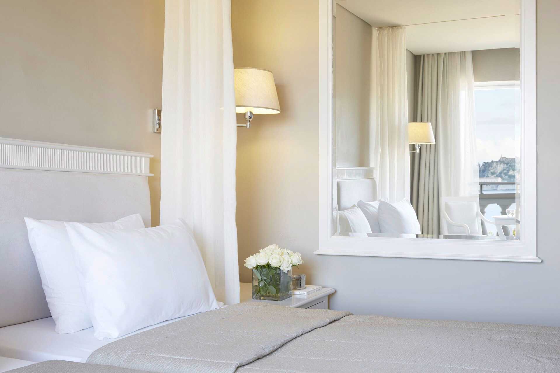 Dubbelrum med balkong, vissa med havsutsikt eller med begränsad havsutsikt. En dubbelsäng eller två enkelsängar. Wifi och luftkonditionering ingår. Deponering mot avgift. Kylskåp. Vattenkokare samt kaffe och te. Tv med internationella kanaler. Hårtork. Badrum med badkar eller dusch samt wc. Städning 7 ggr/vecka.