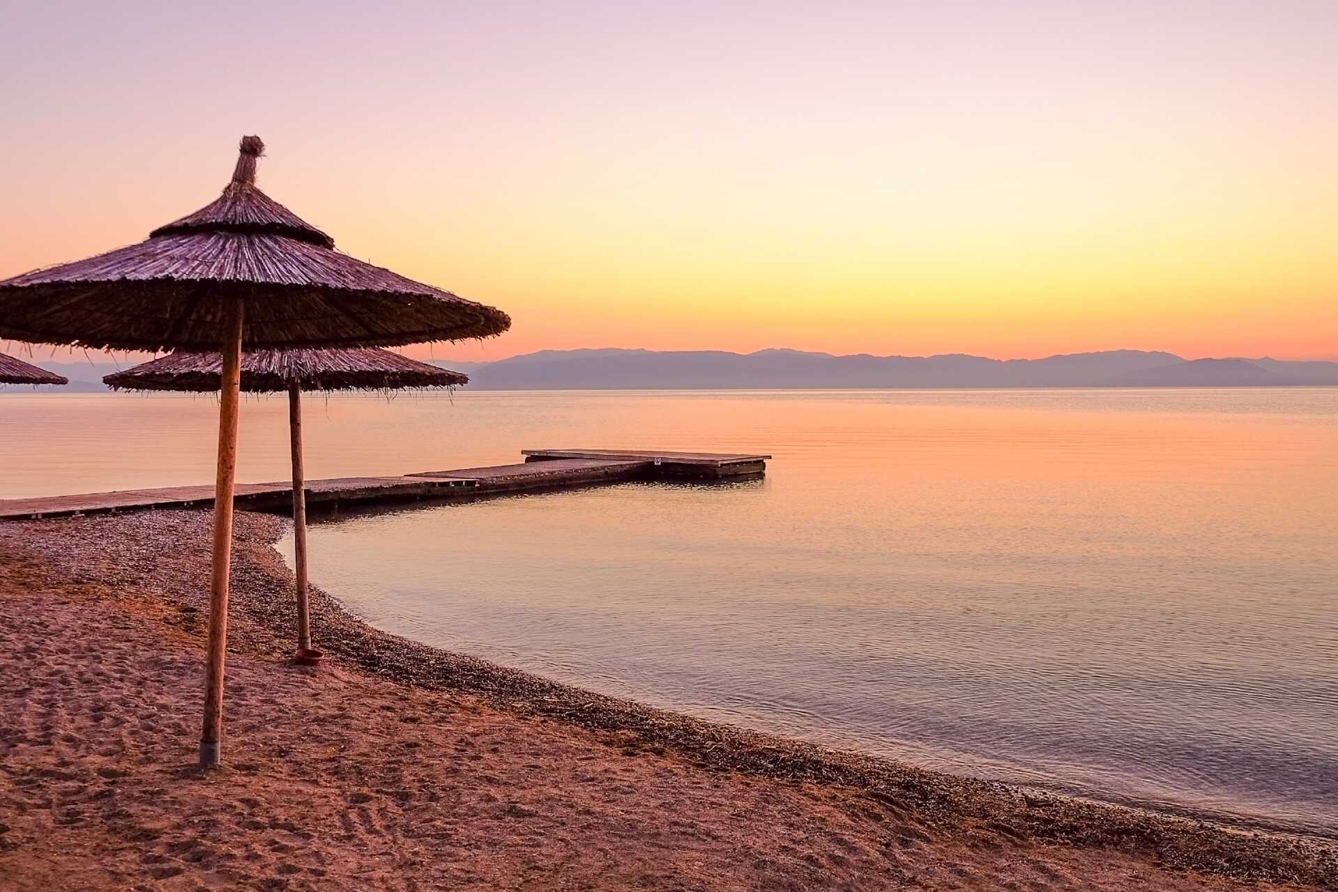 Stranden som ligger ett par hundra meter från centrum, är långgrund och barnvänlig med kristallklart vatten.