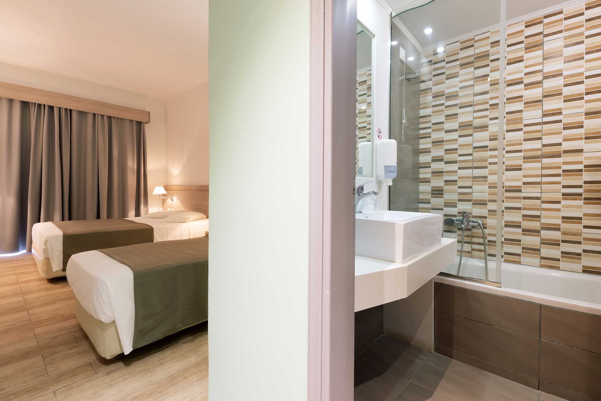 Dubbelrum med balkong eller terrass. Rummen ligger i sidobyggnad ligger i vuxendelen Kalimera där man måste vara 16 år eller äldre för att bo. En dubbelsäng eller två enkelsängar. Wifi, luftkonditionering och deponering ingår. Kylskåp. Tv med internationella kanaler. Hårtork. Badrum med badkar eller dusch samt wc. Städning 7 ggr/vecka.