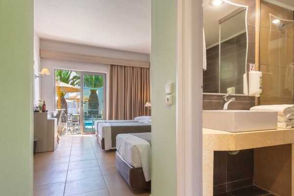 Dubbelrummen med utgång till en delad gemensam pool. På terrassen finns solstolar samt bord och stolar. Rummen ligger i sidobyggnad i vuxendelen Kalimera där man måste vara 16 år eller äldre för att bo. En dubbelsäng eller två enkelsängar. Wifi, luftkonditionering och deponering ingår. Minibar med daglig påfyllning av öl, vin, juice, vatten och läsk. Vattenkokare samt kaffe och te. Tv med internationella kanaler. Hårtork. Badrum med badkar eller dusch samt wc. Städning 7 ggr/vecka.
