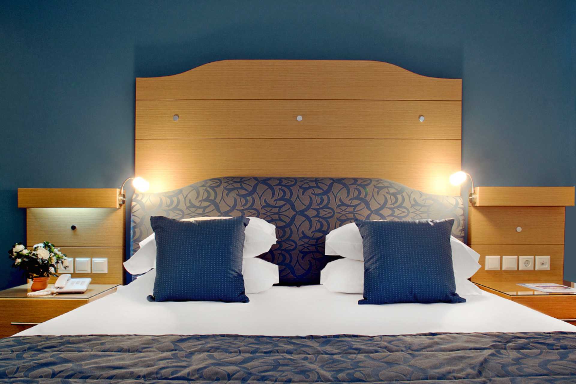 Dubbelrum med balkong eller terrass och havsutsikt. En dubbelsäng eller två enkelsängar. Möjlighet till extrabädd i bäddsoffa eller i hopvikbar säng. Wifi och luftkonditionering ingår. Deponering mot avgift. Kylskåp. Vattenkokare. Tv med internationella kanaler. Hårtork. Badrum med badkar och wc. Städning 7 ggr/vecka. Barn under två år räknas in i max antal personer i rummet.