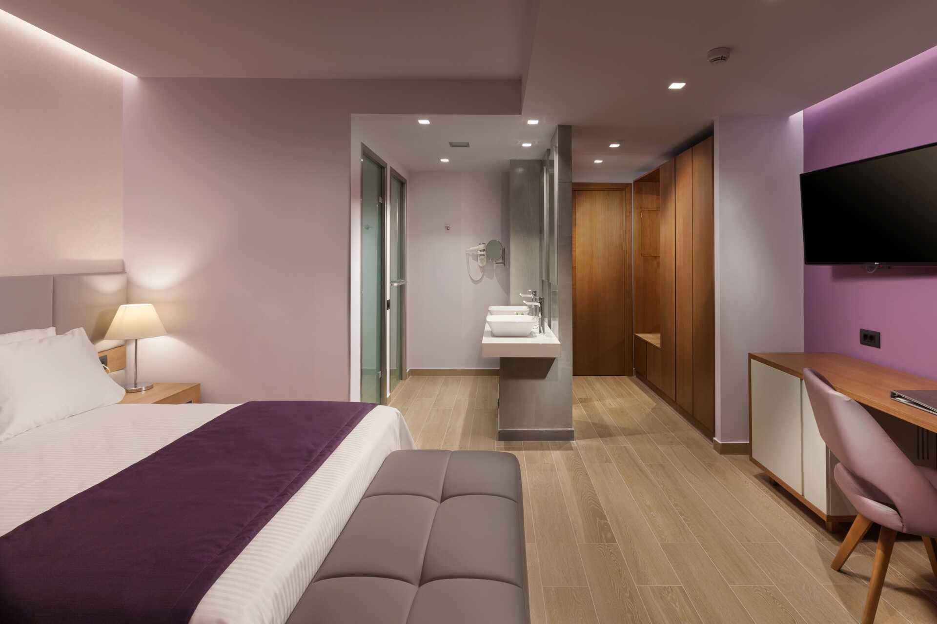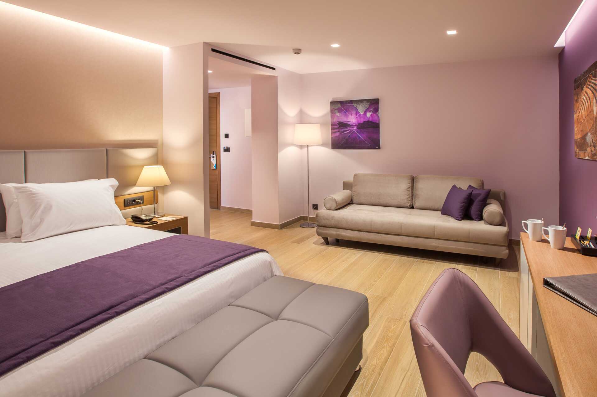 Juniorsvit med balkong. En dubbelsäng eller två enkelsängar. Möjlighet till extrabäddar i bäddsoffa. Wifi, luftkonditionering och deponering ingår. Kylskåp. Vattenkokare samt kaffe och te. Tv med internationella kanaler. Hårtork. Badrum med dusch eller dusch och badkar samt wc. Städning 7 ggr/vecka.