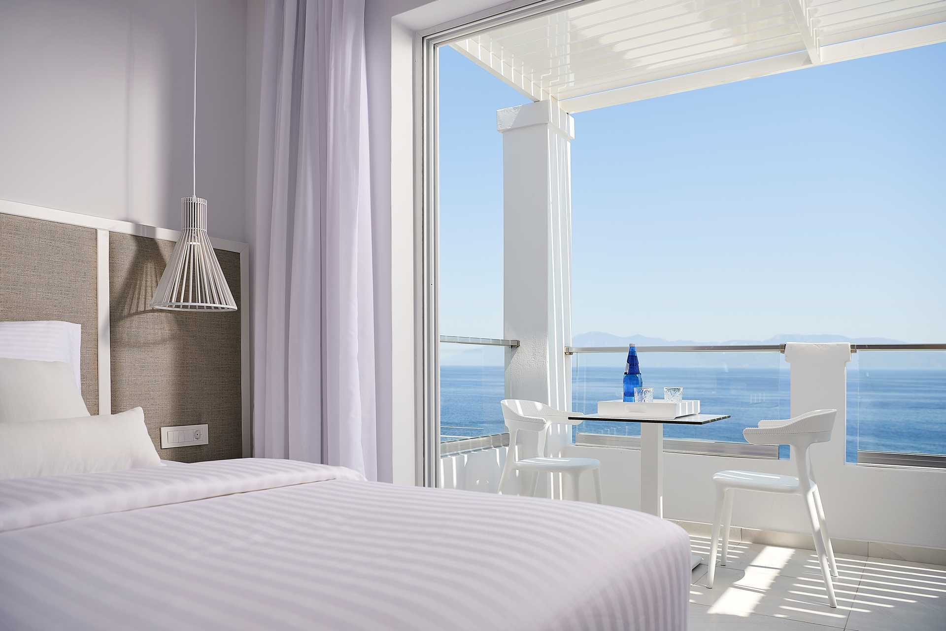 Dubbelrum med balkong och havsutsikt. Rummen ligger i hotellets huvudbyggnad eller på andra våningen i bungalower. En dubbelsäng eller två enkelsängar. Wifi, luftkonditionering och deponering ingår. Kylskåp. Vattenkokare samt kaffe och te. Tv med internationella kanaler. Hårtork. Badrockar och tofflor. Badrum med dusch och wc. Städning 7 ggr/vecka. Barn under två år räknas in i maxantalet personer i rummet.