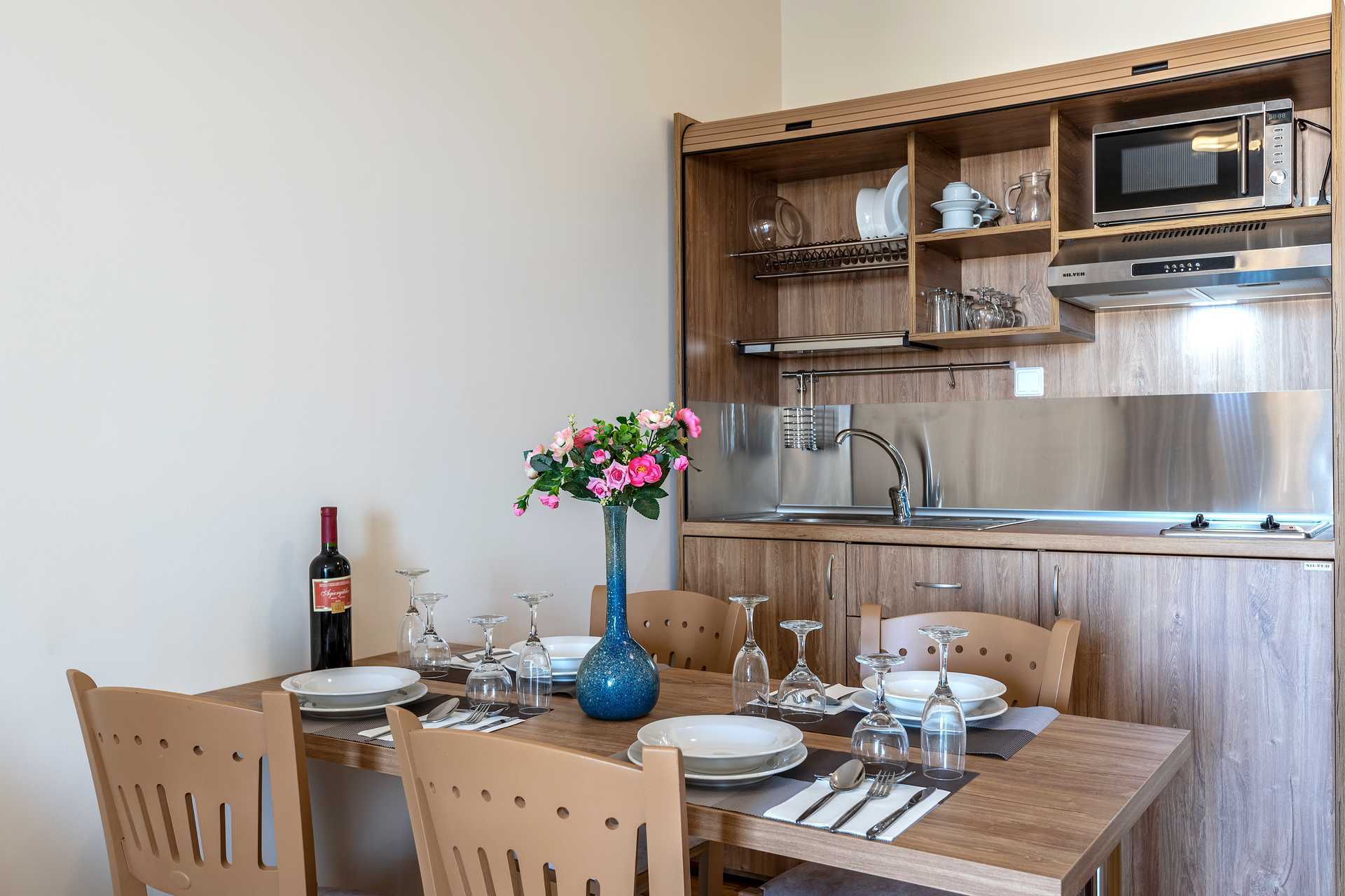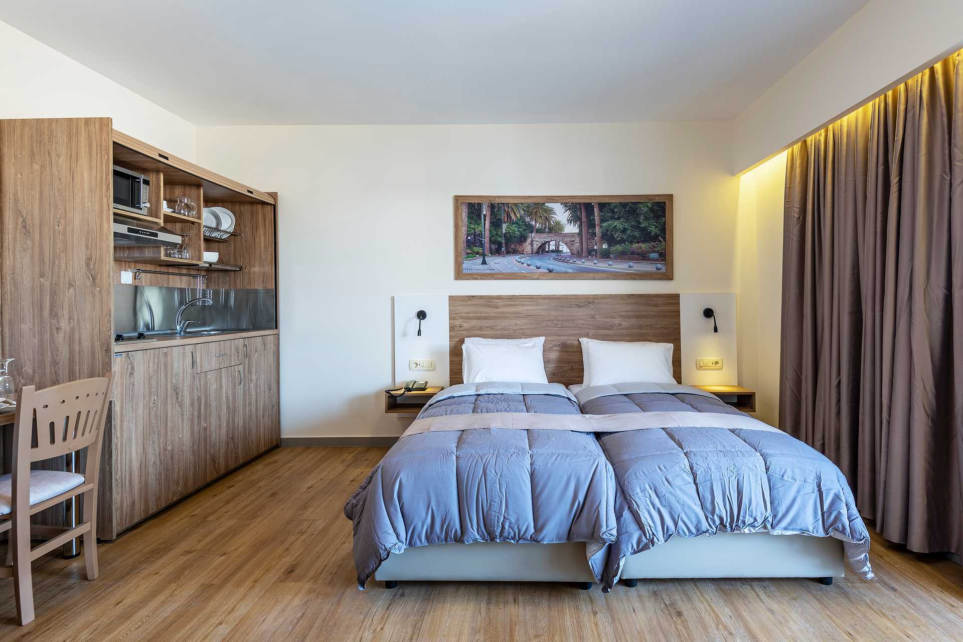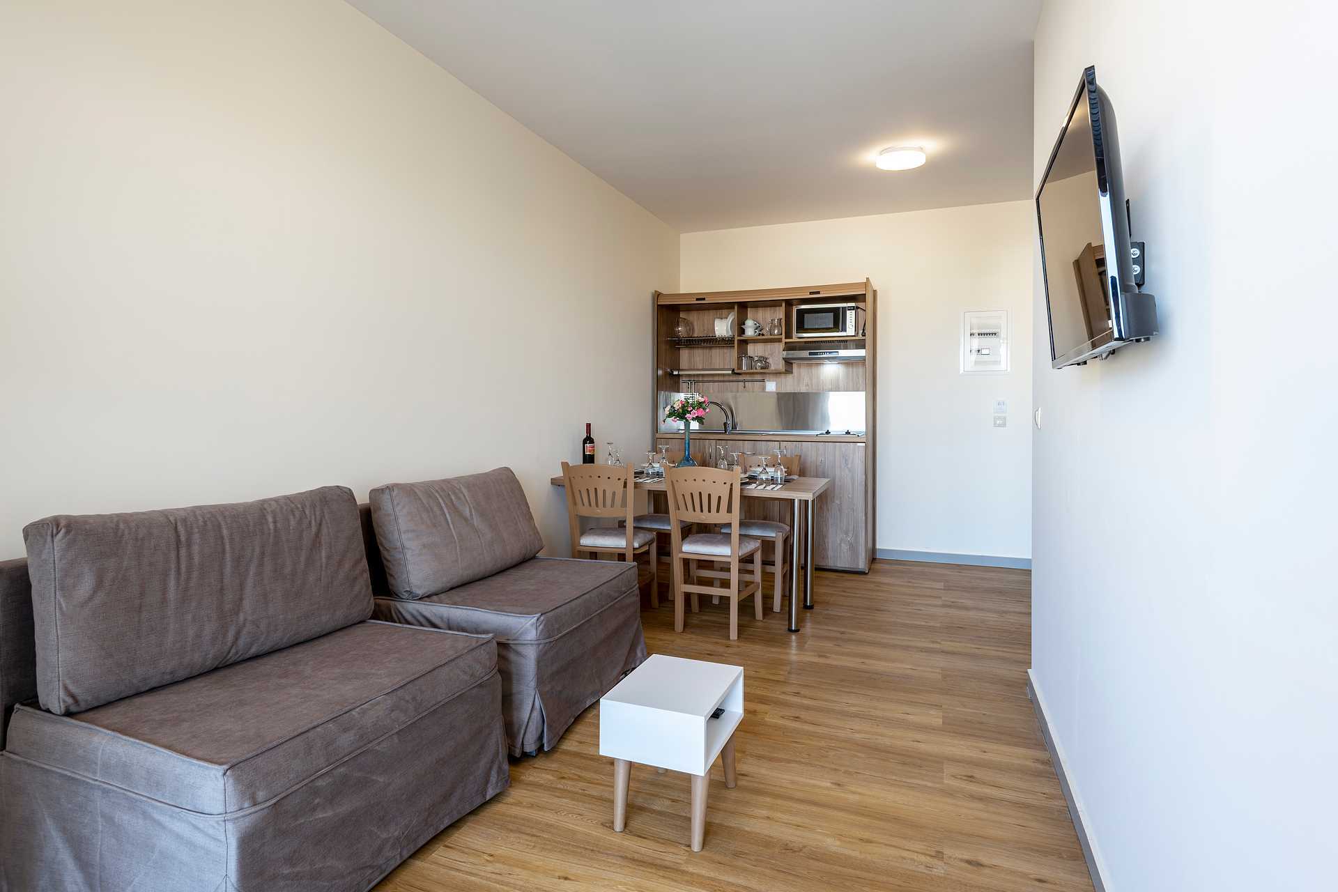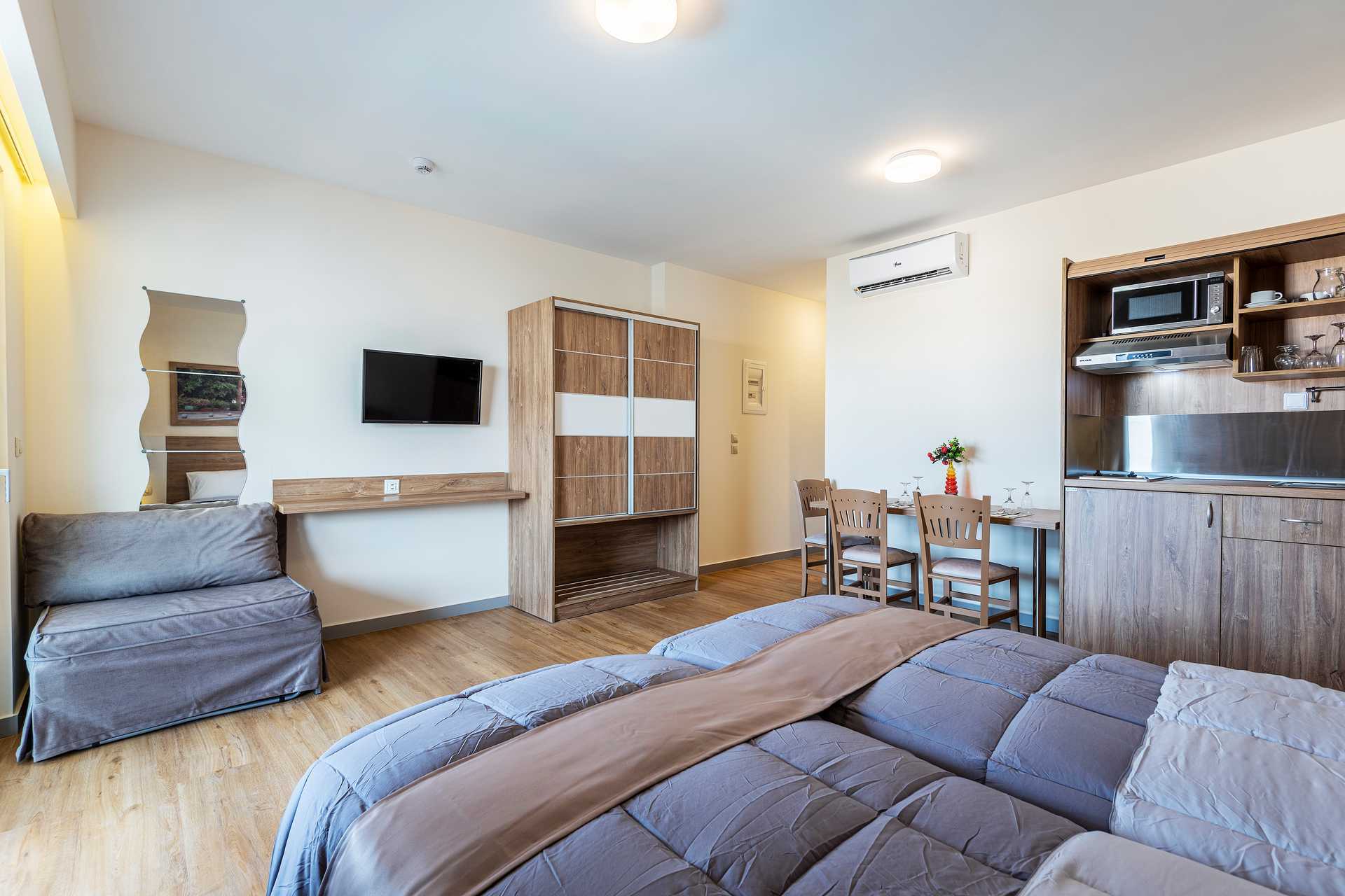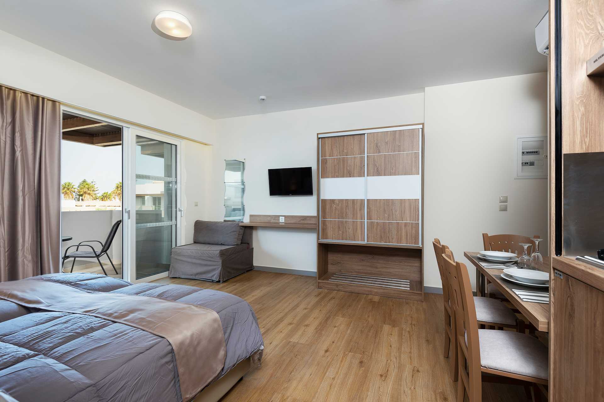 Enrumslägenhet med balkong, vissa med poolutsikt. Kombinerat sovrum med minikök. En dubbelsäng eller två enkelsängar. Möjlighet till extrabädd i bäddbar fåtölj. Minikök med kylskåp, kokplattor, mikrovågsugn, kaffebryggare och enkel köksutrustning. Wifi, luftkonditionering och deponering ingår. Hårtork. Badrum med dusch och wc. Städning 6 ggr/vecka.