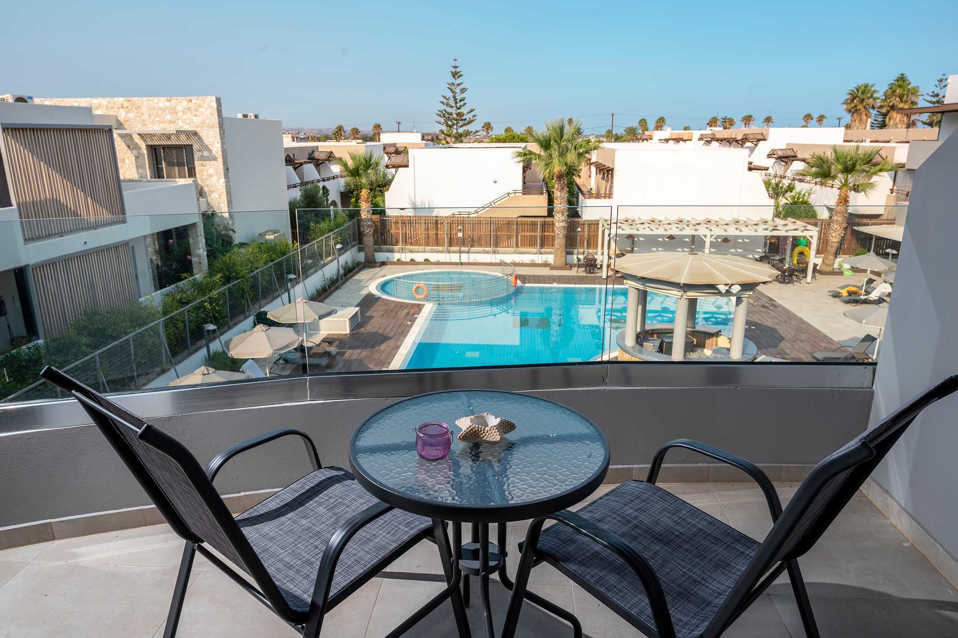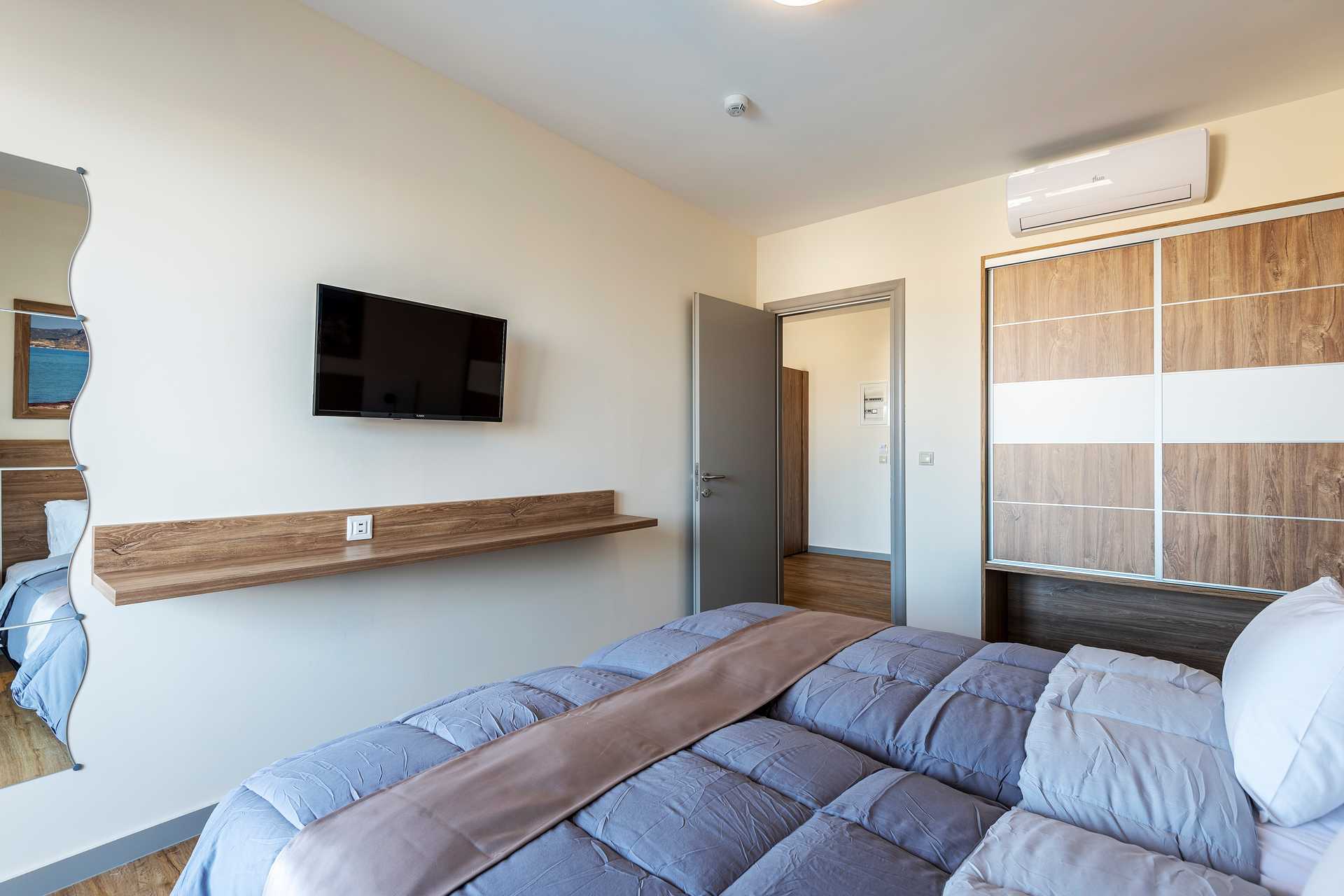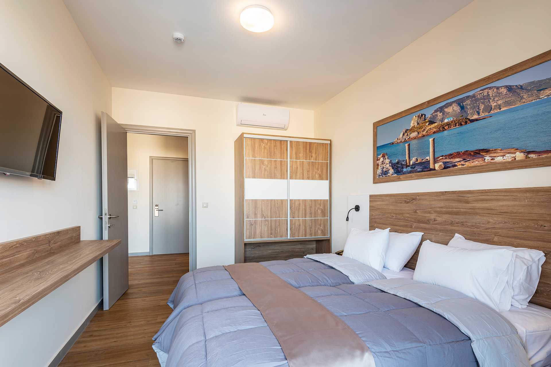 Tvårumslägenhet med balkong, vissa med poolutsikt. Ett sovrum och ett kombinerat vardagsrum med minikök. En dubbelsäng eller två enkelsängar. Möjlighet till extrabäddar i två bäddsoffor. Minikök med kylskåp, kokplattor, kaffebryggare, mikrovågsugn och enkel köksutrustning. Wifi, luftkonditionering och deponering ingår. Hårtork. Badrum med dusch och wc. Städning 6 ggr/vecka.