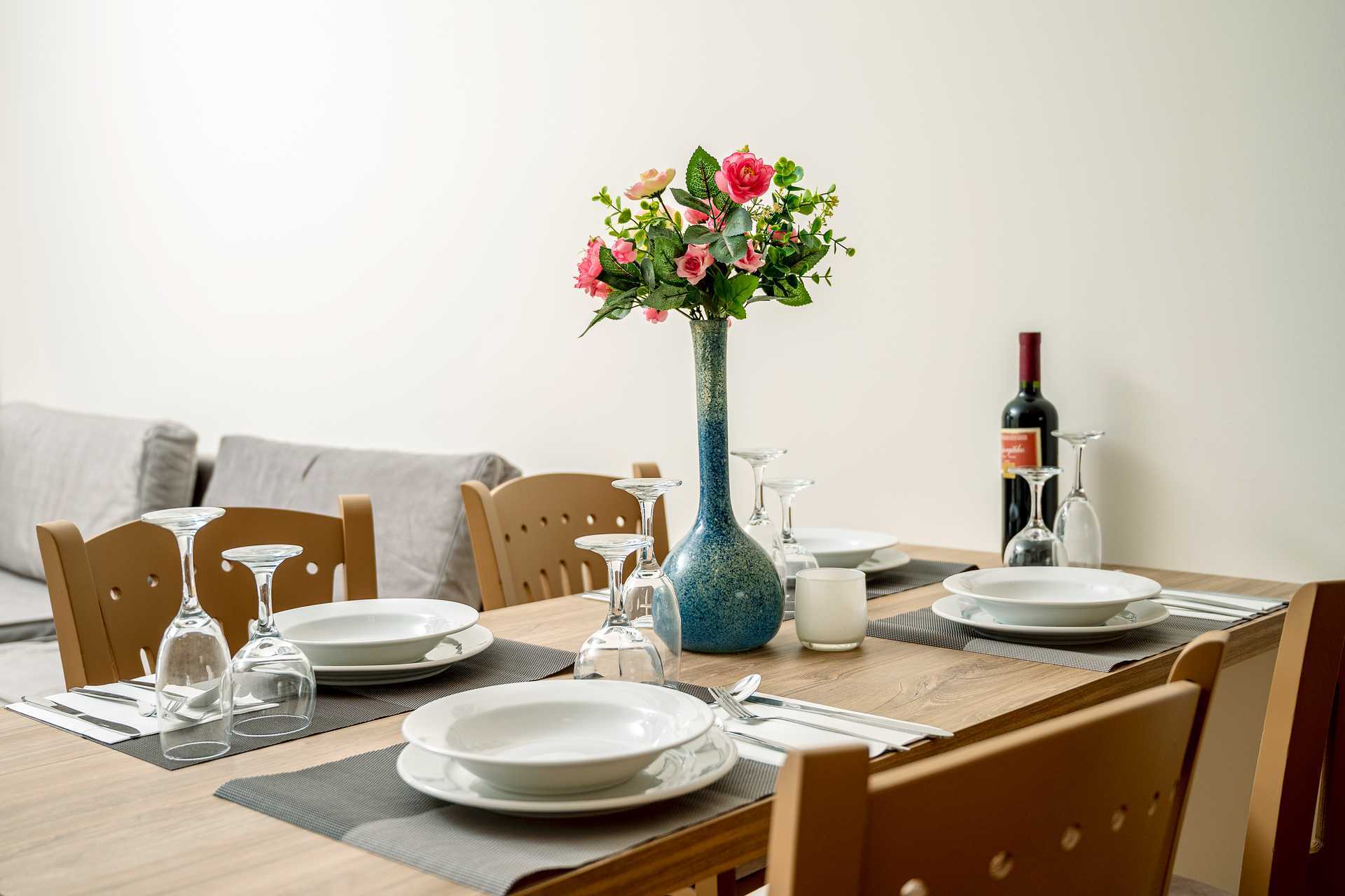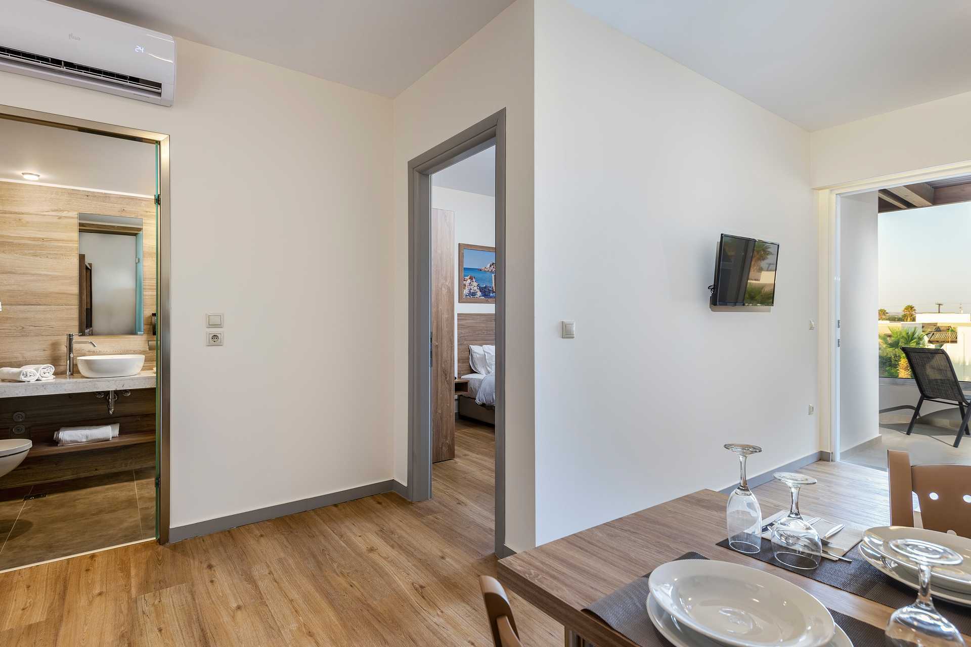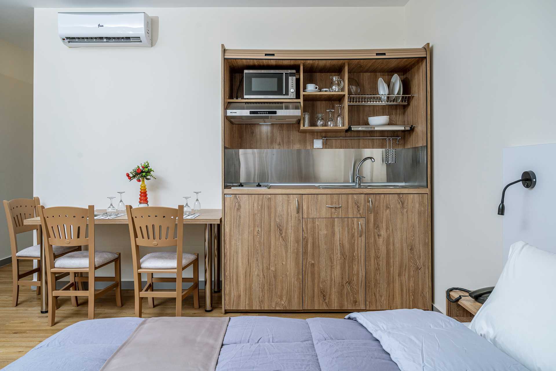 Tvårumslägenhet med balkong, vissa med poolutsikt. Ett sovrum och ett kombinerat vardagsrum med minikök. En dubbelsäng eller två enkelsängar. Möjlighet till extrabäddar i två bäddsoffor. Minikök med kylskåp, kokplattor, kaffebryggare, mikrovågsugn och enkel köksutrustning. Wifi, luftkonditionering och deponering ingår. Hårtork. Badrum med dusch och wc. Städning 6 ggr/vecka.