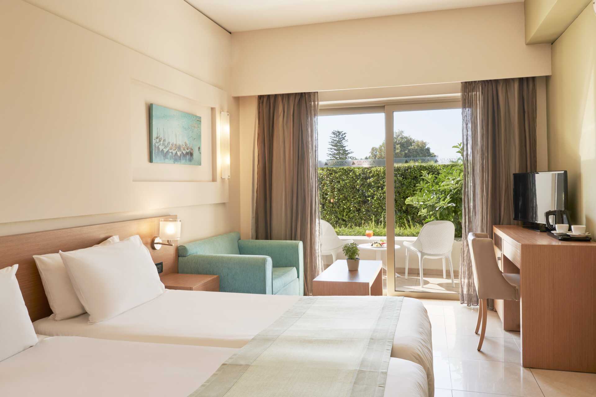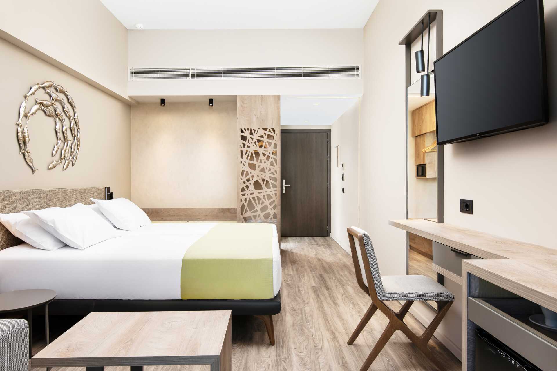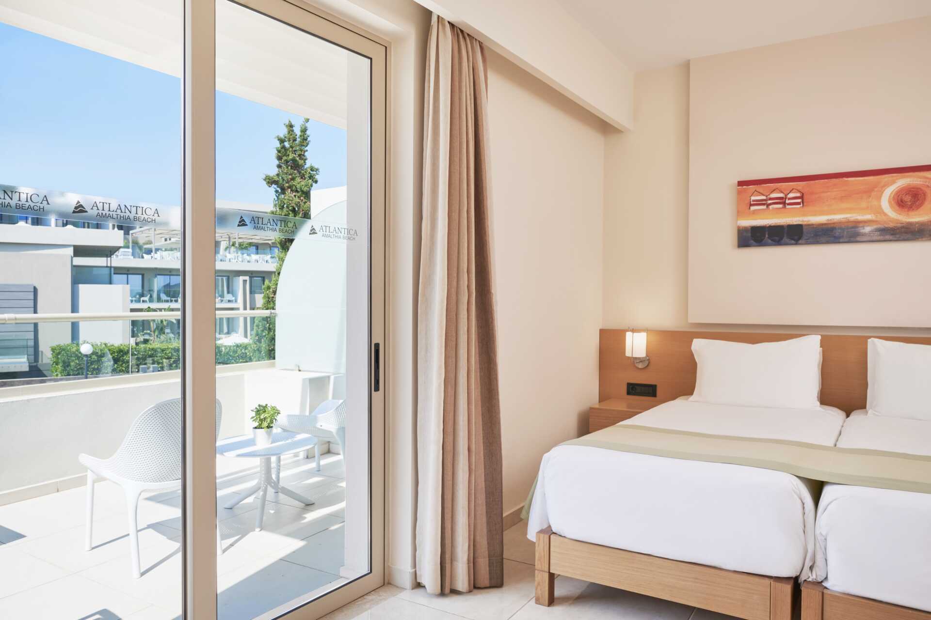 Superiorrum med balkong eller terrass. En dubbelsäng eller två enkelsängar. Wifi, luftkonditionering och deponering ingår. Kylskåp. Vattenkokare samt kaffe och te. Tv med internationella kanaler. Hårtork. Badrum med badkar och wc. Städning 7 ggr/vecka.