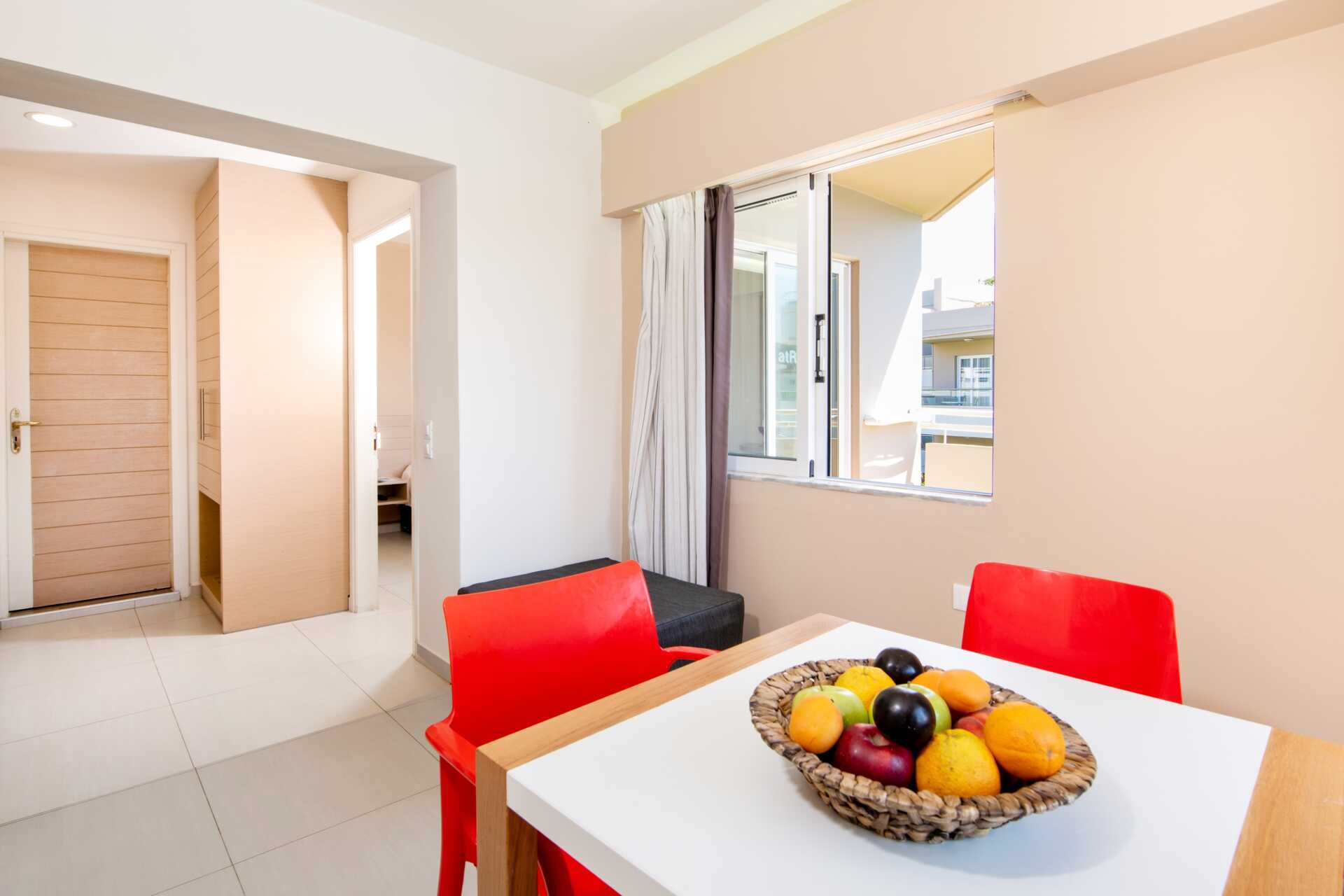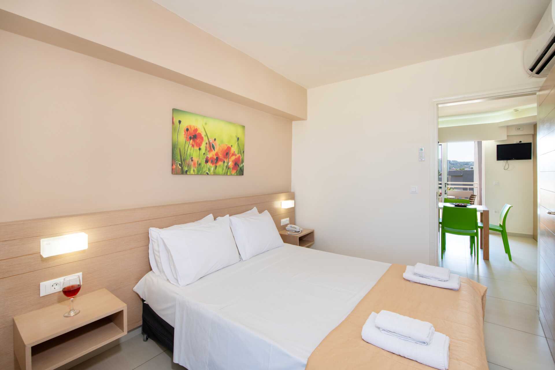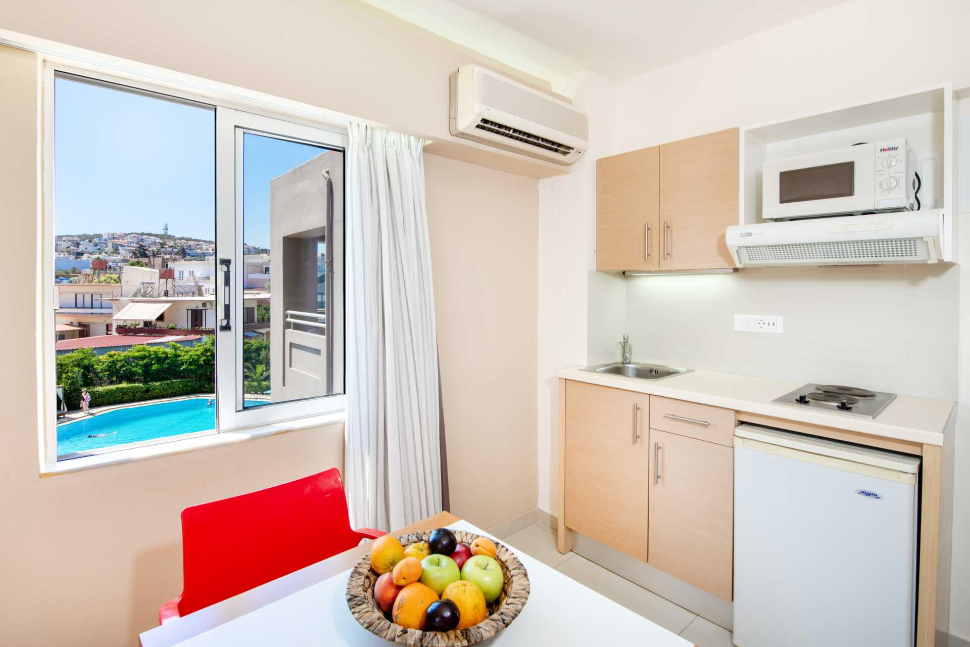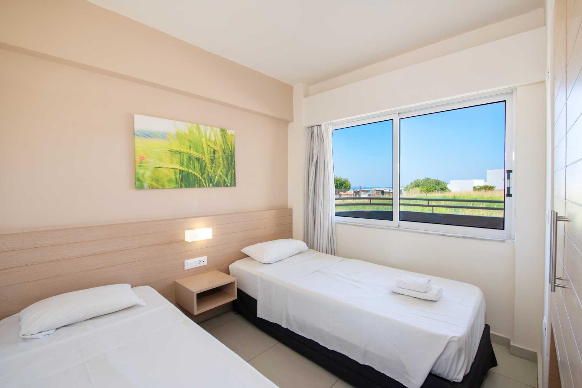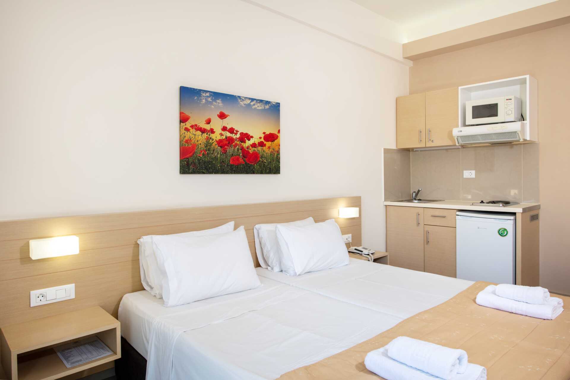 Tvårumslägenhet med balkong eller markbalkong, vissa med poolutsikt. Sovrum och kombinerat vardagsrum med minikök. En dubbelsäng eller två enkelsängar. Möjlighet med extrabäddar i bäddsoffa eller i enkelsängar. Minikök med kokplattor, vattenkokare, kaffebryggare, kylskåp, mikrovågsugn och enkel köksutrustning. Wifi, luftkonditionering och deponering ingår. Tv med internationella kanaler. Hårtork. Badrum med dusch och wc. Städning 6 ggr/vecka.