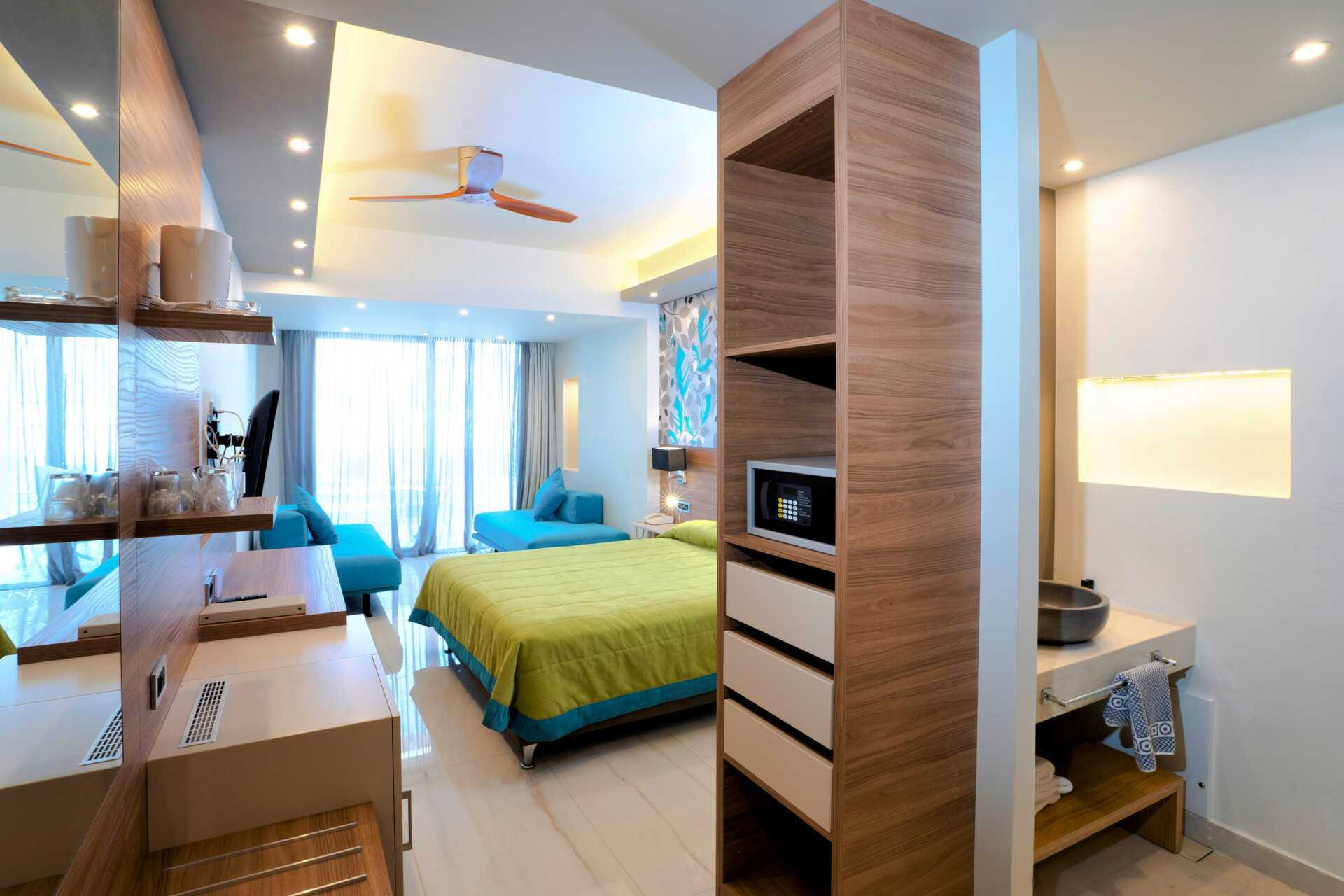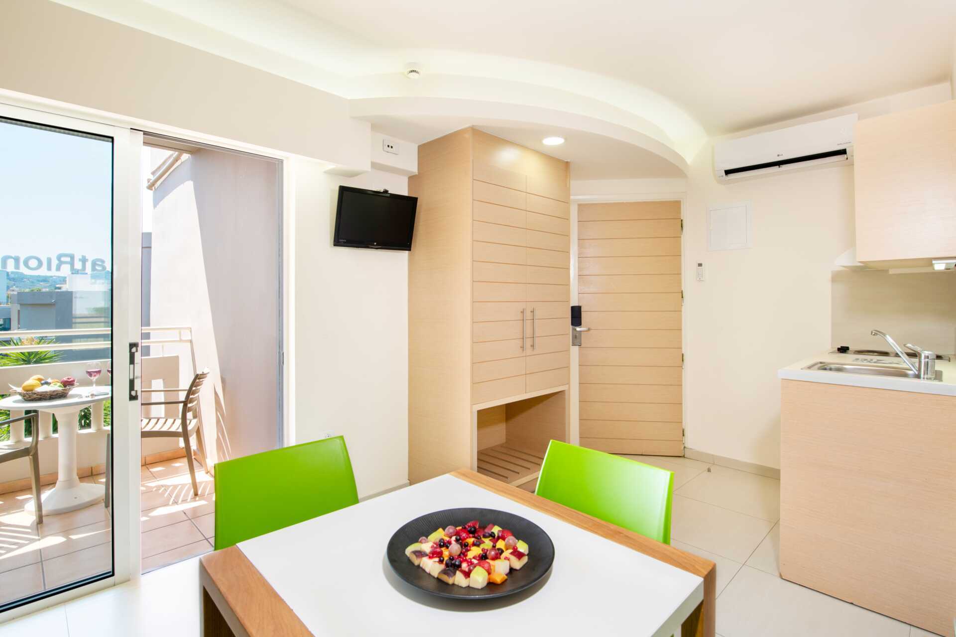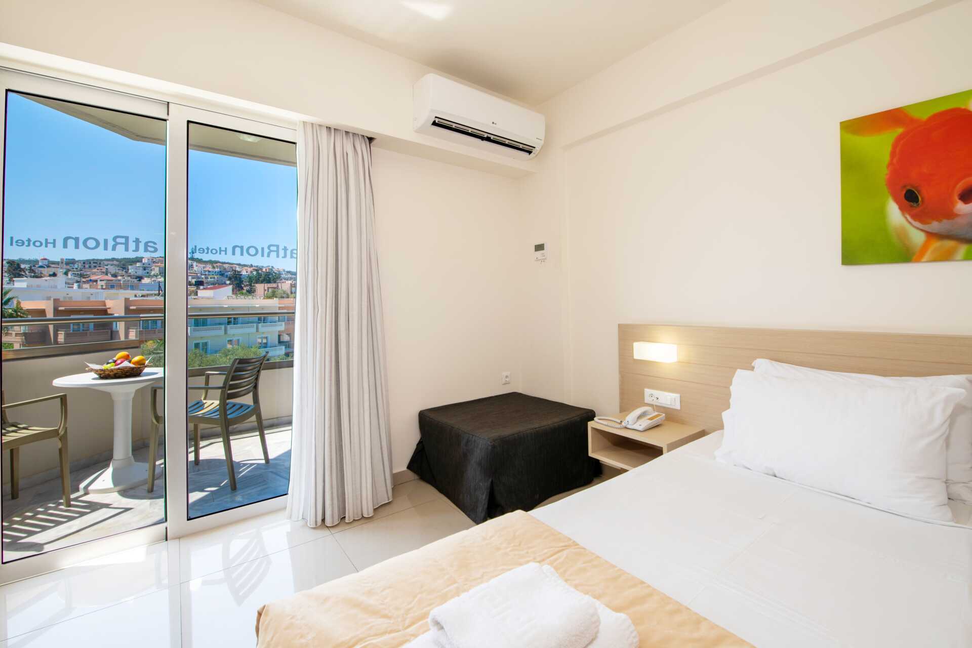 Superiorrum med balkong eller terrass. En dubbelsäng. Möjlighet till en extrabädd i bäddsoffa. Wifi, luftkonditionering och deponering ingår. Kylskåp. Nespressomaskin, kapslar ingår och fylls på under veckan. Tv med internationella kanaler. Tofflor. Hårtork. Badrum med dusch och wc. Städning 6 ggr/vecka.