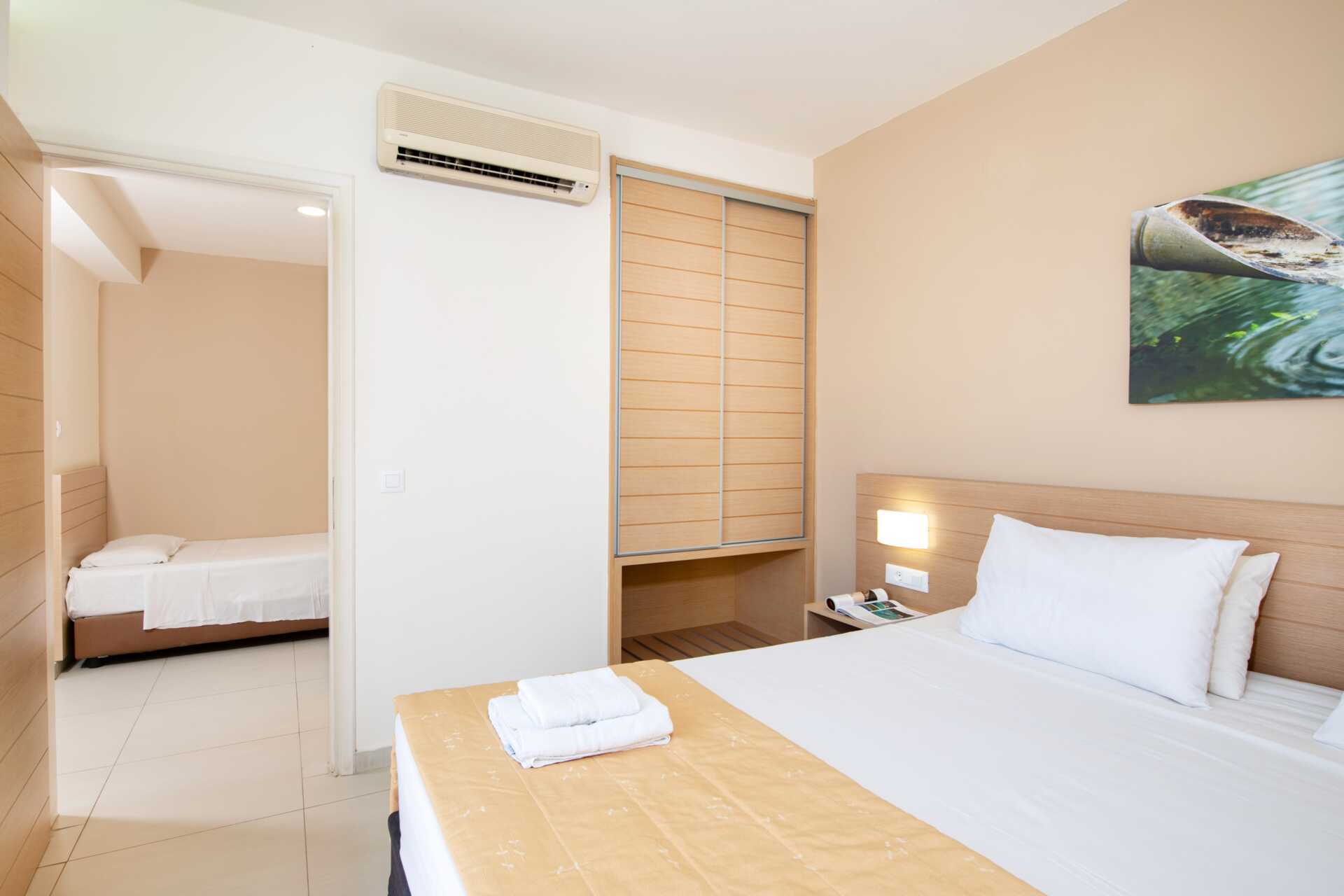 Trerumslägenhet med balkong eller markbalkong, vissa balkonger med poolutsikt. Två sovrum och ett kombinerat vardagsrum/minikök. I några trerumslägenheter är det ena sovrummet litet. En dubbelsäng eller två enkelsängar i varje sovrum. Möjlighet till extrabäddar i bäddsoffa eller i enkelsängar. Om alla extrabäddar används blir det trångt i lägenheten. Minikök med kokplattor, vattenkokare, kylskåp, mikrovågsugn, kaffebryggare och enkel köksutrustning. Wifi, luftkonditionering och deponering ingår. Tv med internationella kanaler. Hårtork. Badrum med dusch och wc. Städning 6 ggr/vecka.