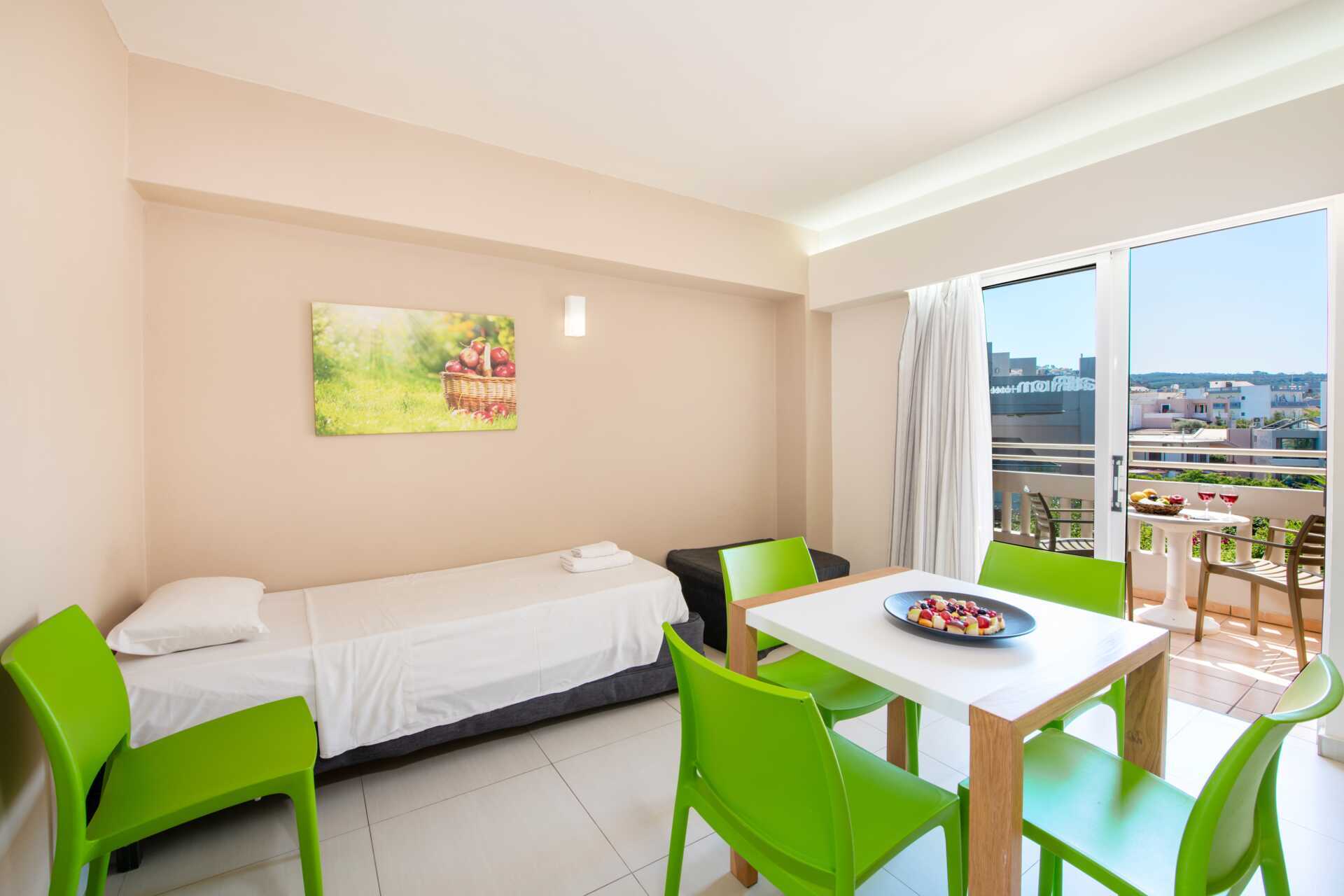 Enrumslägenhet i varierande storlek. Balkong eller markterrass. Nästan alla lägenheter, undantaget några lägenheter med markterrass, är renoverade. Flera trappsteg för att komma fram till vissa lägenheten. Vissa lägenheter med markterrass har några trappsteg upp till uteplatsen. Sovrum kombinerat med minikök. Två enkelsängar. Möjlighet till extrabädd i enkelsäng. Minikök med kokplattor, mikrovågsugn, vattenkokare, kaffebryggare, kylskåp och enkel köksutrustning. Wifi, luftkonditionering och deponering ingår. Tv med internationella kanaler. Hårtork. Badrum med dusch och wc. Städning 6 ggr/vecka.