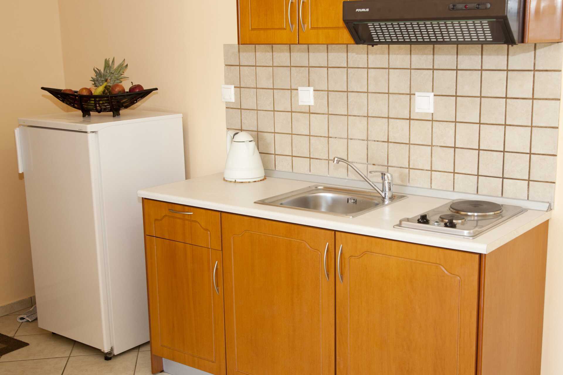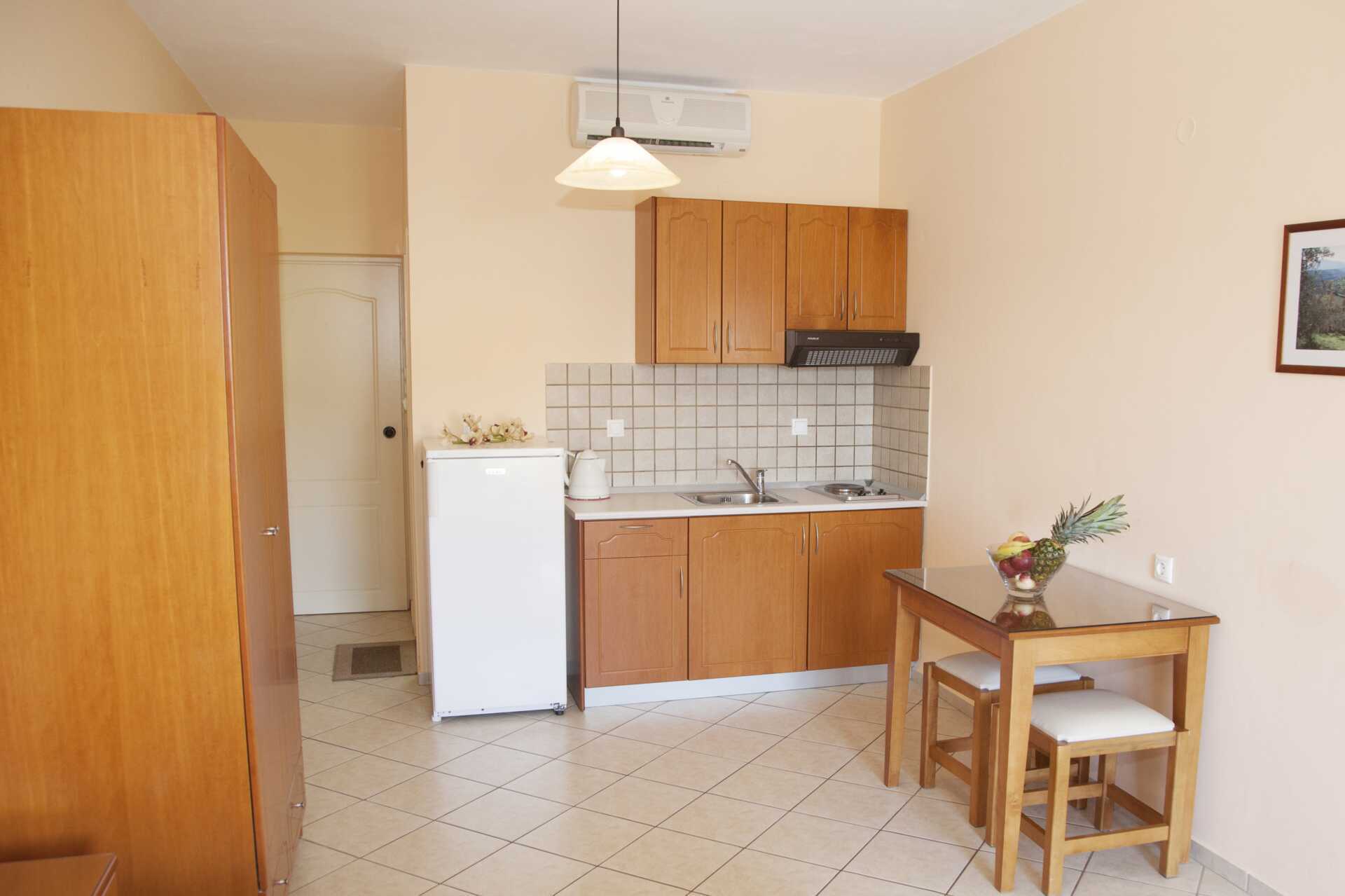 Enrumslägenhet med balkong eller markterrass. Sovrum kombinerat med minikök. En dubbelsäng eller två enkelsängar. Minikök med kokplattor, kylskåp med frysfack, kaffepress, vattenkokare och enkel köksutrustning. Wifi och luftkonditionering ingår. Deponering mot avgift. Hårtork. Badrum med dusch och wc. Städning 6 ggr/vecka.