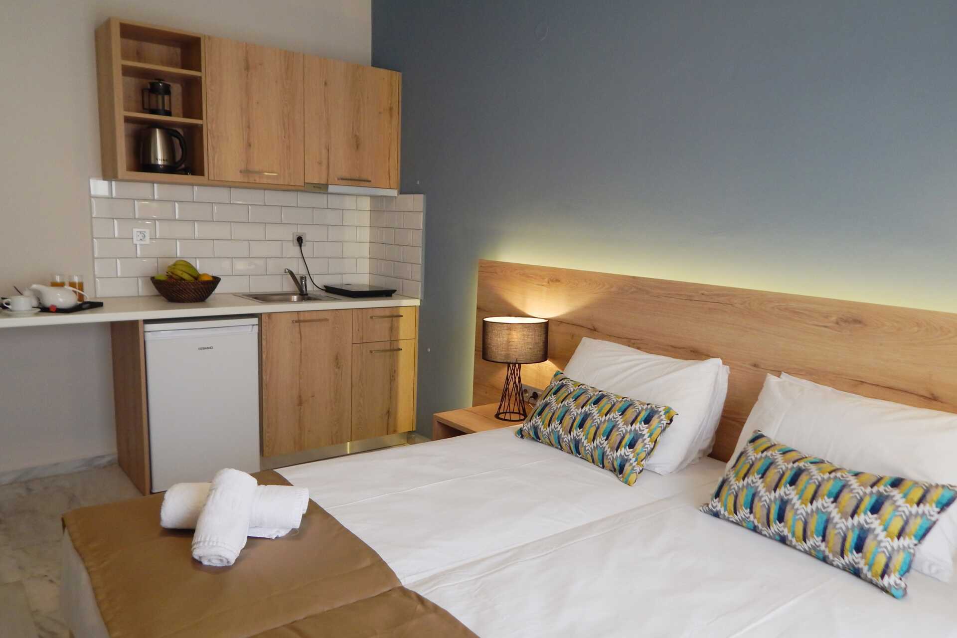 Enrumslägenhet superior med balkong. Sovrum kombinerat med minikök. Enrumslägenheterna superior renoverades 2021. En dubbelsäng eller två enkelsängar. Möjlighet till extrabädd. Minikök med kokplattor, kylskåp med frysfack, vattenkokare, kaffepress och enkel köksutrusting. Wifi och luftkonditionering ingår. Deponering mot avgift. Hårtork. Badrum med dusch och wc. Städing 6 ggr/vecka.