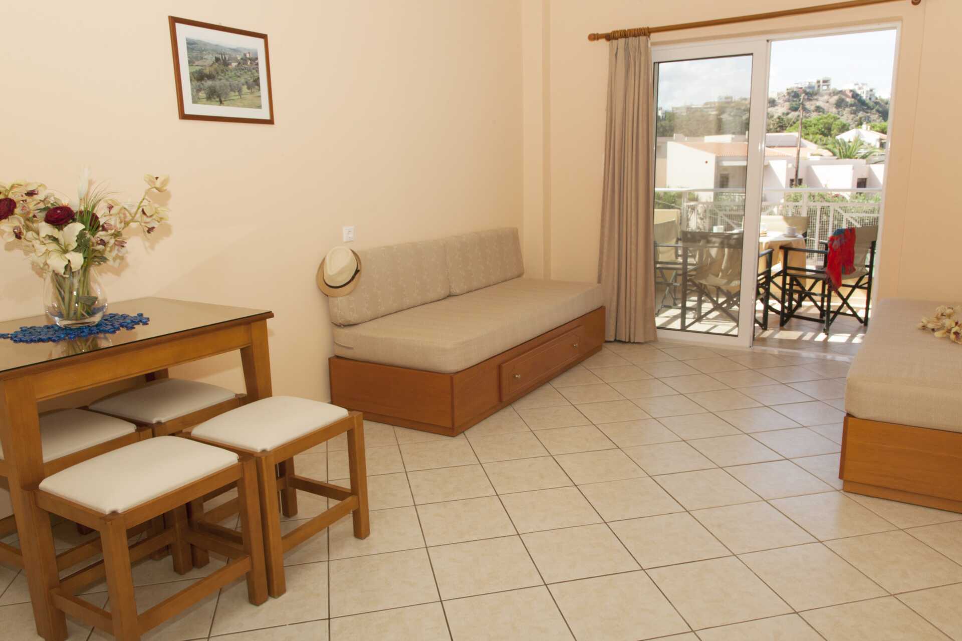 Tvårumslägenhet superior med balkong eller markterrass, vissa balkonger mot poolområdet. Lägenheterna med balkong renoverades 2023 och lägenheterna med markterrass renoverades 2021. Sovrum och kombinerat vardagsrum med minikök. En dubbelsäng eller två enkelsängar. Möjlighet till extrabäddar bäddsoffa. Minikök med kokplattor, kylskåp med frysfack, vattenkokare, kaffepress och enkel köksutrusting. Wifi och luftkonditionering ingår. Deponering mot avgift. Hårtork. Badrum med dusch och wc. Städning 6 ggr/vecka.
