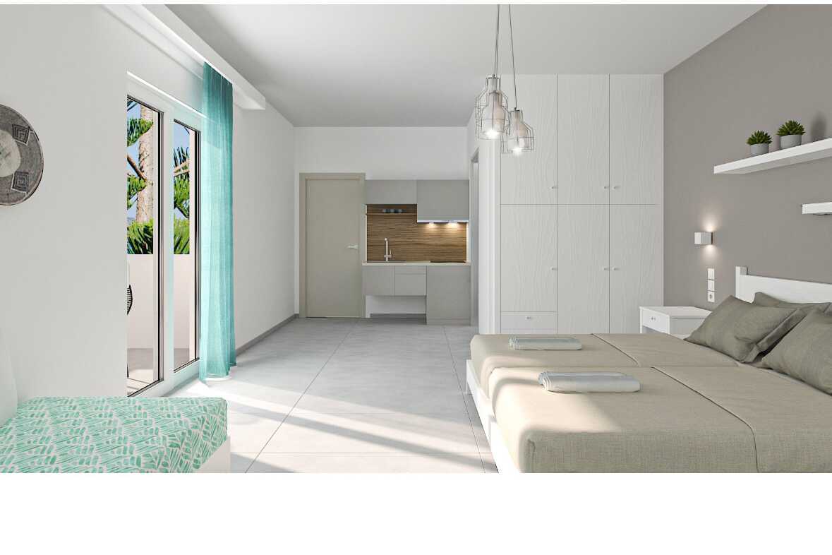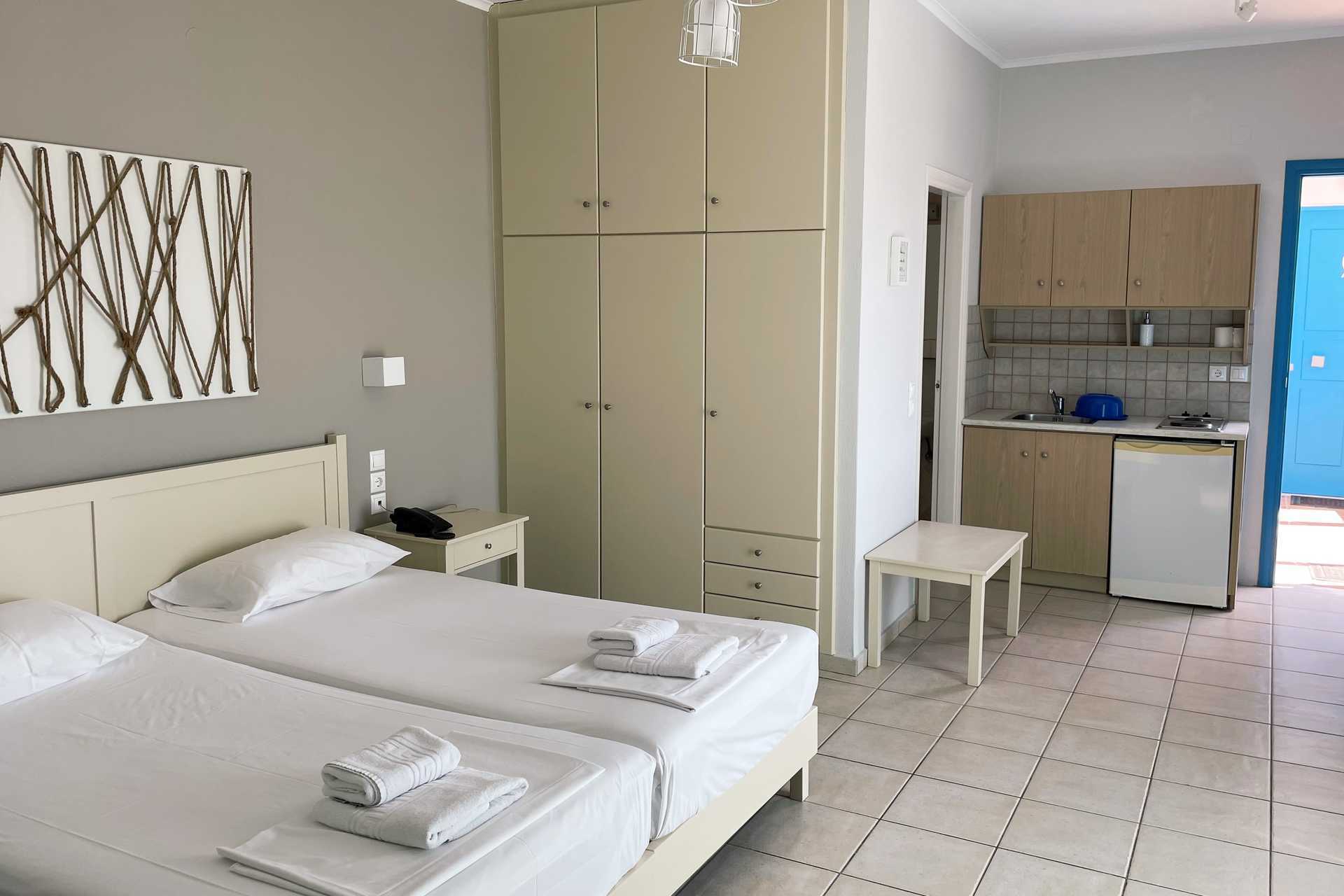 Enrumslägenhet superior med balkong eller terrass. Lägenheterna renoverades till sommaren 2023. Kombinerat sovrum med minikök. Två enkelsängar. Möjlighet till extrabädd i bäddsoffa eller i hopfällbar säng. Minikök med kokplattor, kylskåp, brödrost, kaffebryggare och enkel köksutrustning. Wifi, luftkonditionering och deponering ingår. Tv med lokala kanaler. Hårtork. Badrum med dusch och wc. Städning 6 ggr/vecka.