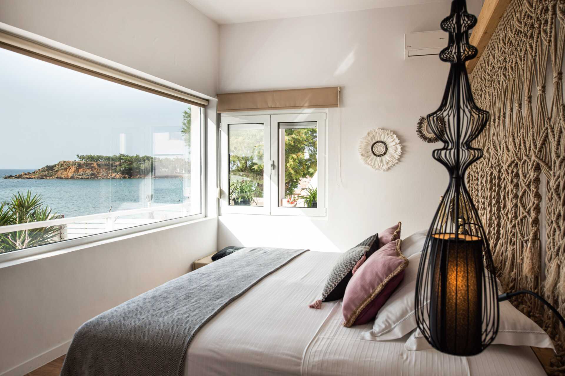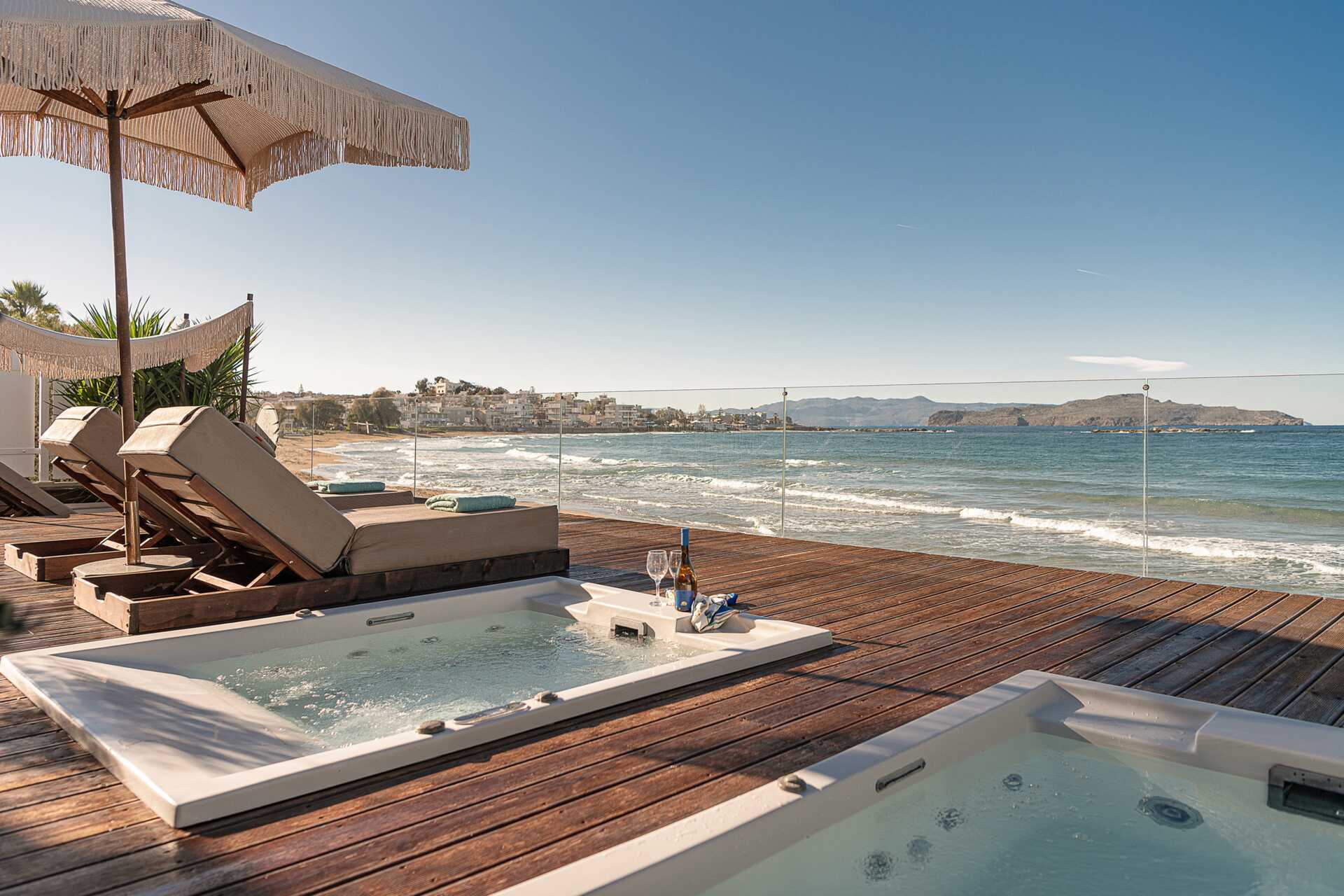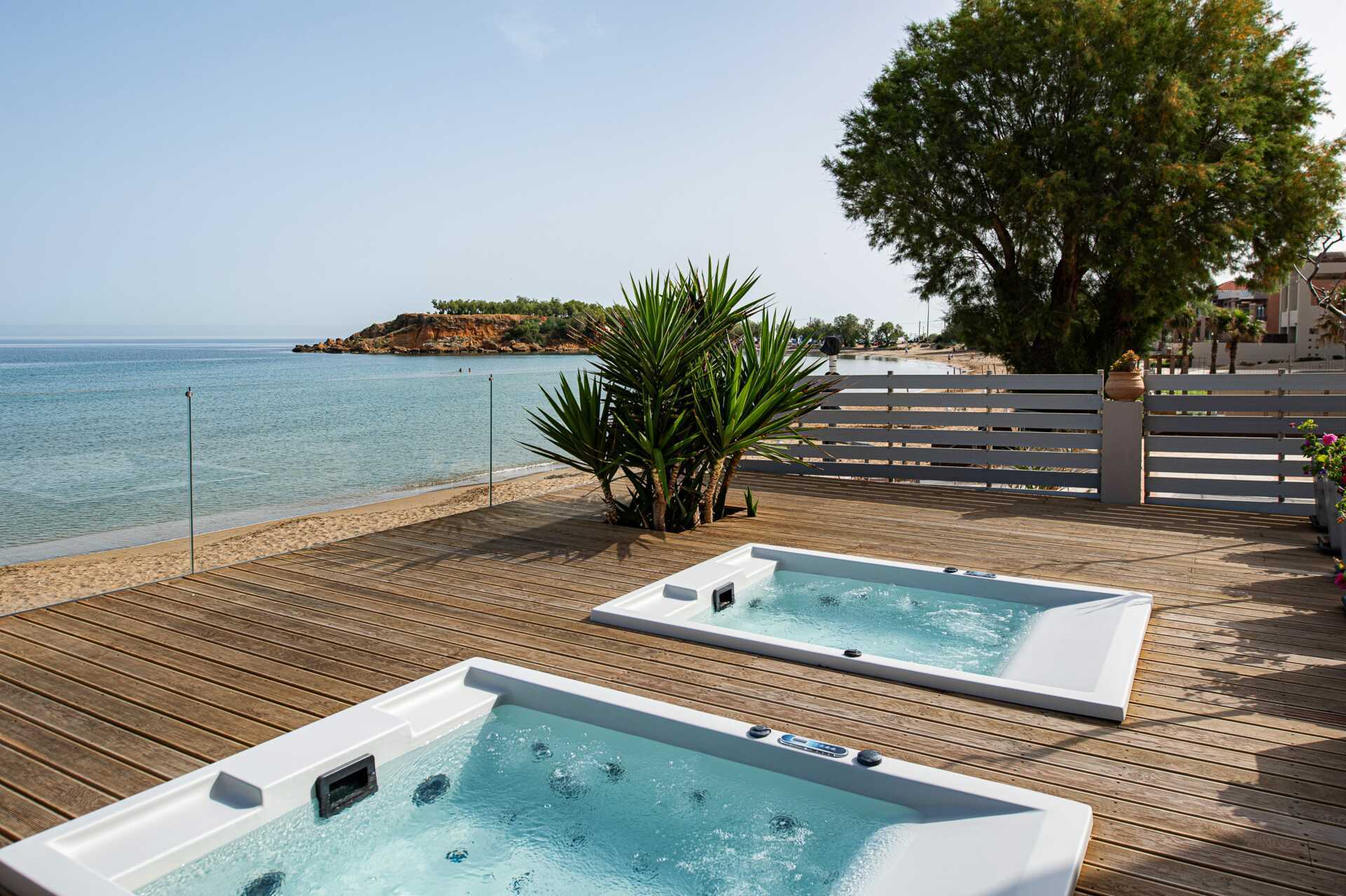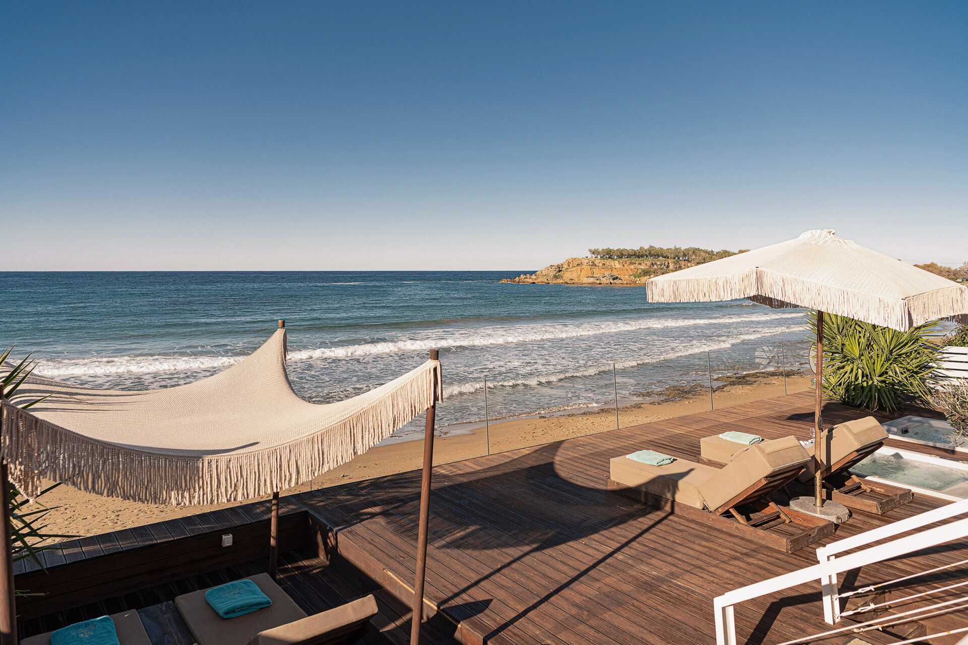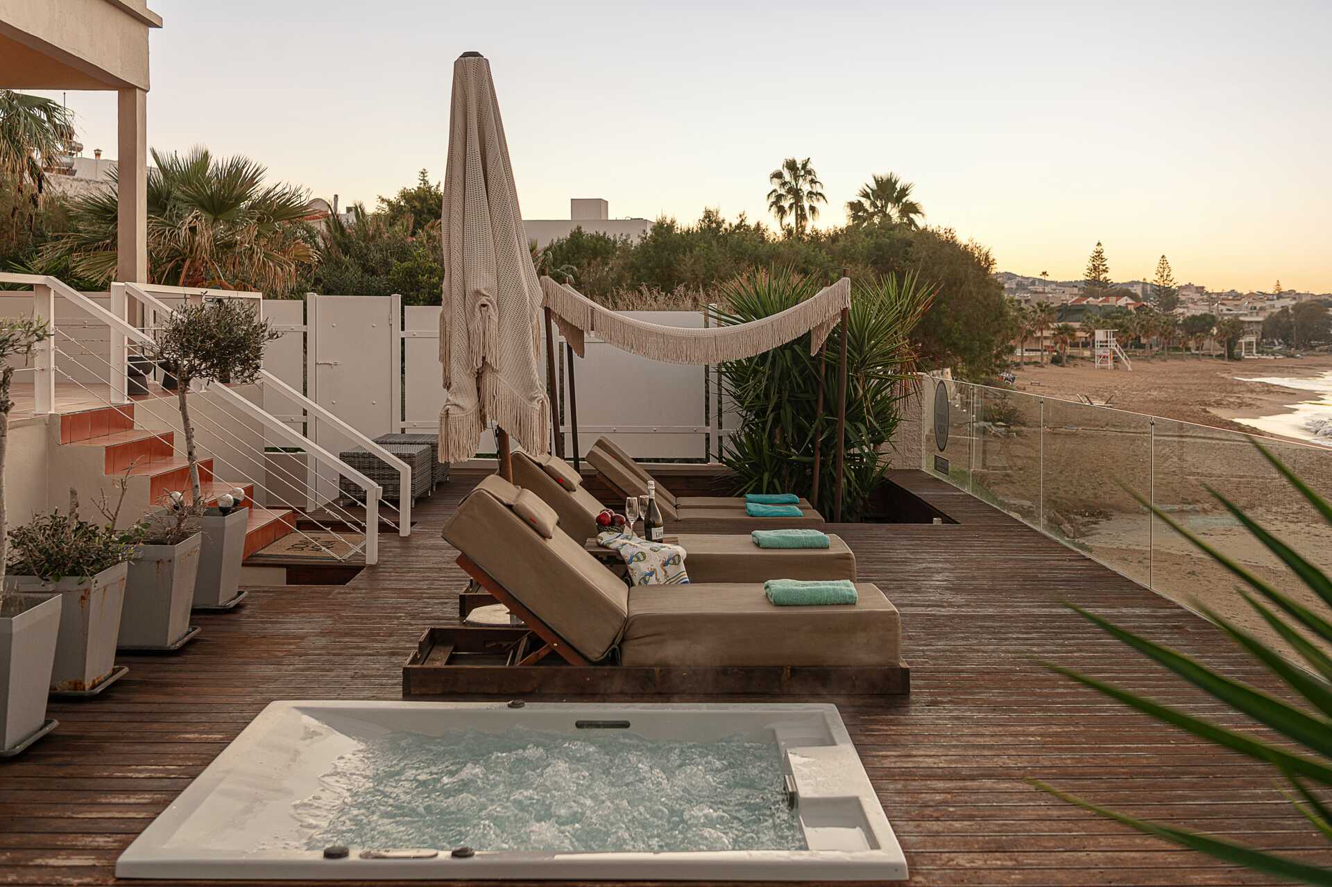 Fyrarumsvilla med markterrass och havsutsikt. På terrassen finns två jacuzzipooler, solstolar och parasoller och en matplats med plats för många. I trädgården finns gräsmattor med matbord och en utedusch. Tre sovrum, fyra badrum och ett kombinerat kök/vardagsrum.