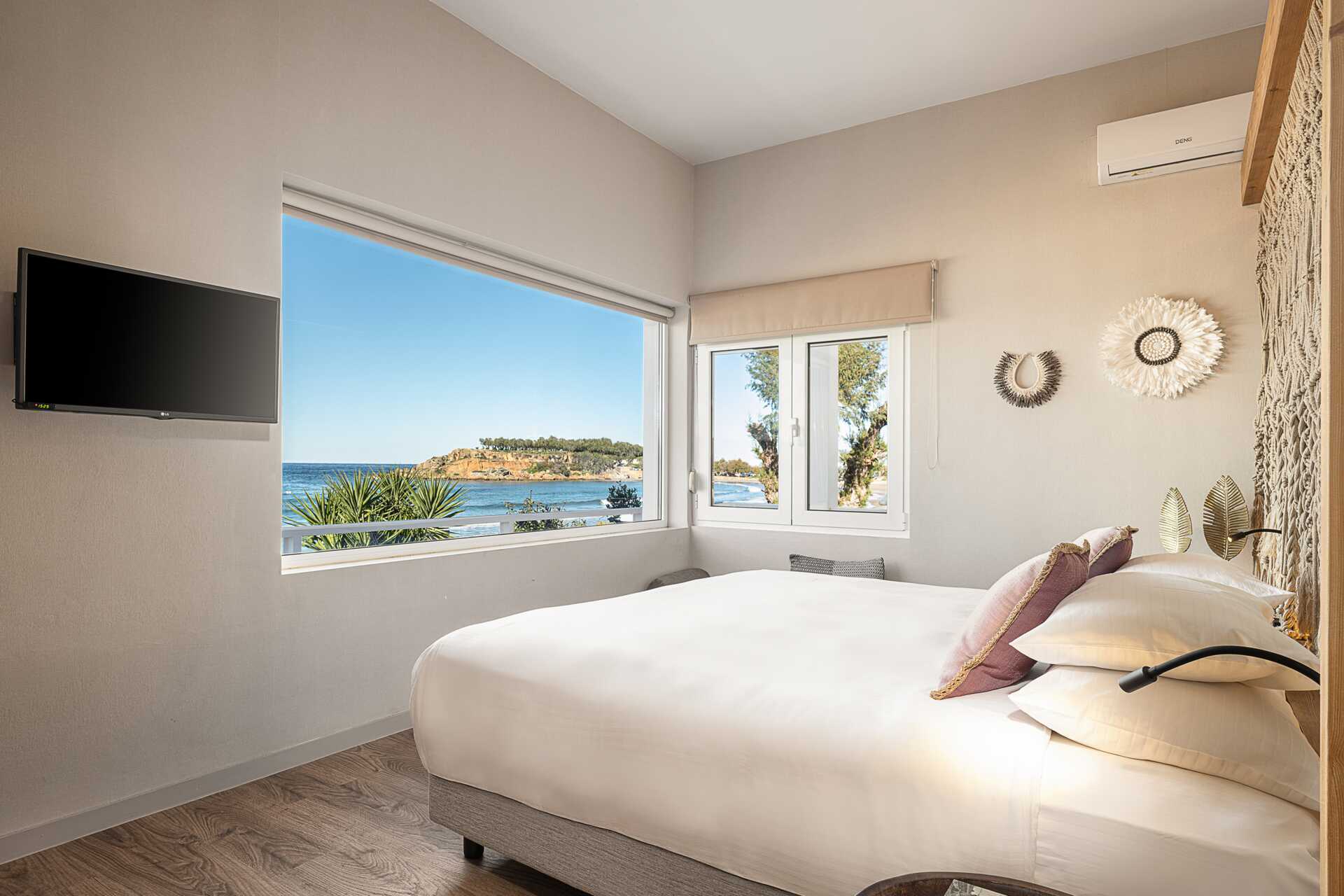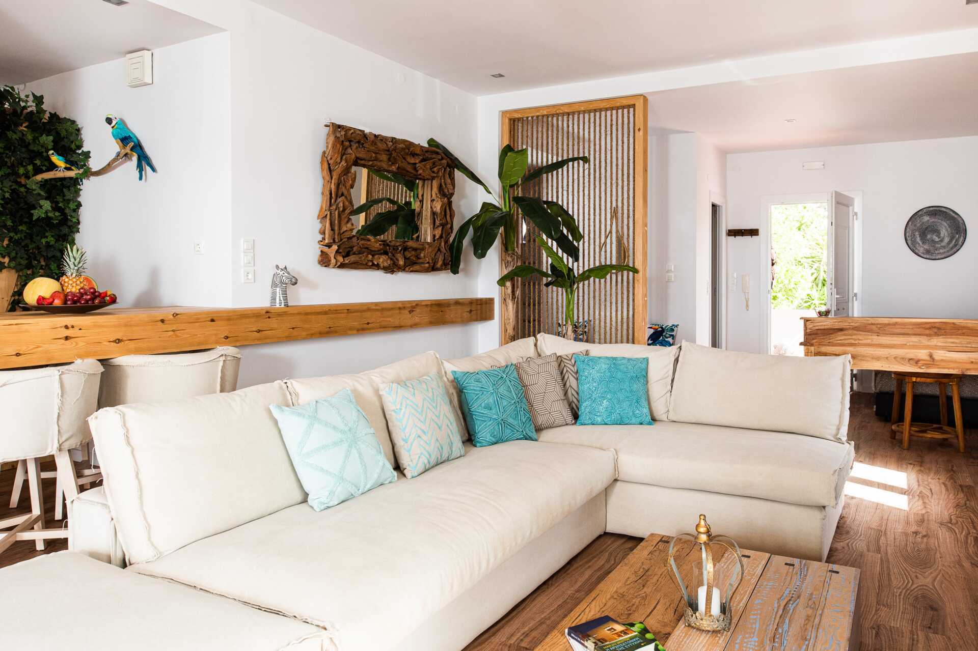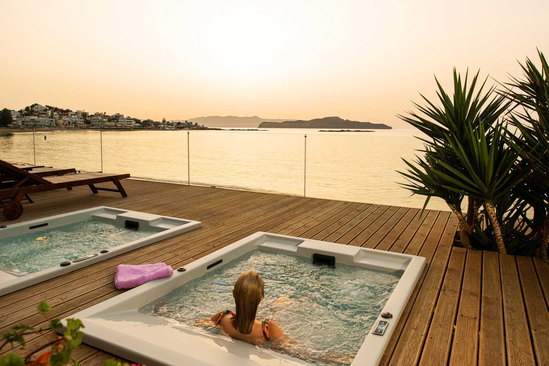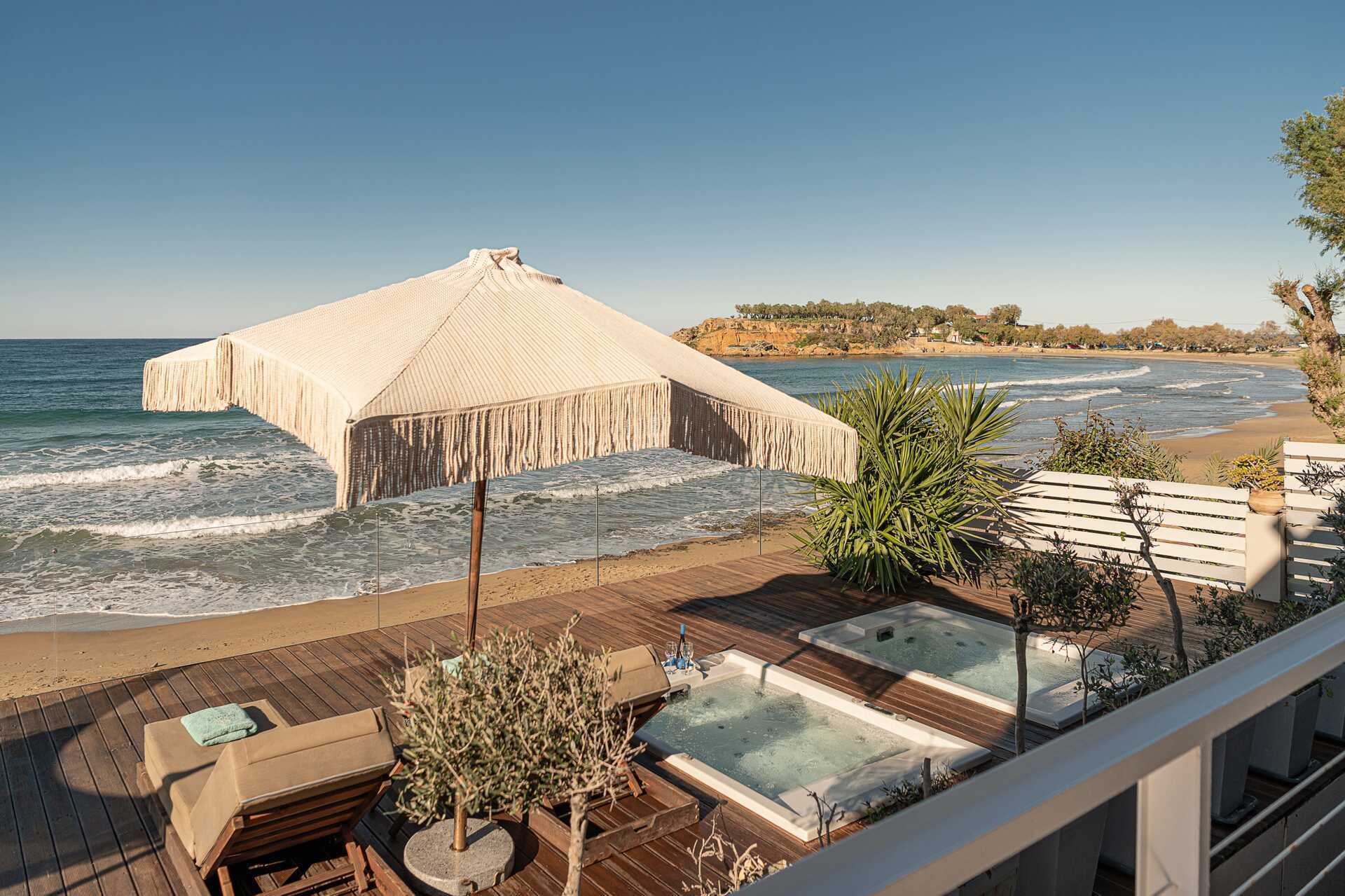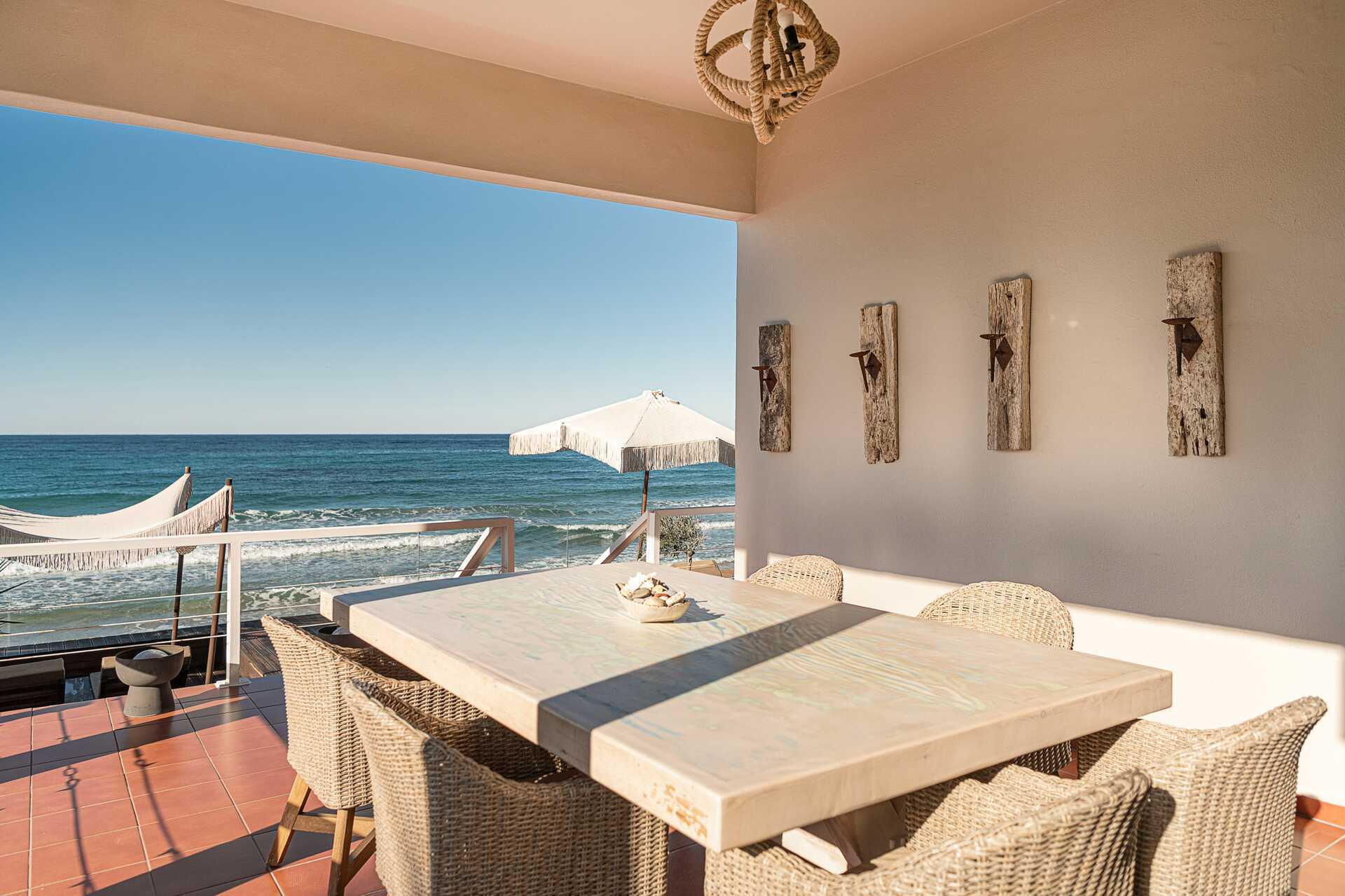 Fyrarumsvilla med markterrass och havsutsikt. På terrassen finns två jacuzzipooler, solstolar och parasoller och en matplats med plats för många. I trädgården finns gräsmattor med matbord och en utedusch. Tre sovrum, fyra badrum och ett kombinerat kök/vardagsrum.