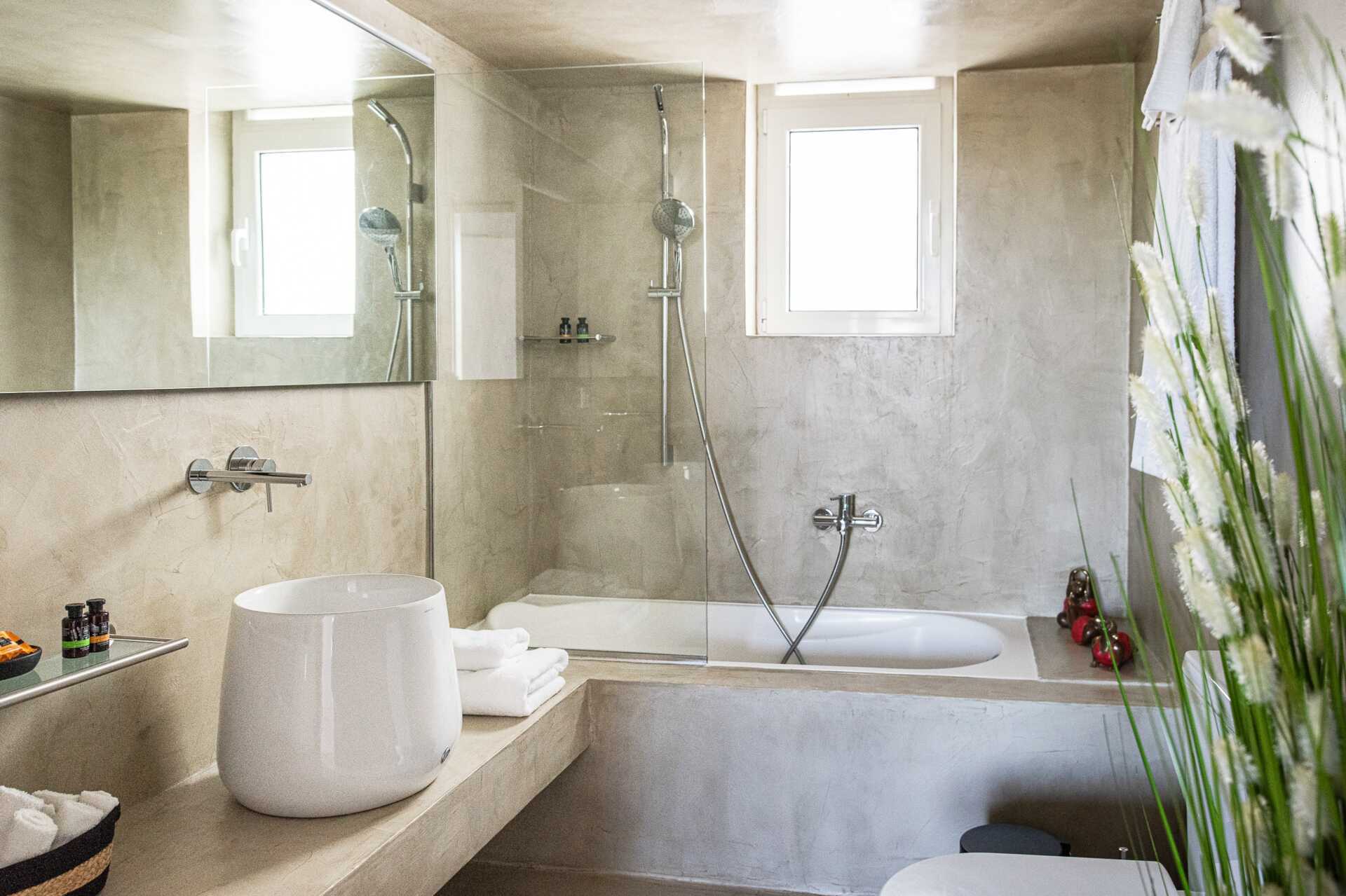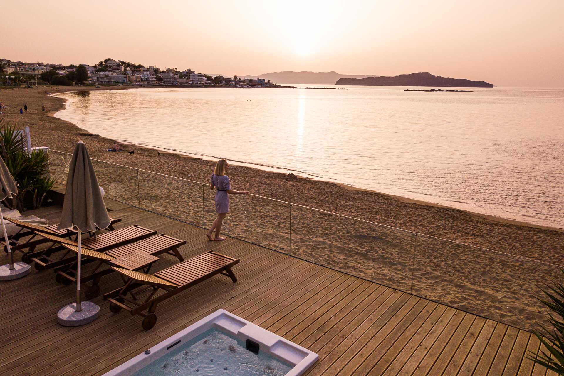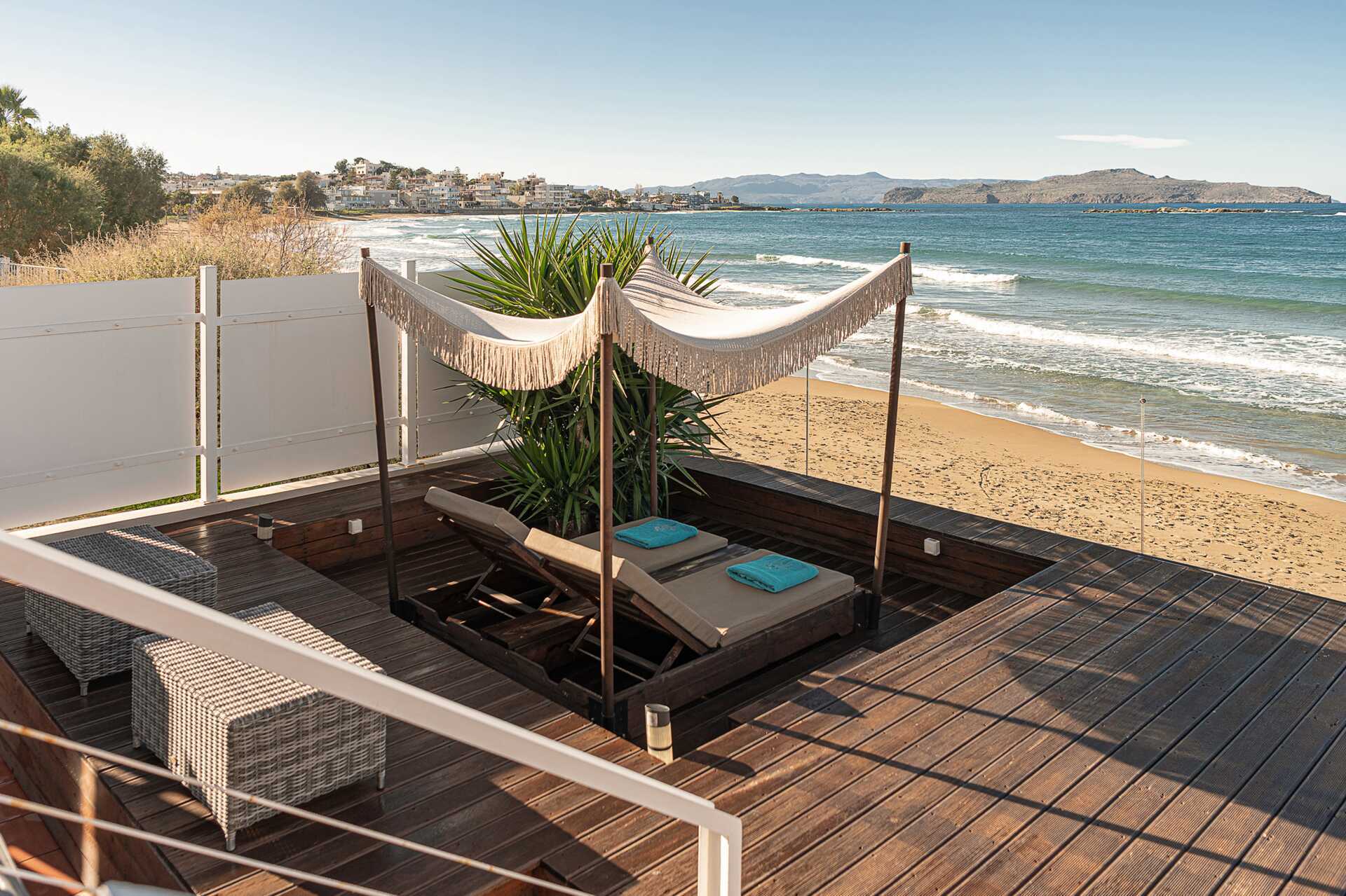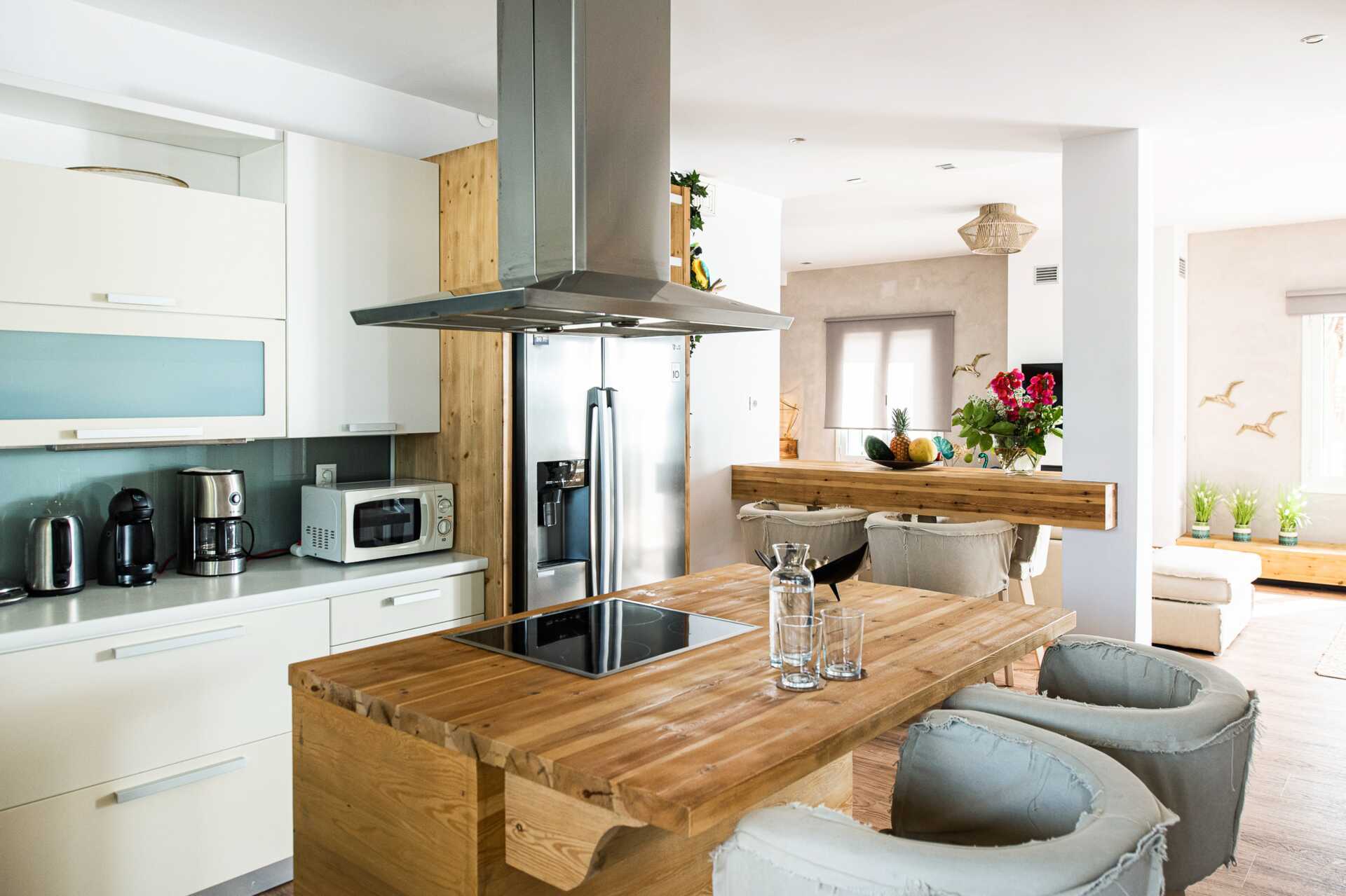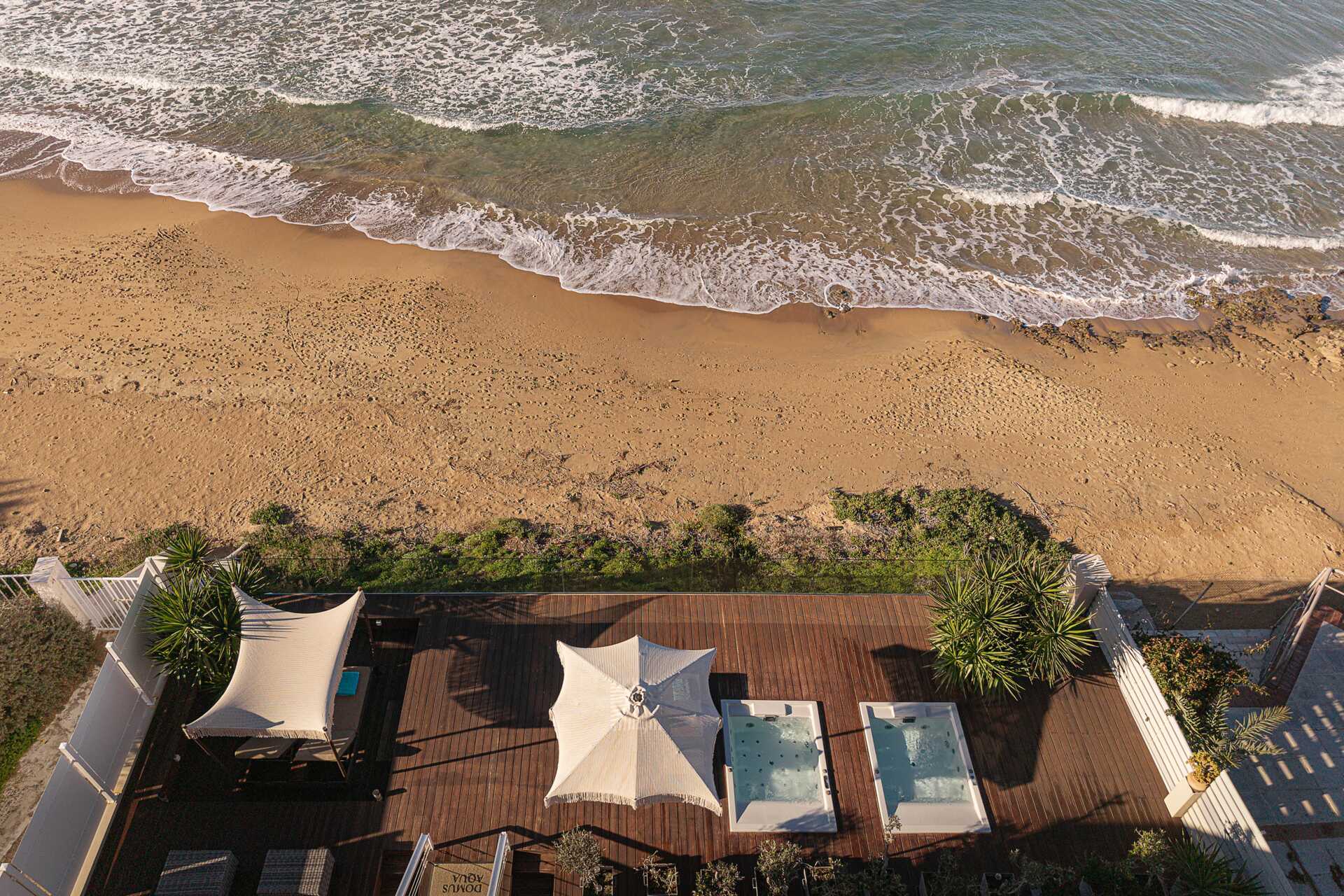 Fyrarumsvilla med markterrass och havsutsikt. På terrassen finns två jacuzzipooler, solstolar och parasoller och en matplats med plats för många. I trädgården finns gräsmattor med matbord och en utedusch. Tre sovrum, fyra badrum och ett kombinerat kök/vardagsrum.