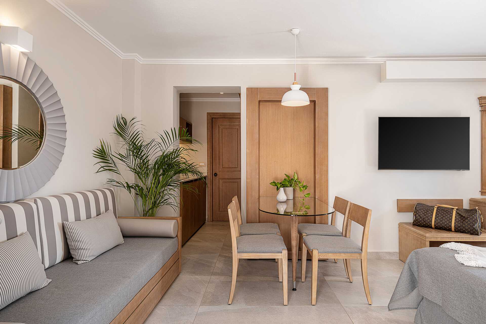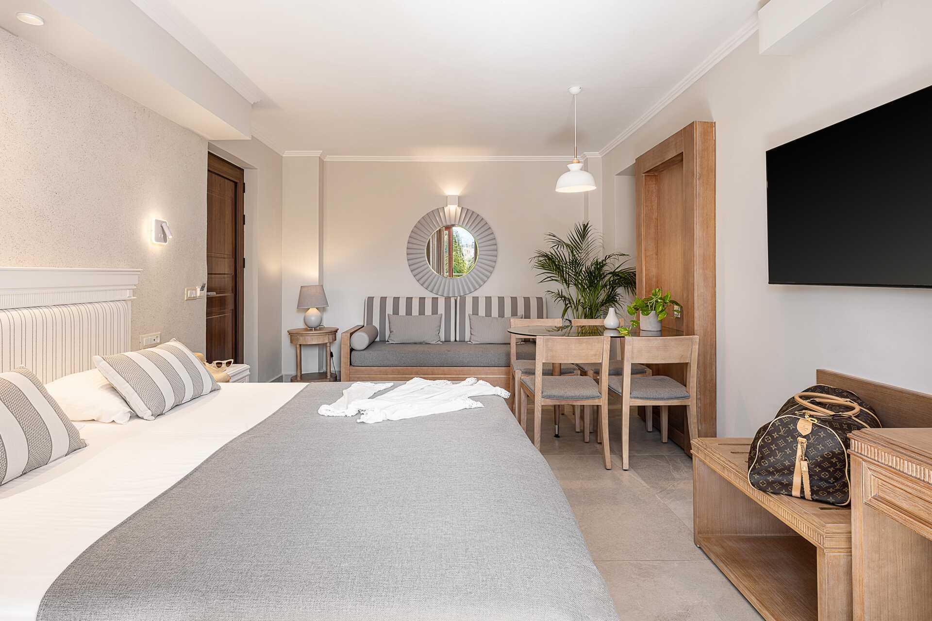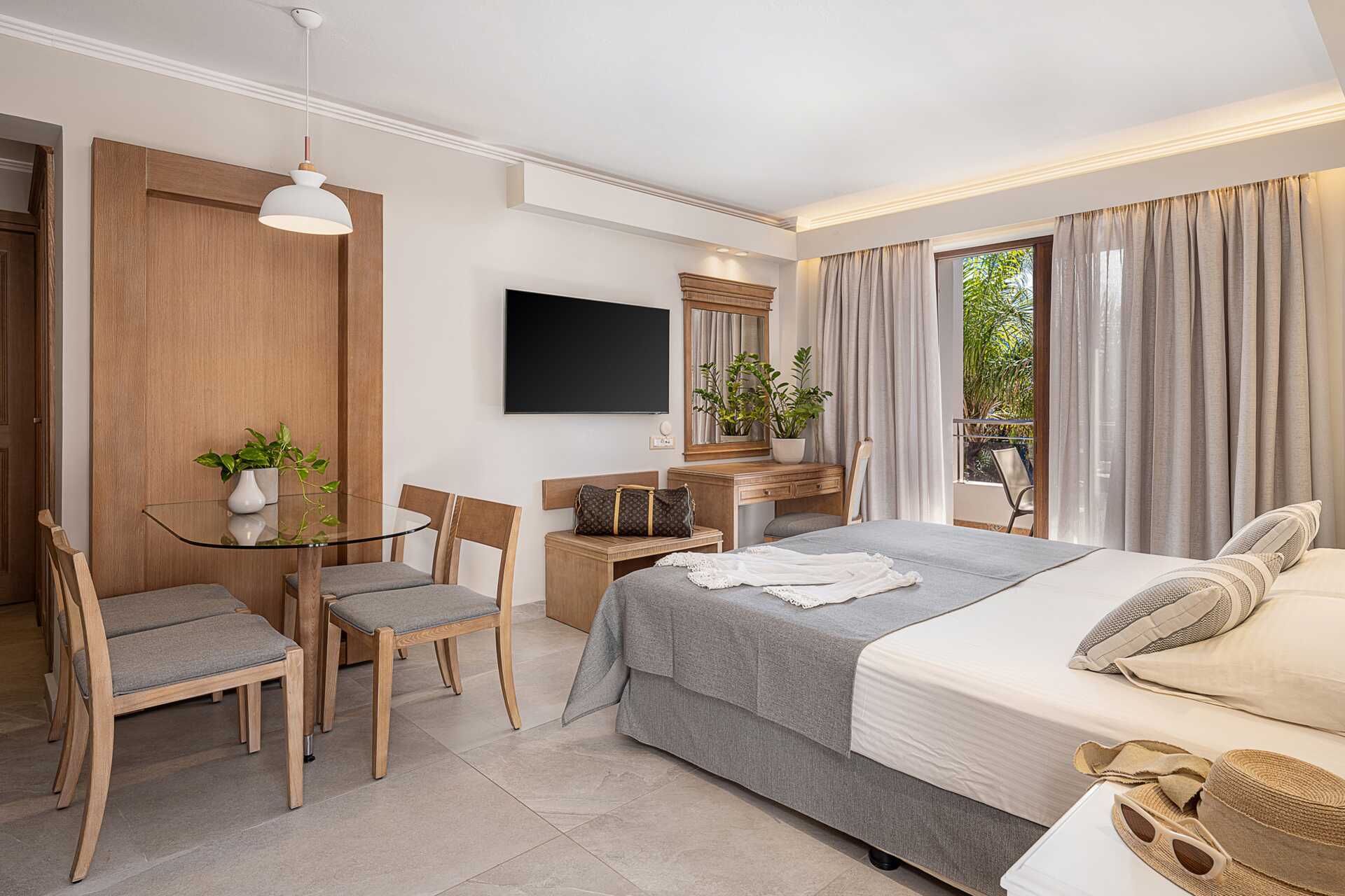 Enrumslägenheter med balkong eller markbalkong i varierande utförande och storlek, vissa balkonger med poolutsikt. Lägenheterna av varierande storlekar och utseende. Kombinerat sovrum och minikök. En dubbelsäng eller två enkelsängar. Möjlighet till extrabädd i bäddsoffa. Minikök med kokplattor, kylskåp, mikrovågsugn, vattenkokare, kaffebryggare/kaffepress och enkel köksutrustning. Wifi och luftkonditionering ingår. Deponering mot avgift. Tv med internationella kanaler. Hårtork. Badrum med dusch och wc. Städning 6 ggr/vecka.