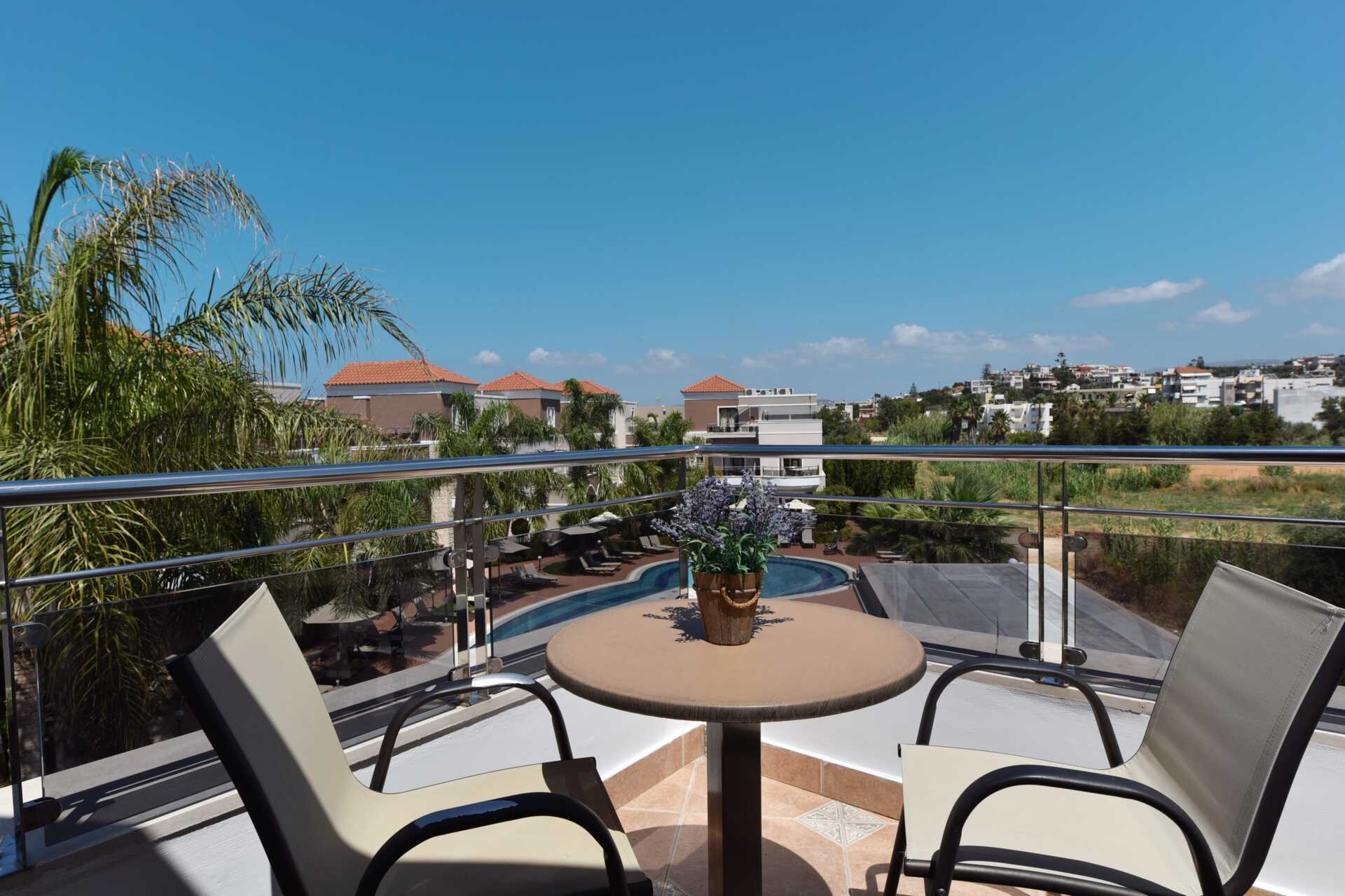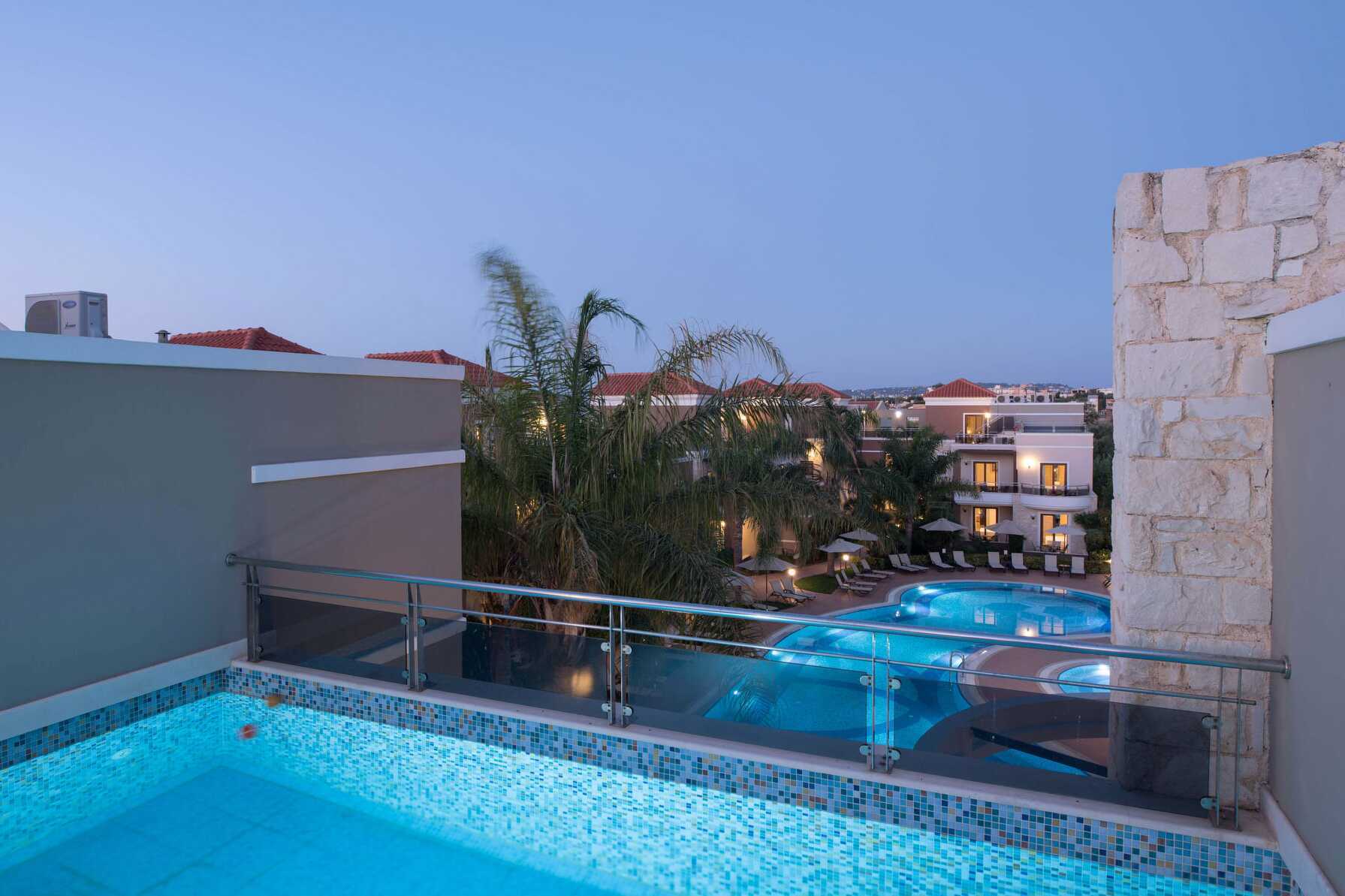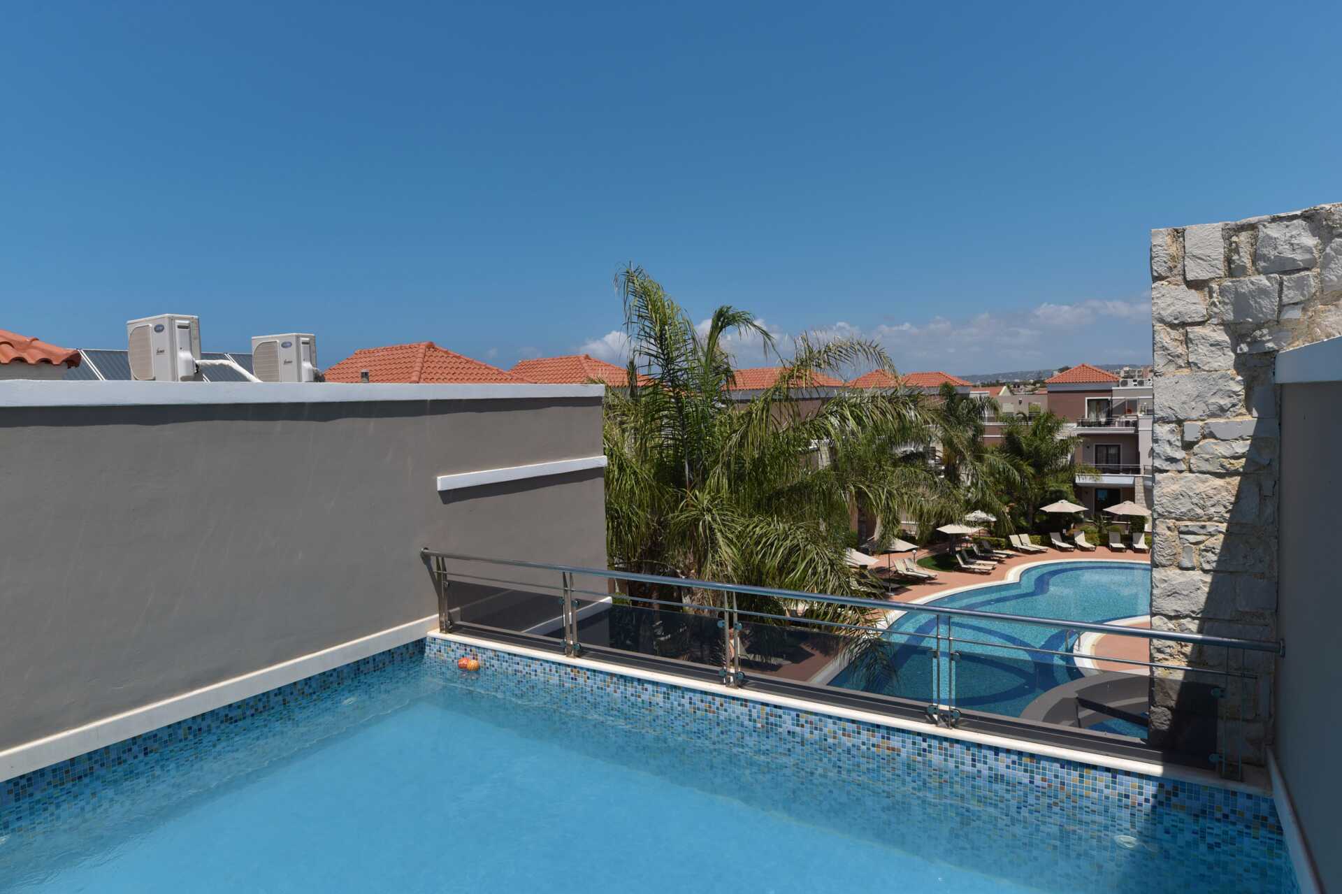Tvårumslägenheter med privat pool, belägna på tredje våningen. Balkong av varierande utförande och storlek med poolutsikt. Den privata poolen nås via en trappa från balkongen. Lägenheterna är av varierande storlek och utseende, och består av ett sovrum och ett kombinerat vardagsrum med minikök. Två enkelsängar eller en dubbelsäng. Möjliga extrabäddar i bäddsoffa. Minikök med kokplattor, kylskåp, mikrovågsugn, vattenkokare, kaffebryggare/kaffepress och enkel köksutrustning. Wifi och luftkonditionering ingår. Deponering mot extra kostnad. Tv med internationella kanaler. Hårtork. Badrum med dusch och wc. Städning 6 ggr/vecka.