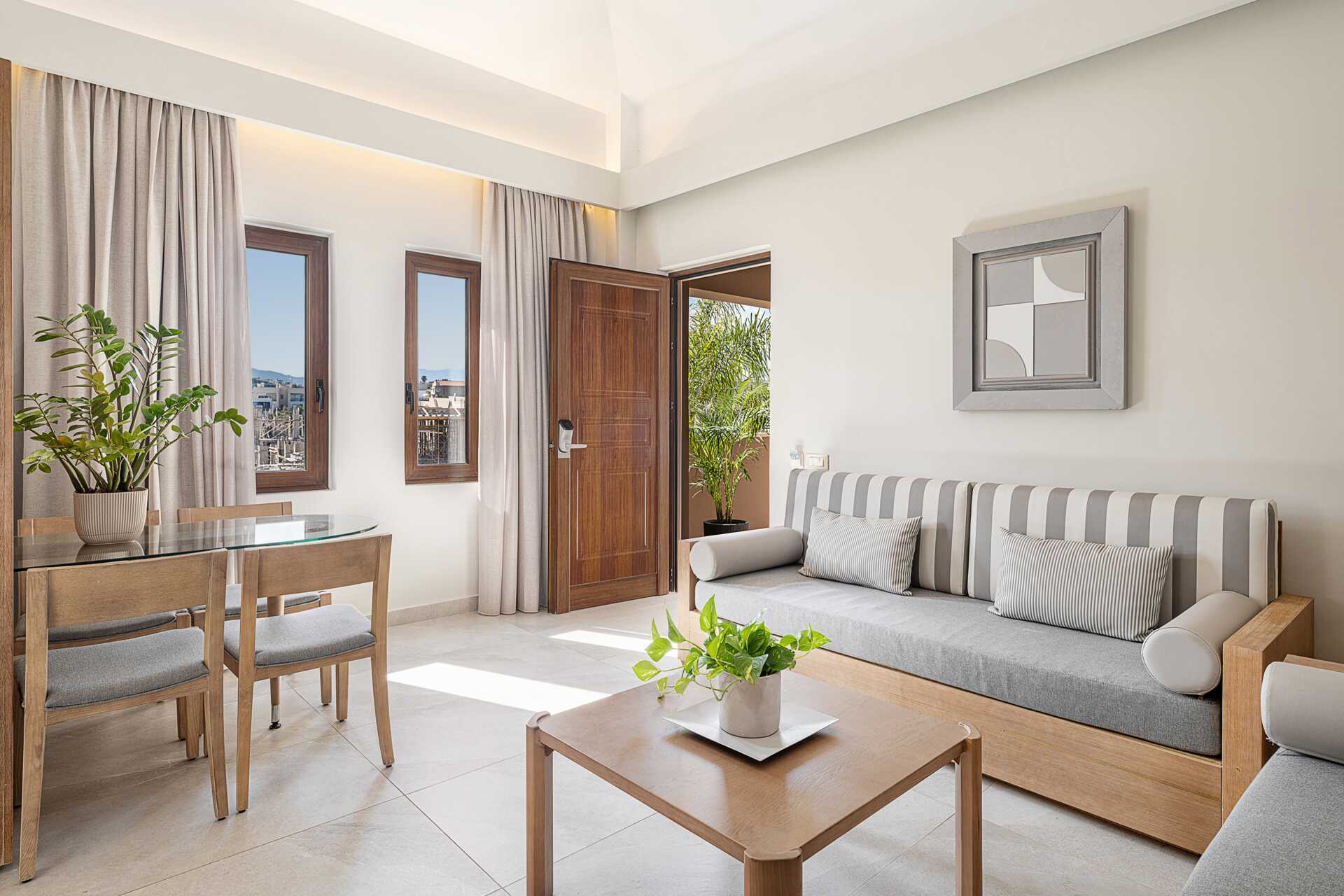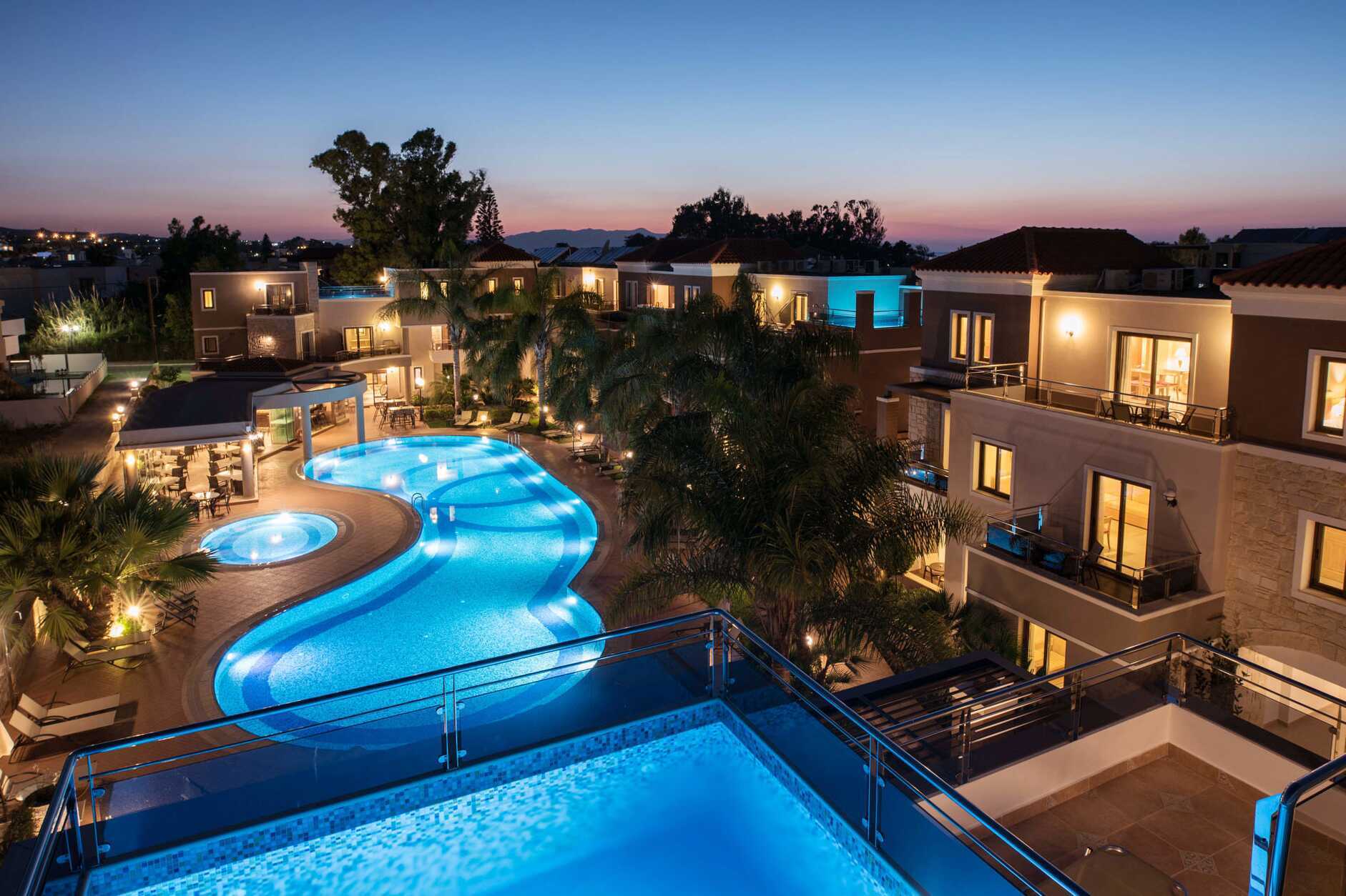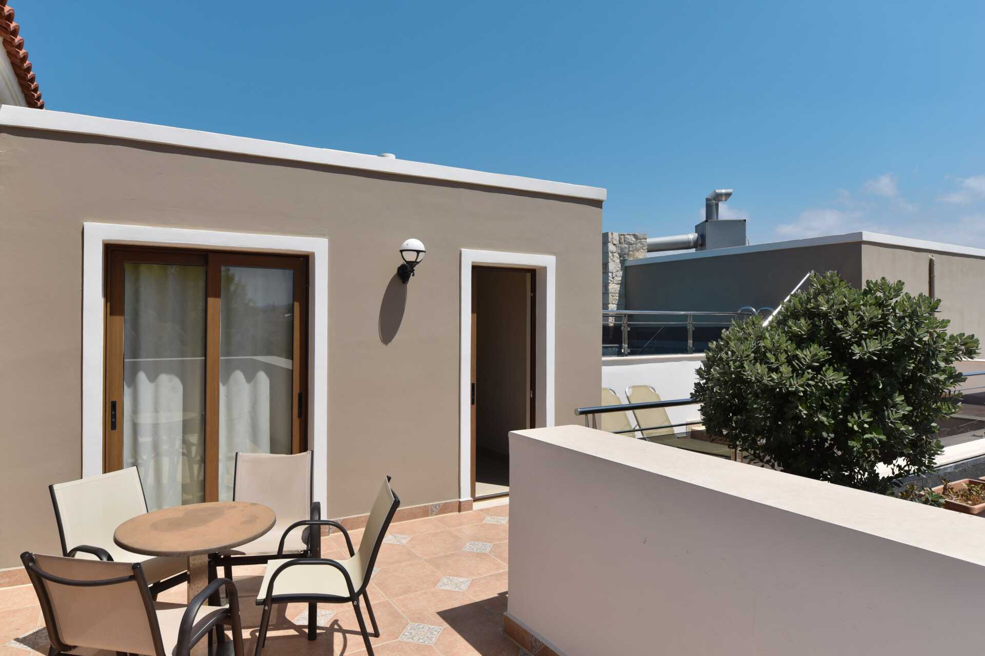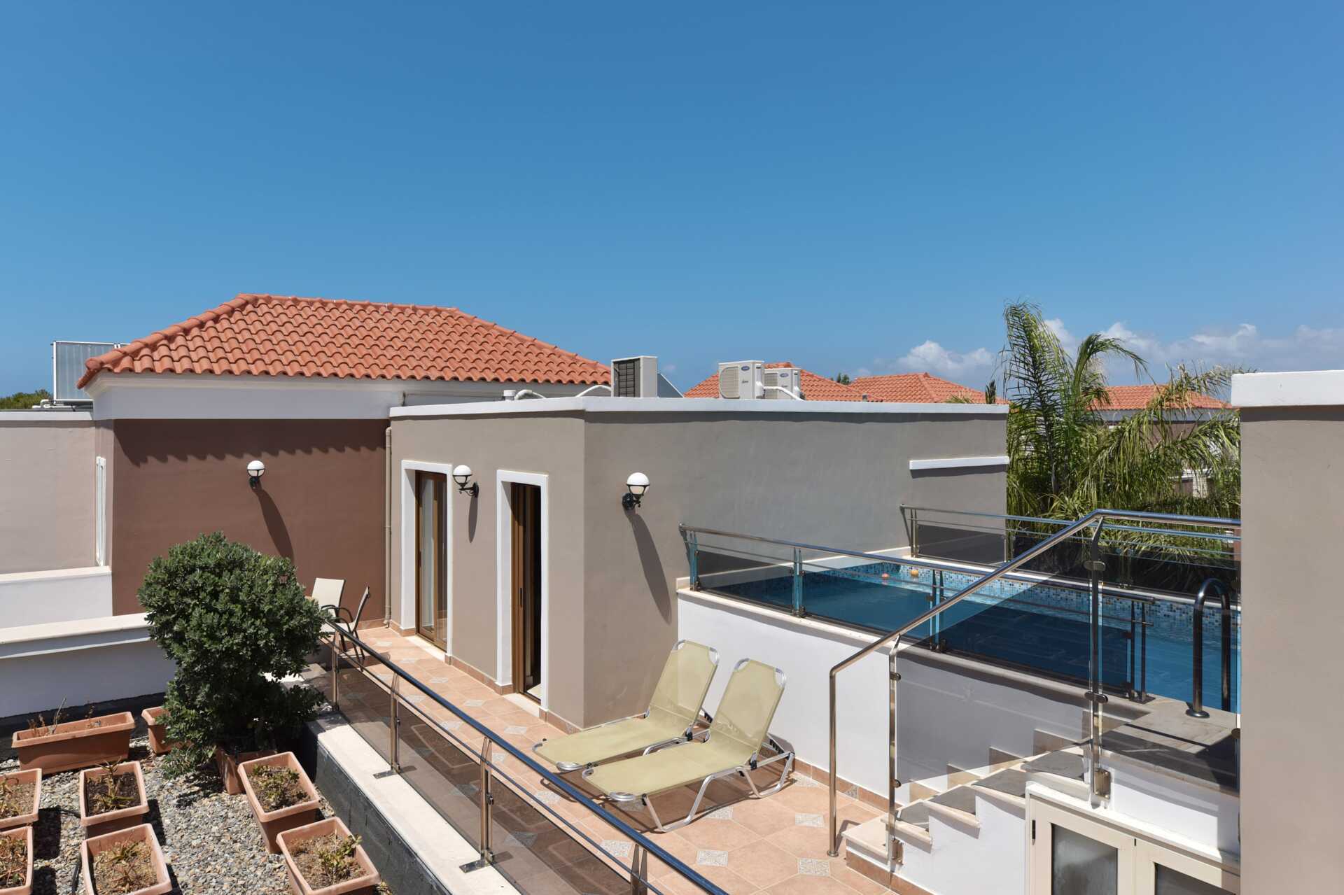 Tvårumslägenheter med privat pool, belägna på tredje våningen. Balkong av varierande utförande och storlek med poolutsikt. Den privata poolen nås via en trappa från balkongen. Lägenheterna är av varierande storlek och utseende, och består av ett sovrum och ett kombinerat vardagsrum med minikök. Två enkelsängar eller en dubbelsäng. Möjliga extrabäddar i bäddsoffa. Minikök med kokplattor, kylskåp, mikrovågsugn, vattenkokare, kaffebryggare/kaffepress och enkel köksutrustning. Wifi och luftkonditionering ingår. Deponering mot extra kostnad. Tv med internationella kanaler. Hårtork. Badrum med dusch och wc. Städning 6 ggr/vecka.