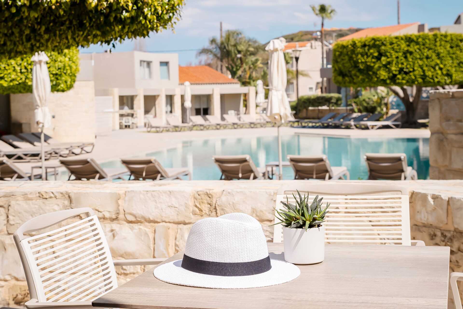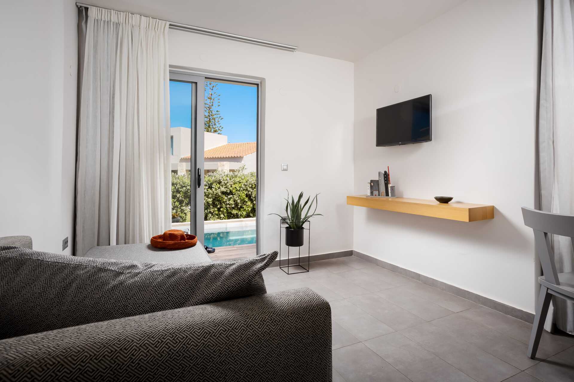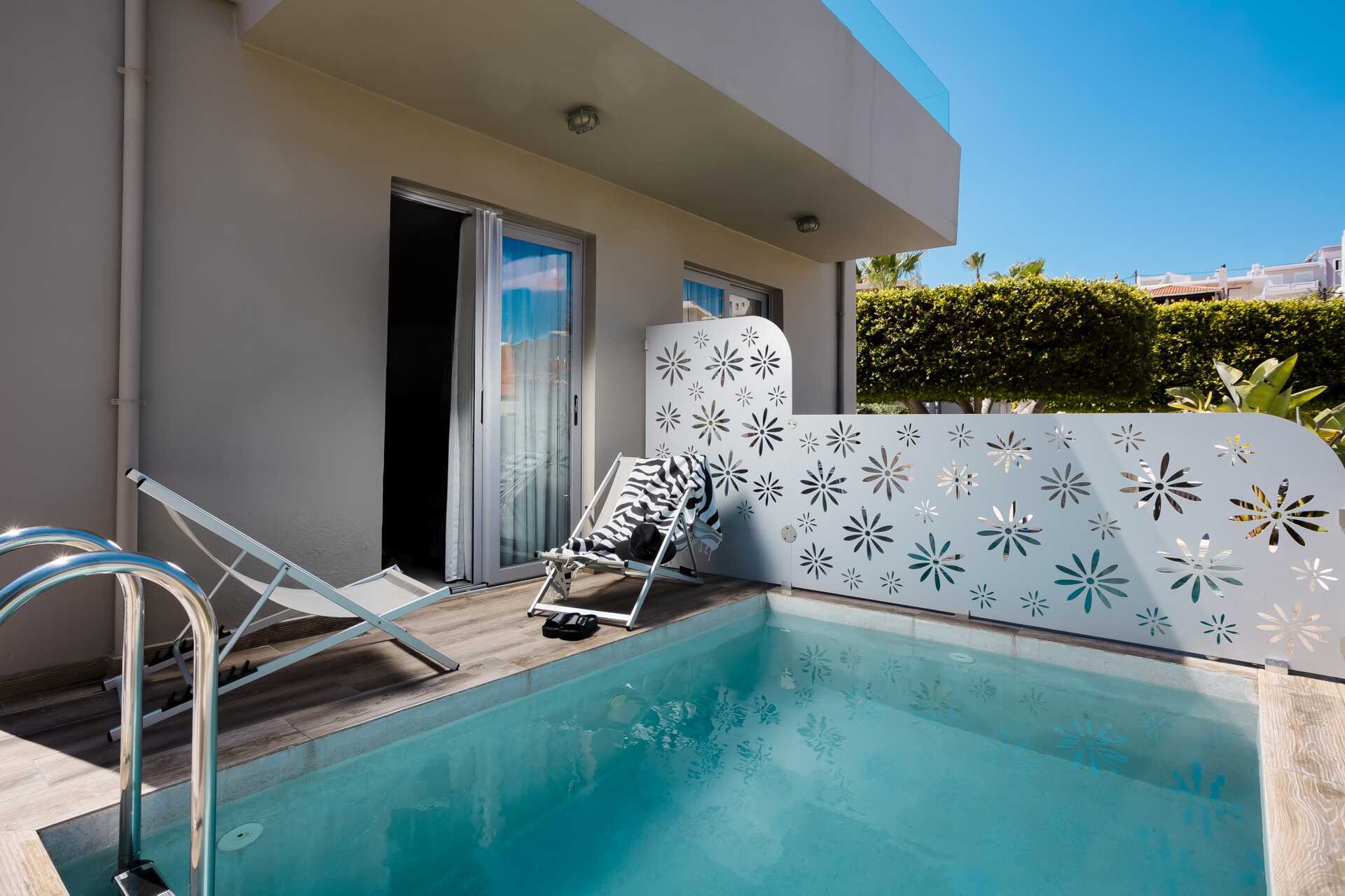 Enrumslägenhet med markterrass och privat pool. Terrassen nås via ett trappsteg. Lägenheterna ligger i Elina-delen. På terrassen finns bord, stolar och solstolar. Kombinerat sovrum med minikök. Två enkelsängar. Möjlighet till extrabädd i bäddsoffa. Minikök med kokplattor, kylskåp, kaffebryggare, vattenkokare och enkel köksutrustning. Wifi, luftkonditionering och deponering ingår. Tv med internationella kanaler. Hårtork. Badrum med dusch och wc. Städning 6 ggr/vecka. Vid användning av spjälsäng blir det trångt i lägenheten.