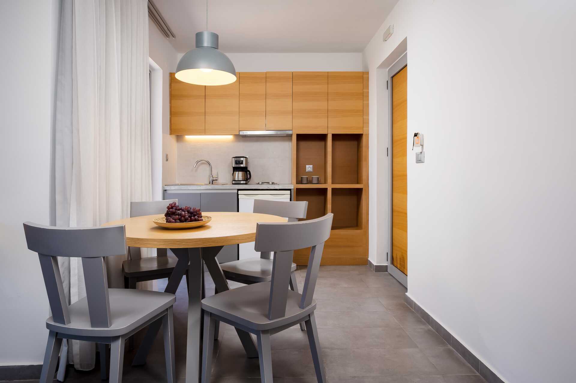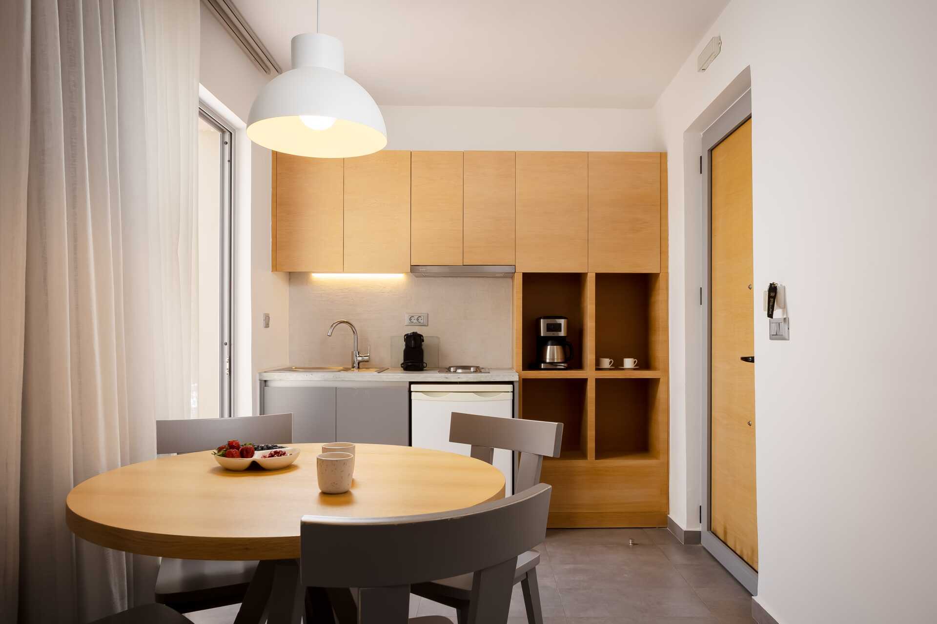 Enrumslägenhet med balkong, markterrass (som nås via ett trappsteg), markbalkong eller delad uteplats, vissa lägenheter har poolutsikt. Enrumslägenheterna ligger i alla hotellets delar. Kombinerat sovrum med minikök. Två enkelsängar. Möjlighet till extrabädd i bäddsoffa. Minikök, med kokplattor, kylskåp, kaffebryggare, vattenkokare och enkel köksutrustning. Wifi, luftkonditionering och deponering ingår. Tv med internationella kanaler. Badrum med dusch och wc. Hårtork. Städning 6 ggr/vecka. Vid användning av spjälsäng blir det trångt i lägenheten.
