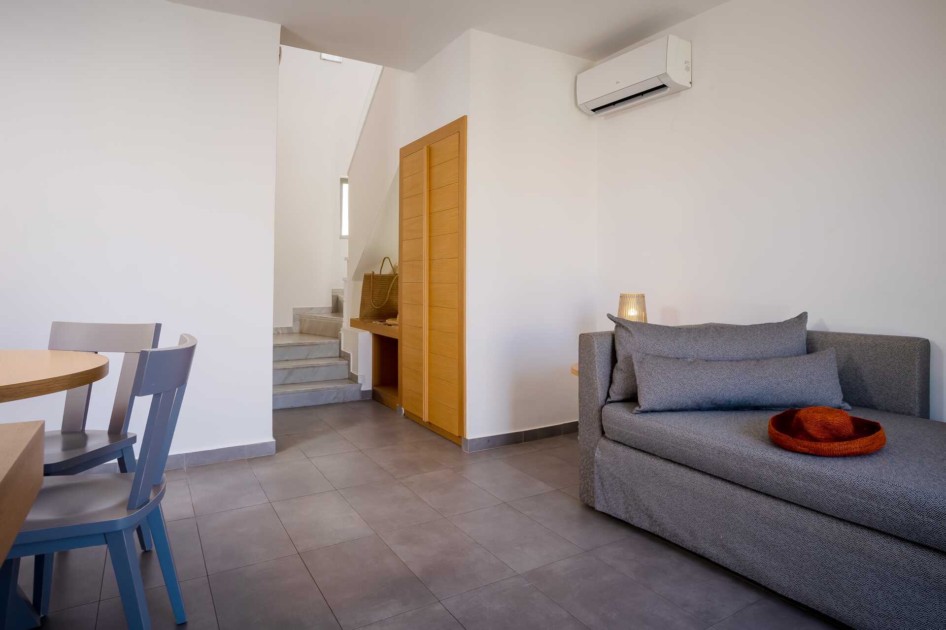 Tvårumslägenhet i etage och med balkong, vissa med poolutsikt. Lägenheterna ligger i Elina-delen. På entréplanet finns ett kombinerat vardagsrum med minikök, extrabäddar i bäddsoffa, ett badrum med dusch och wc samt ett minikök med kokplattor, kylskåp, kaffebryggare, vattenkokare och enkel köksutrustning. En trappa upp finns ett sovrum med två enkelsängar, balkong och en separat wc. Wifi, luftkonditionering och deponering ingår. Tv med internationella kanaler. Hårtork. Städning 6 ggr/vecka. Spjälsängen får endast plats på den nedre våningen (entréplan), vilket gör att vi inte rekommenderar att använda spjälsäng i denna lägenhet.