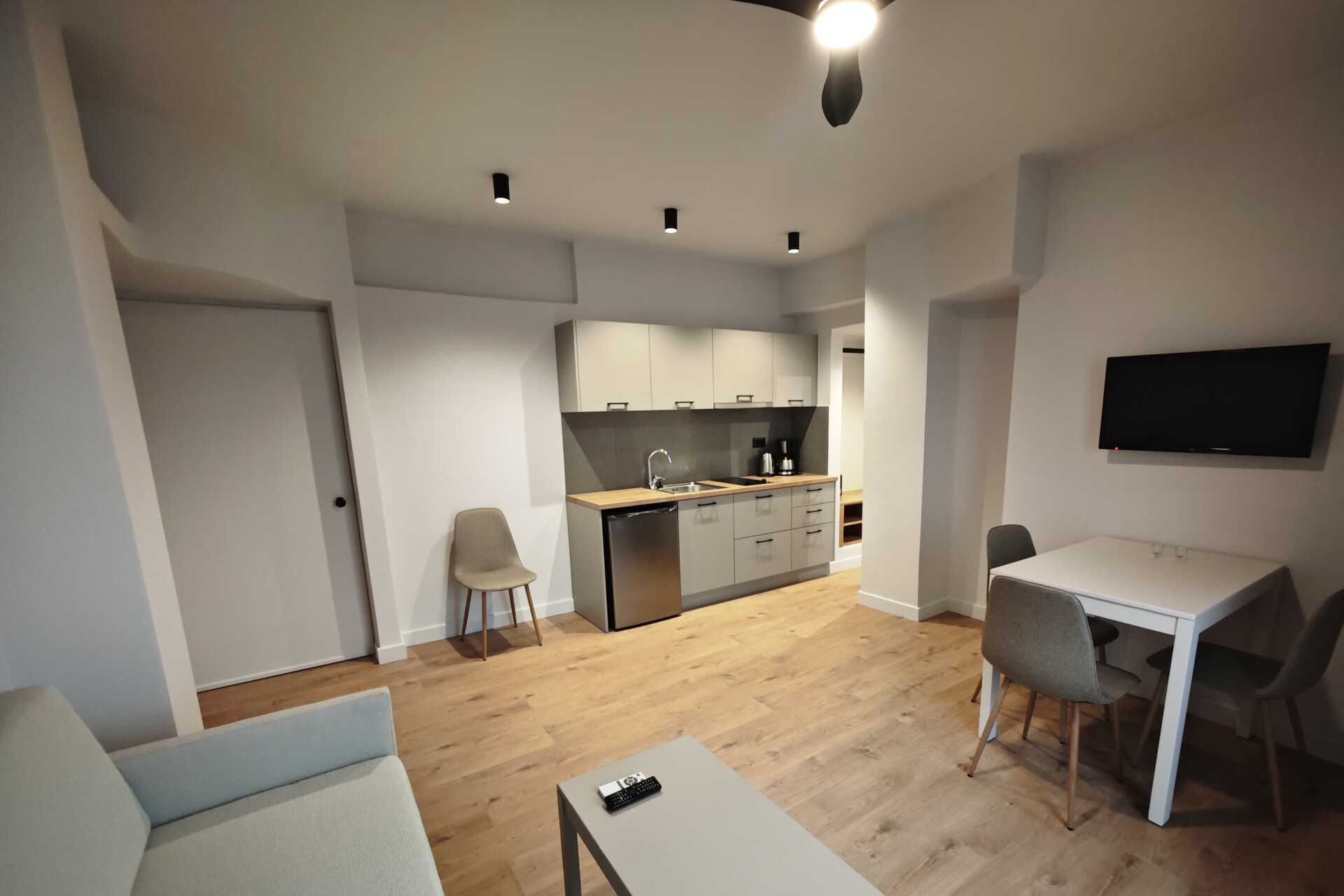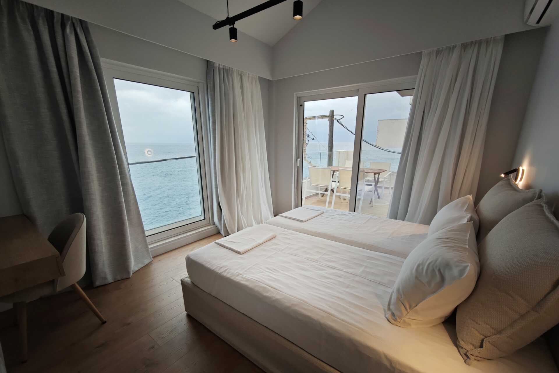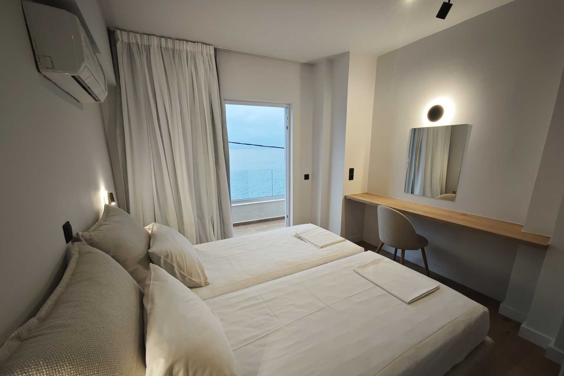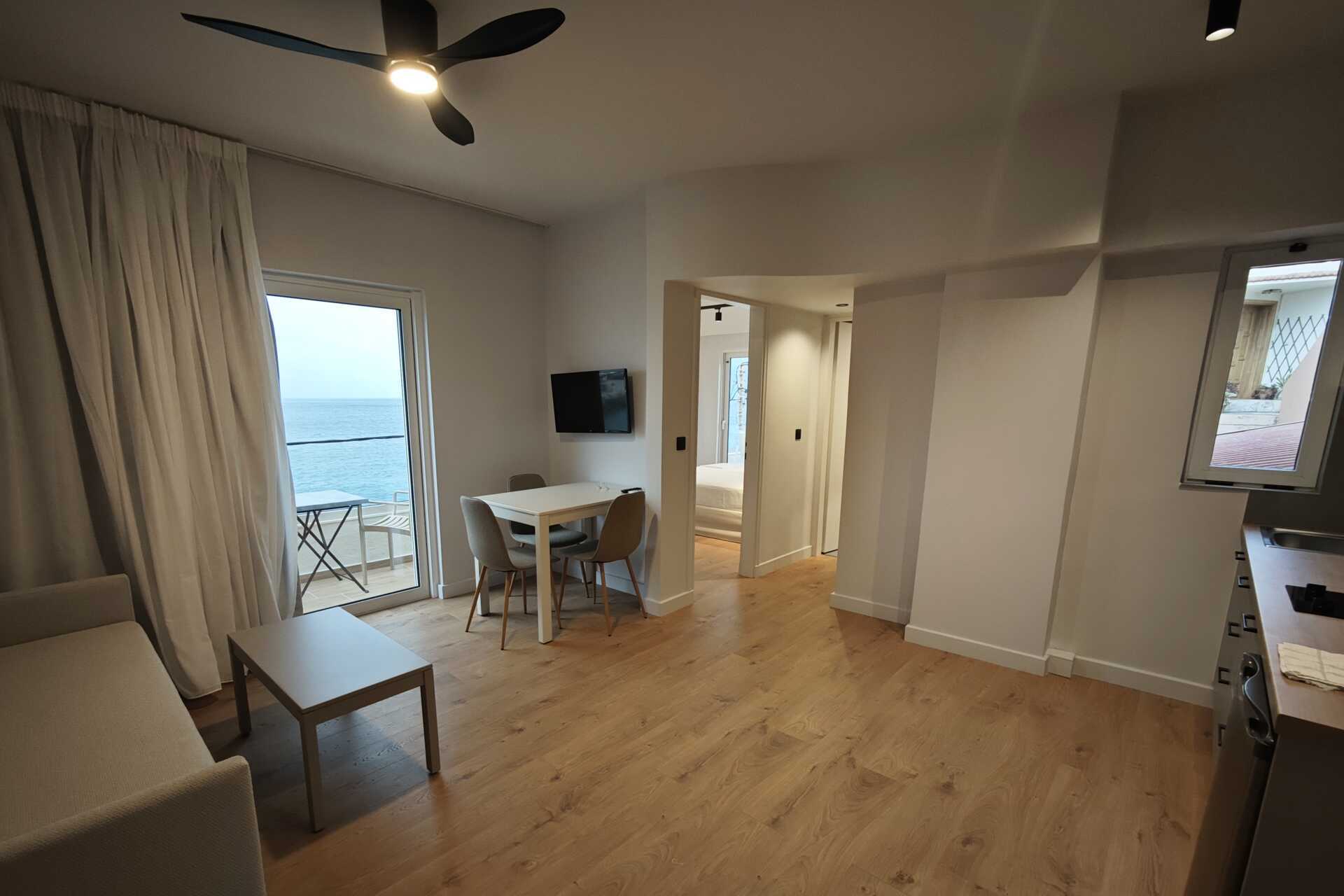 Tvårumslägenhet med balkong och havsutsikt - storleken på balkongerna kan variera stort, med allt från en smal balkong där endast två stolar och ett smalt bord får plats till en balkong med fyra stolar och ett bord, specifik storlek på balkong kan inte garanteras - eller med stor balkong eller terrass med havsutsikt. Ett sovrum och ett kombinerat vardagsrum med minikök. En dubbelsäng eller två enkelsängar. Möjlighet till extrabädd i bäddsoffa med utdragbar säng. Minikök med kokplattor, kylskåp, vattenkokare, kaffebryggare och enkel köksutrustning. Wifi, luftkonditionering och deponering ingår. Tv med en lokal kanal. Hårtork. Badrum med dusch och wc. Städning 6 ggr/vecka.