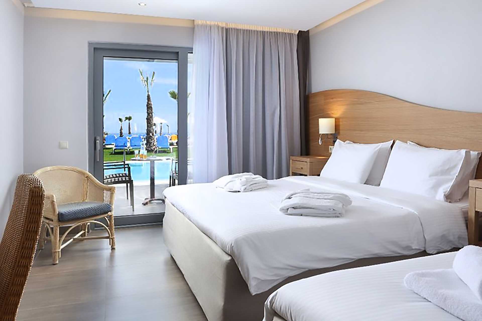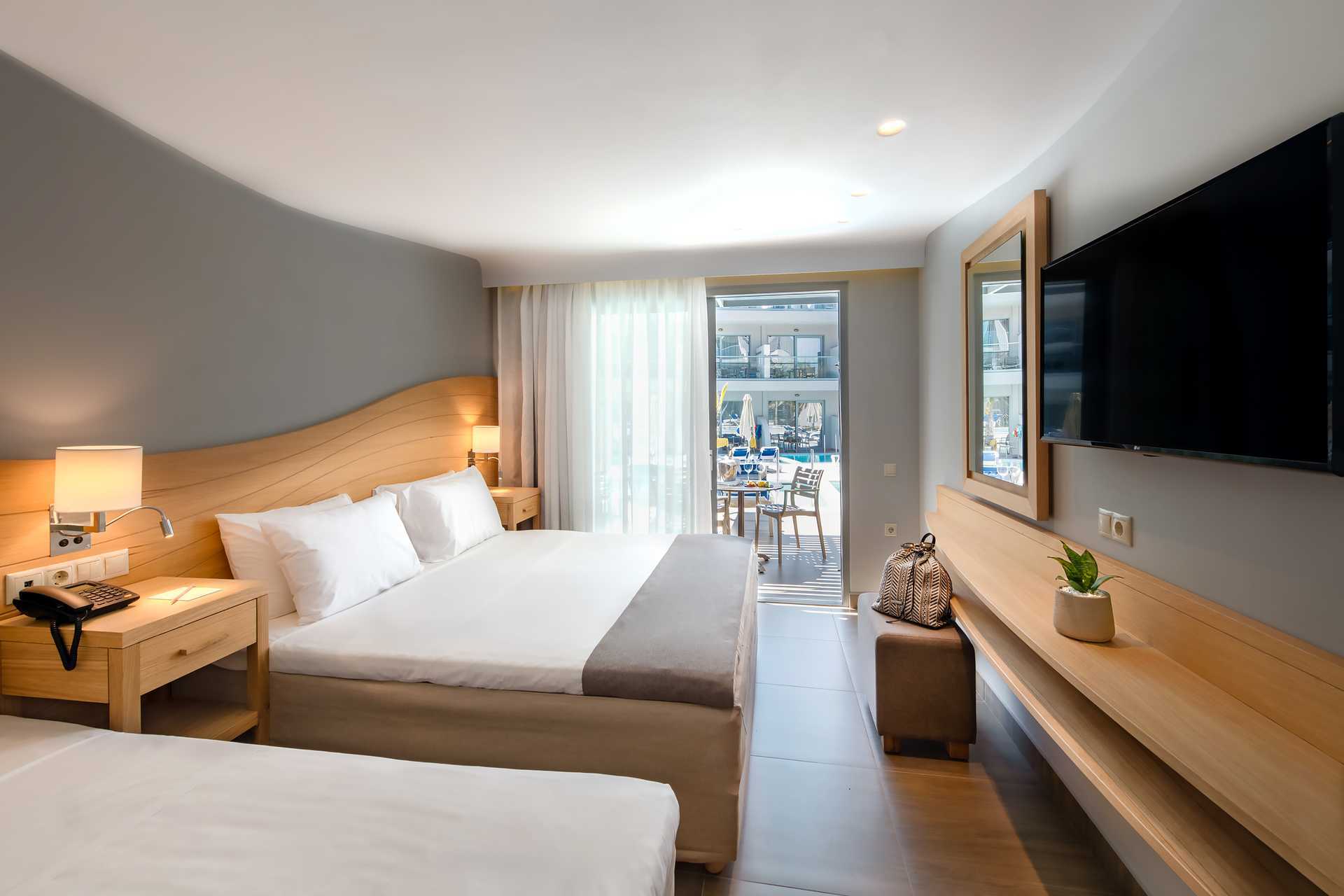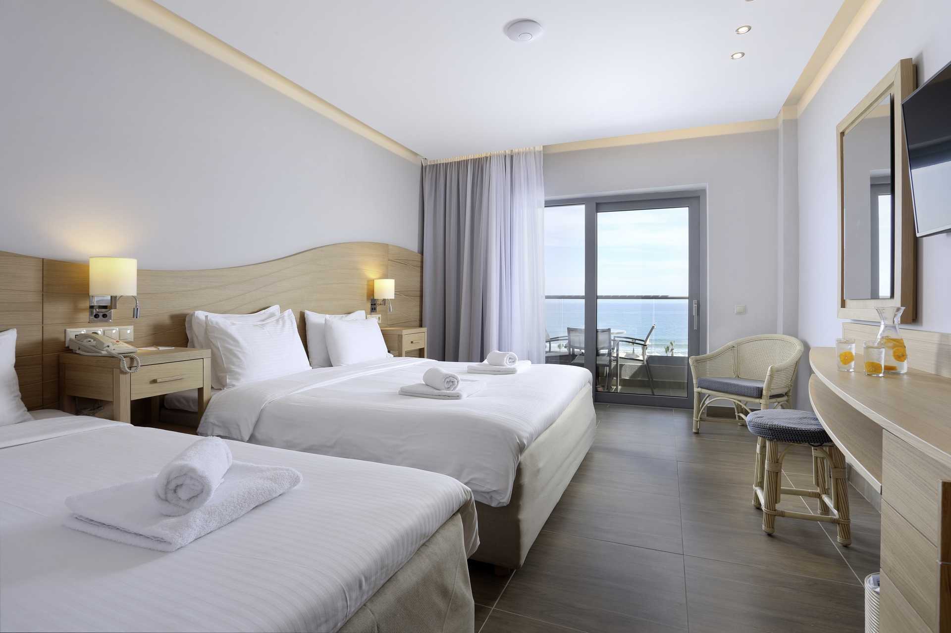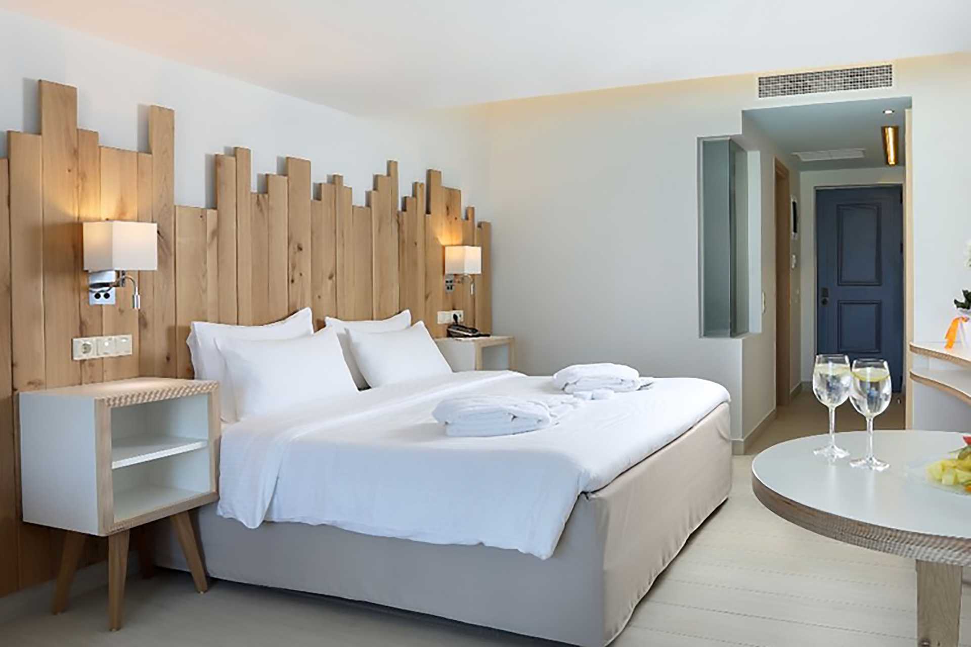Dubbelrum med balkong eller terrass, vissa med havsutsikt. En dubbelsäng eller två enkelsängar. Möjlighet till extrabädd i enkelsäng. Wifi, luftkonditionering och deponering ingår. Kylskåp. Mikrovågsugn. Nespresso kaffemaskin - kapslar ingår och fylls på varje dag. Tv med internationella kanaler. Strykjärn och strykbräda. Hårtork. Badrum med dusch och wc. Städning 7 ggr/vecka. Barn under två år räknas in i maxantalet personer i rummet.