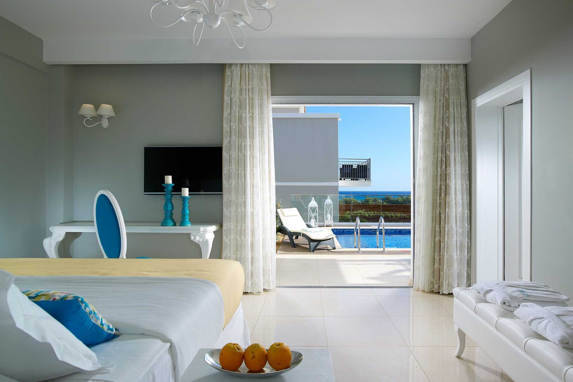 Svit med privat pool på markterrassen. Sviterna består av ett sovrum och ett vardagsrum. En dubbelsäng eller två enkelsängar. Möjlighet till extrabäddar i två bäddsoffor. Välj din favoritkudde från hotellets kuddmeny. Wifi, luftkonditionering och deponering ingår. Minibar. Vattenkokare samt kaffe och te. Nespressomaskin - två kapslar ingår vid ankomst - därefter finns det att köpa. Tv med internationella kanaler. Strykjärn och strykbräda. Badrockar och tofflor. Hårtork. Badrum med badkar eller dusch samt wc. Städning 7 ggr/vecka. Barn under två år räknas in i max antal personer i rummet.