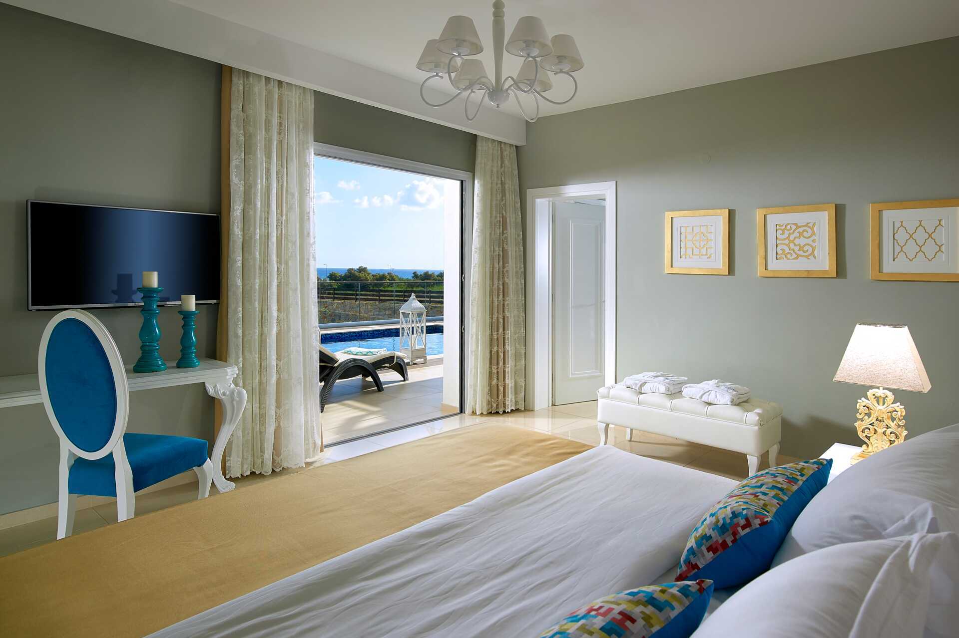 Familjerum med privat pool och poolutsikt från uteplatsen. Familjerummet består av två sovrum. I det ena rummet finns en dubbelsäng och i det andra finns två enkelsängar. Välj din favoritkudde från hotellets kuddmeny. Wifi, luftkonditionering och deponering ingår. Minibar. Vattenkokare samt kaffe och te. Nespressomaskin - två kapslar ingår vid ankomst - därefter finns det att köpa. Tv med internationella kanaler. Strykjärn och strykbräda. Badrockar och tofflor. Hårtork. Två badrum med badkar eller dusch samt wc. Städning 7 ggr/vecka. Barn under två år räknas in i max antal personer i rummet.