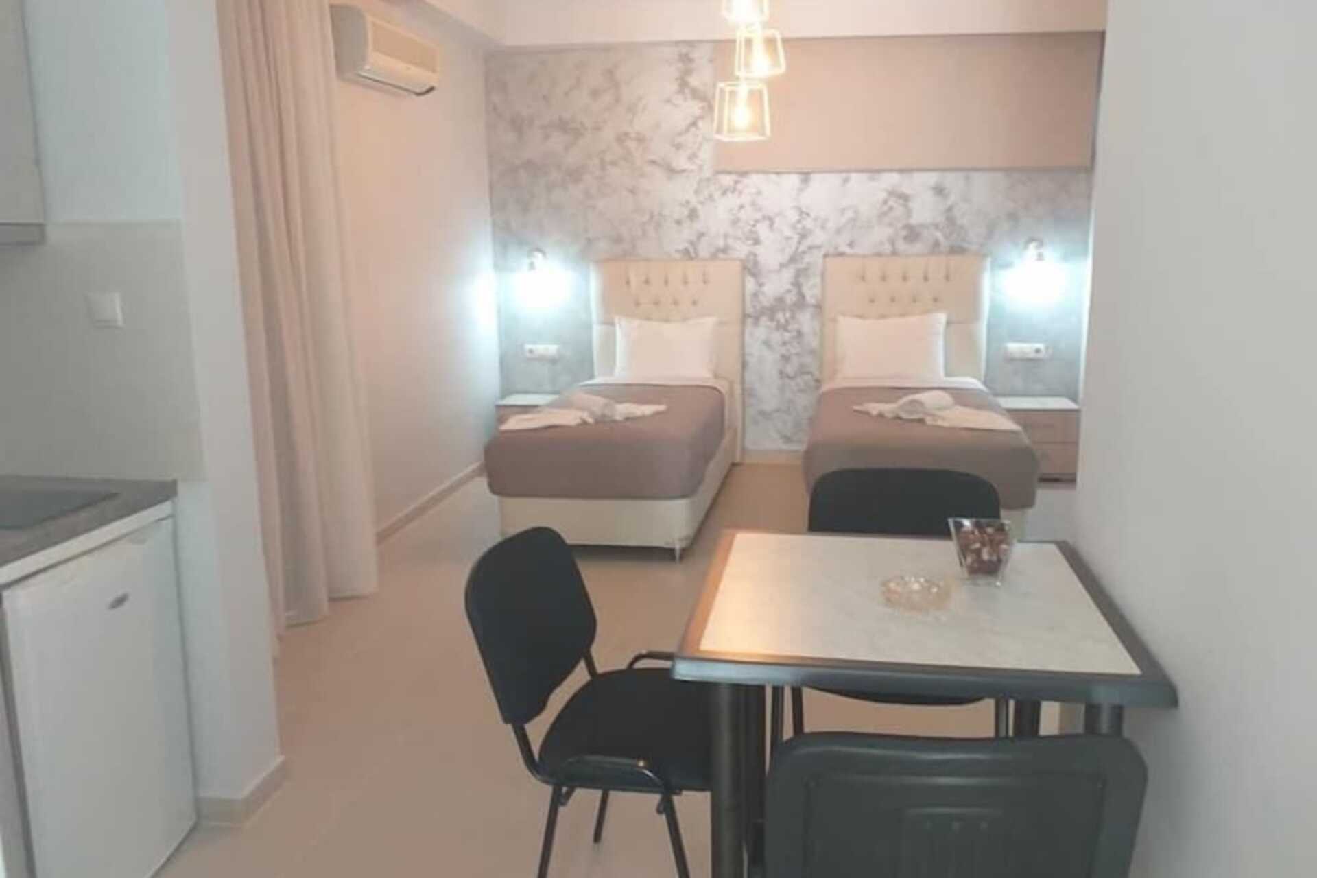 Enrumslägenhet med balkong. Sovrum kombinerat med minikök. En dubbelsäng eller två enkelsängar. Minikök med kokplattor, kylskåp och enkel köksutrustning. Wifi ingår. Luftkonditionering mot avgift. Tv med lokala kanaler. Hårtork. Badrum med dusch och wc. Städning 3 ggr/vecka. Barn under två år räknas in i maxantalet personer i lägenheten.