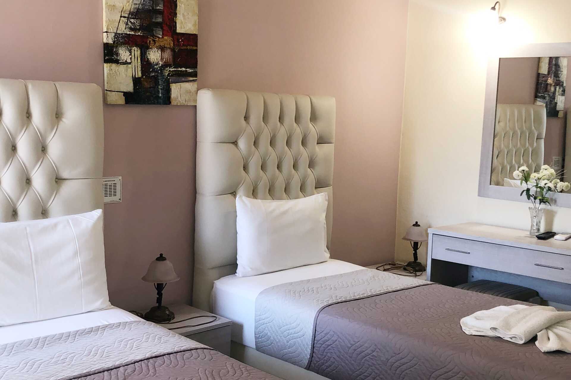 Dubbelrum med balkong. En dubbelsäng eller två enkelsängar. Wifi ingår. Luftkonditionering mot avgift. Kylskåp. Tv med lokala kanaler. Hårtork. Badrum med dusch och wc. Städning 3 ggr/vecka. Barn under två år räknas in i maxantalet personer i rummet.
