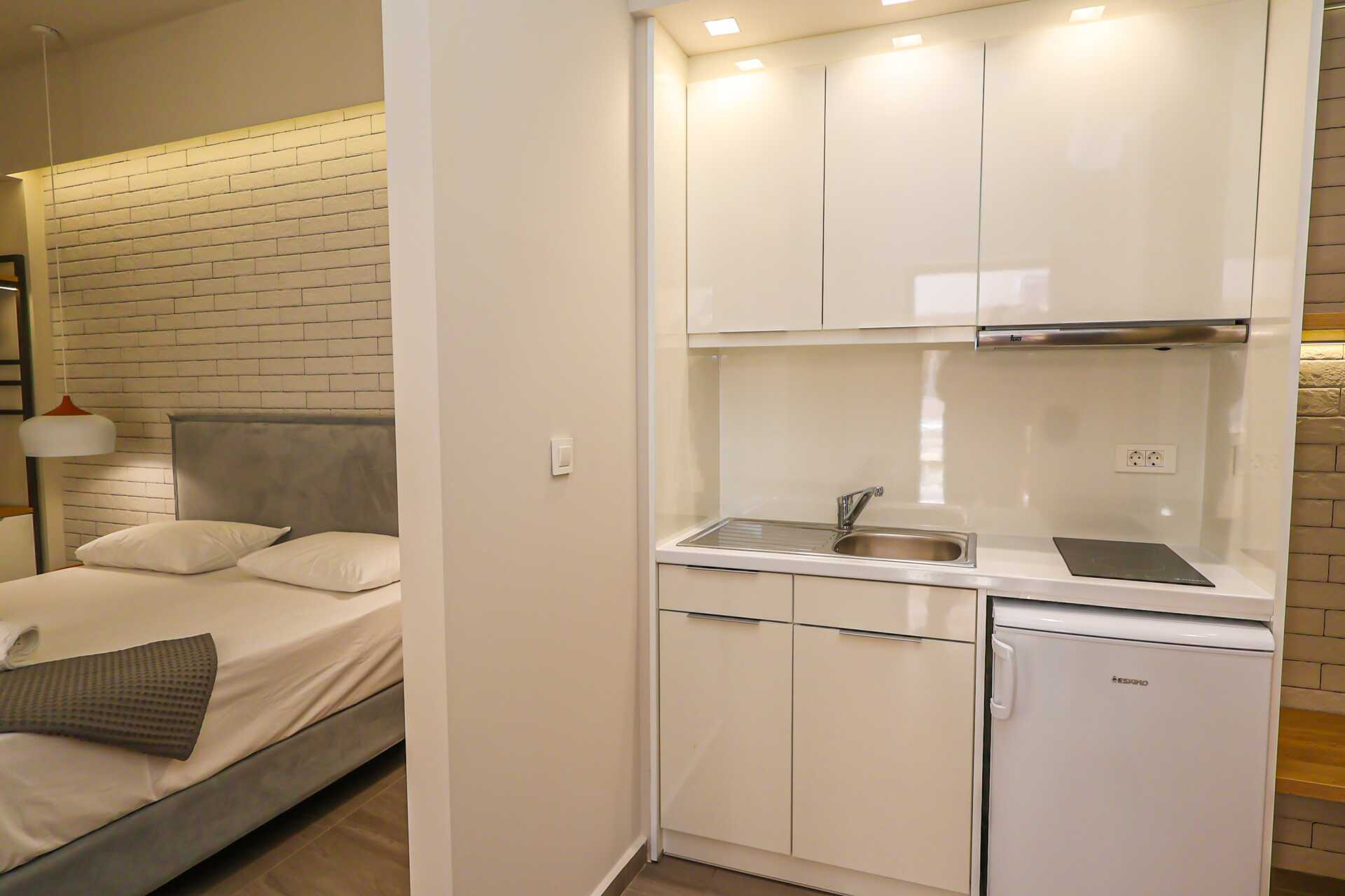 Enrumslägenhet med markbalkong eller markterrass. Sovrum kombinerat med minikök. En dubbelsäng eller två enkelsängar. Minikök kokplattor, kylskåp och enkel köksutrustning. Wifi och luftkonditionering ingår. Deponering mot avgift. Tv med internationella kanaler. Badrum med dusch och wc. Städning 6 ggr/vecka.