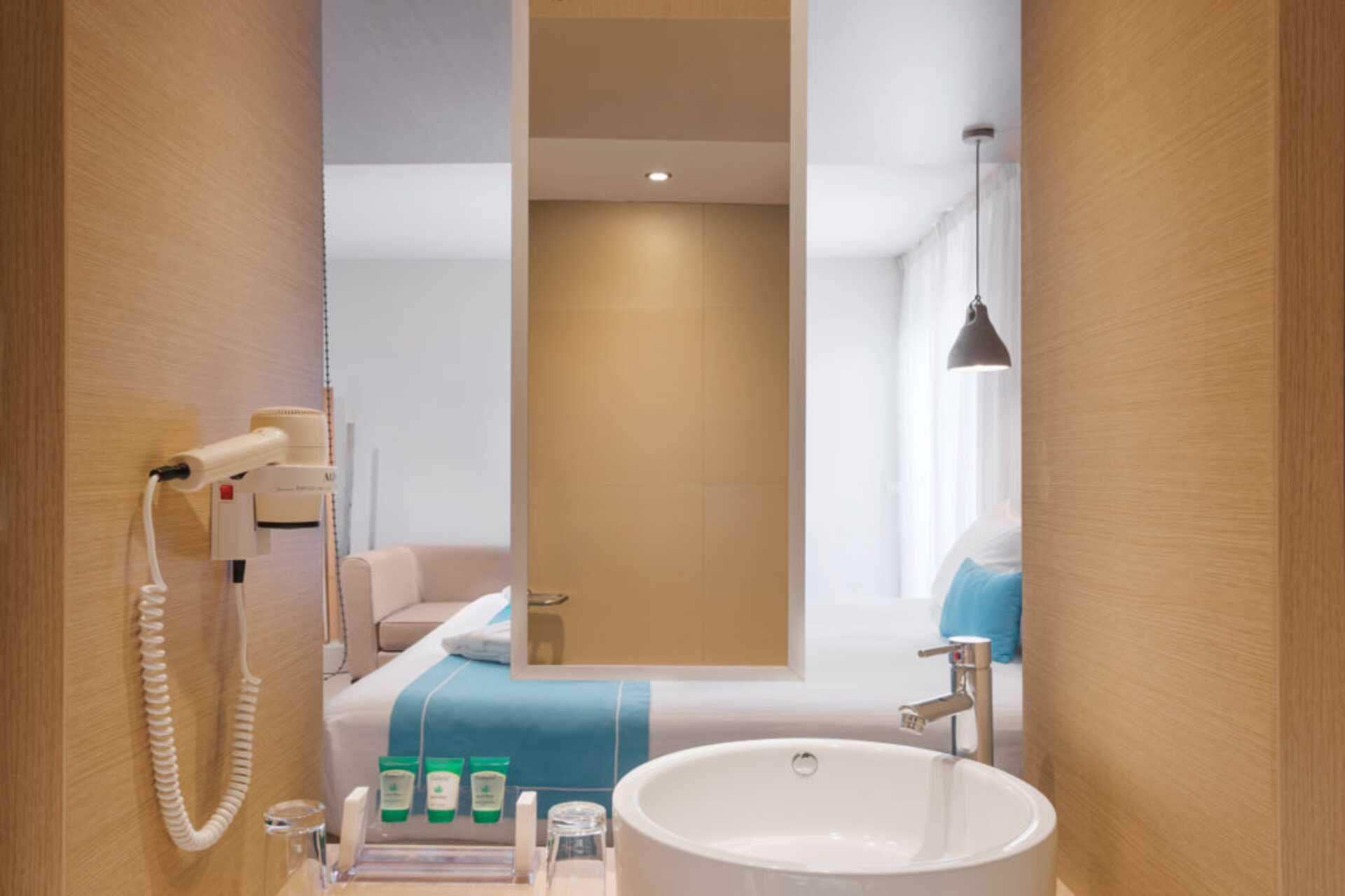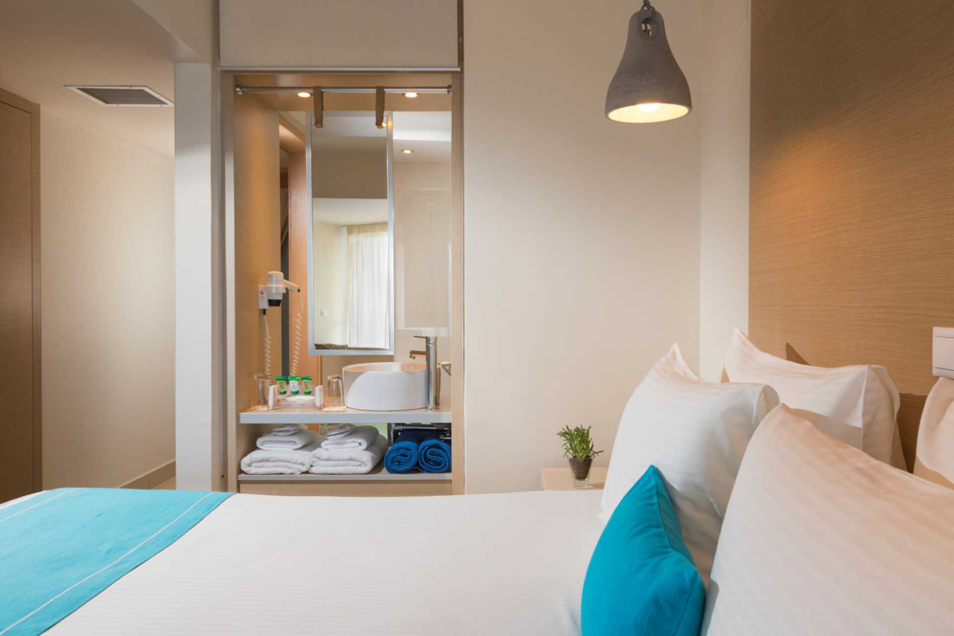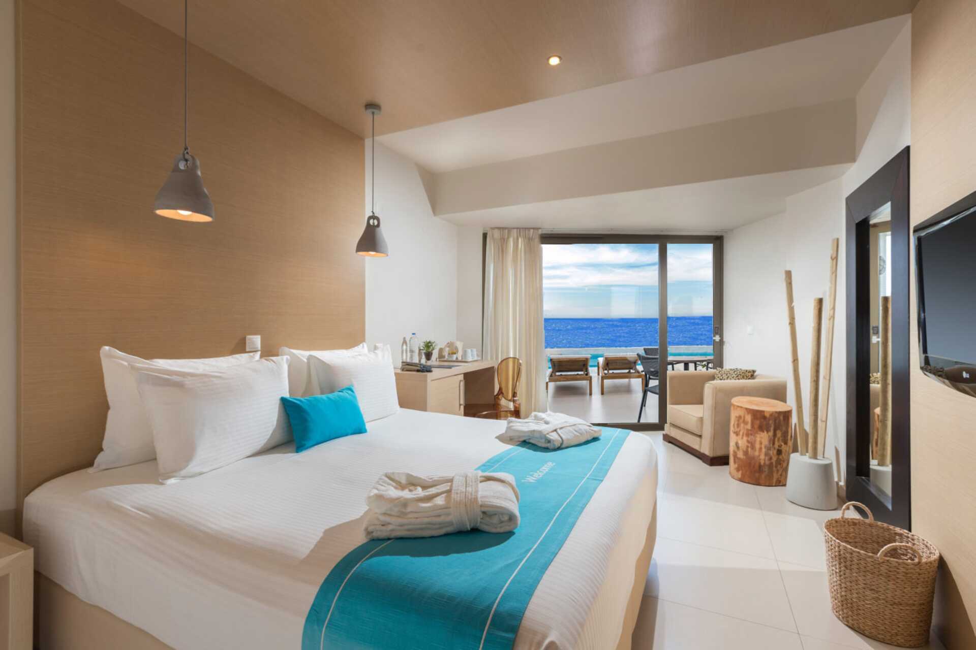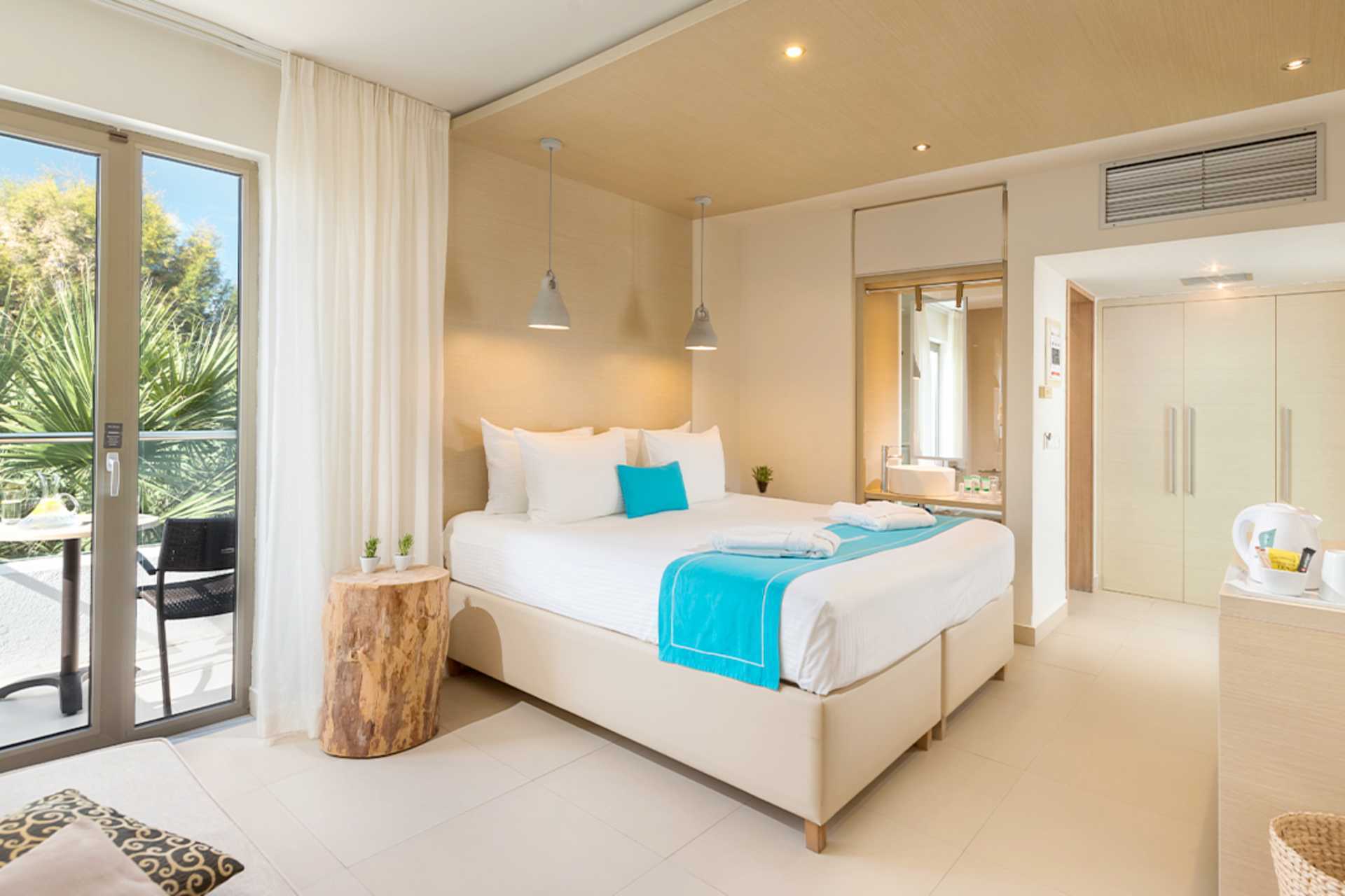 Dubbelrum med balkong eller terrass eller med balkong och havsutsikt. En dubbelsäng eller två enkelsängar. Wifi, luftkonditionering och deponering ingår. Kylskåp. En flaska vatten ingår - fylls på varje dag. Vattenkokare samt kaffe och te. Tv med internationella kanaler. Hårtork. Badrum med badkar eller dusch samt wc. Städning 7 ggr/vecka.