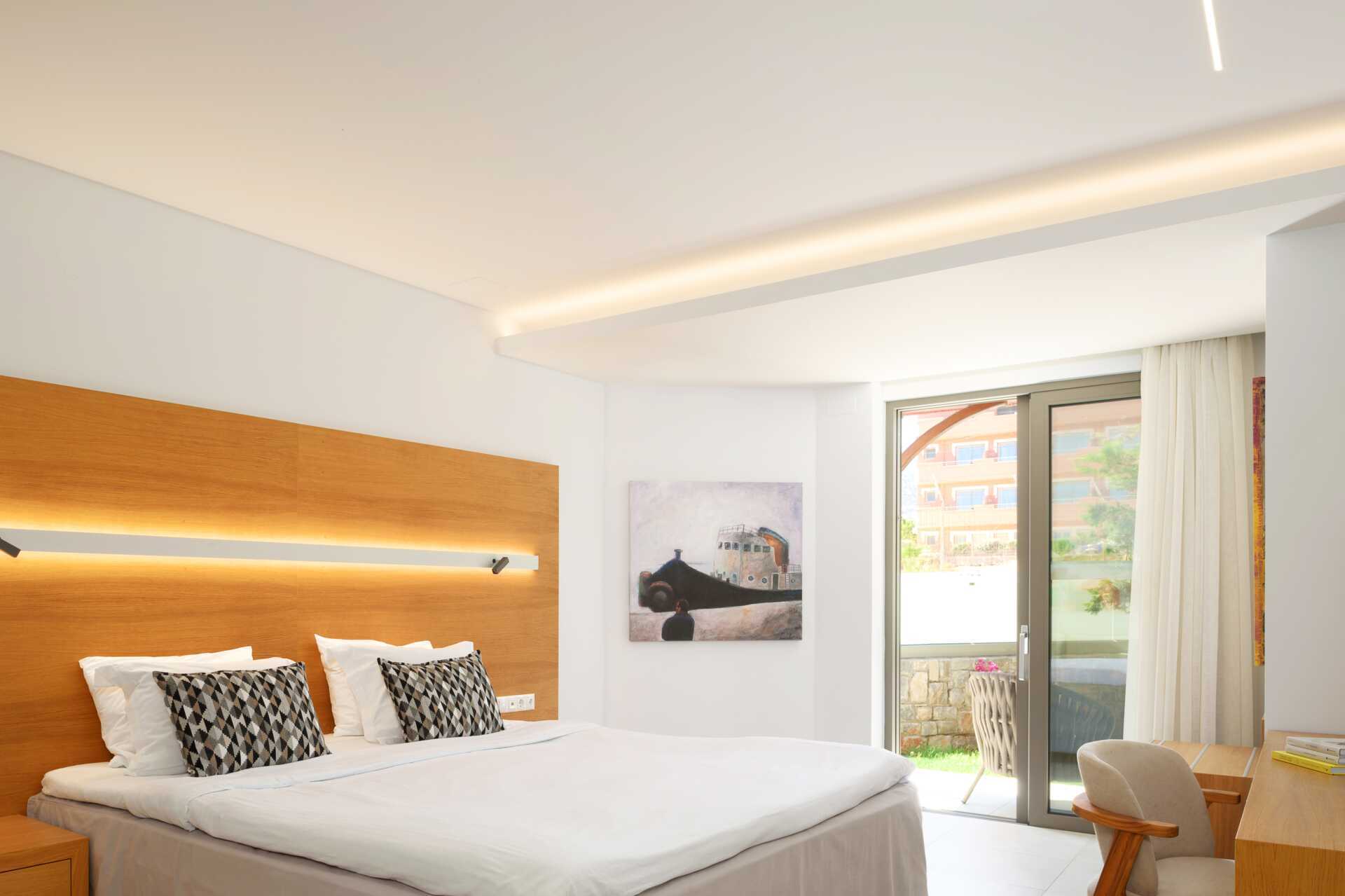 Deluxesvit med balkong eller terrass, vissa med begränsad havsutsikt och vissa med havsutsikt. Sviterna har öppen planlösning till badrummet. En dubbelsäng. Möjlighet till extrabädd i bäddsoffa. Wifi, deponering och luftkonditionering ingår. Kylskåp, en flaska vatten ingår och fylls på varje dag. Vattenkokare samt kaffe och te. Nespressomaskin, kapslar ingår. Vid ankomsten finns en flaska kretensiskt vin och läsk på rummet. Tv med internationella kanaler. Badrockar och tofflor. Badrum med badkar, separat dusch samt wc. Städning 7 ggr/vecka. Ett parasoll och två solstolar finns reserverade åt er vid stranden.