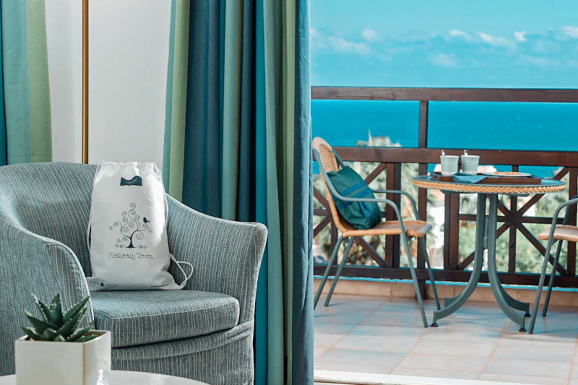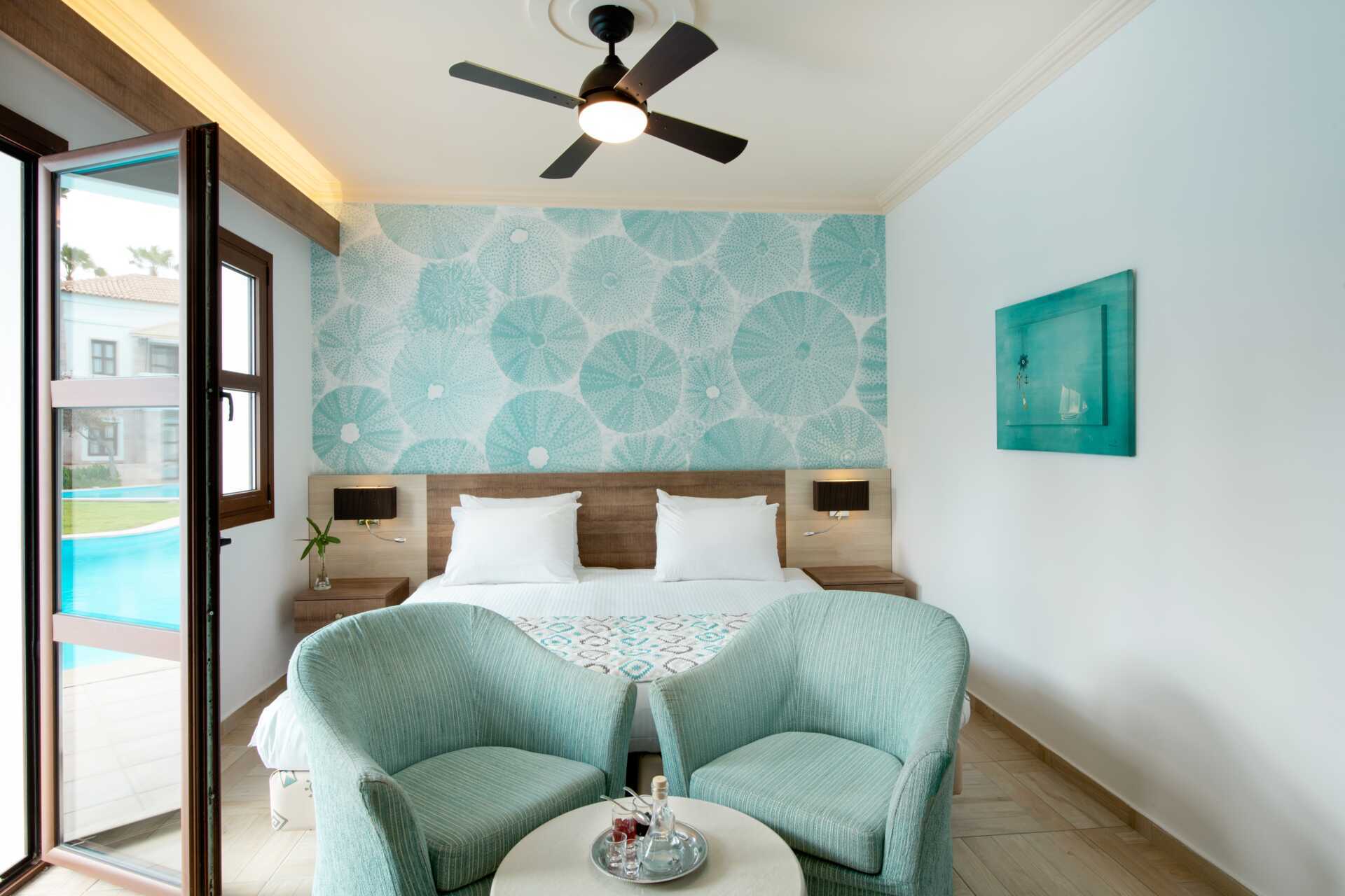 Dubbelrum i bungalow med balkong eller terrass, vissa med havsutsikt eller begränsad havsutsikt. En dubbelsäng eller två enkelsängar. Möjlighet till extrabädd i bäddsoffa. Wifi, luftkonditionering och deponering ingår. Minibar, en flaska vin ingår vid ankomsten samt läsk som fylls på varje dag. Vattenkokare samt kaffe och te. Tv med internationella kanaler. Badrockar och tofflor. Hårtork. Badrum med badkar eller dusch samt wc. Städning 7 ggr/vecka. Barn under två år räknas in i maxantalet personer i rummet.