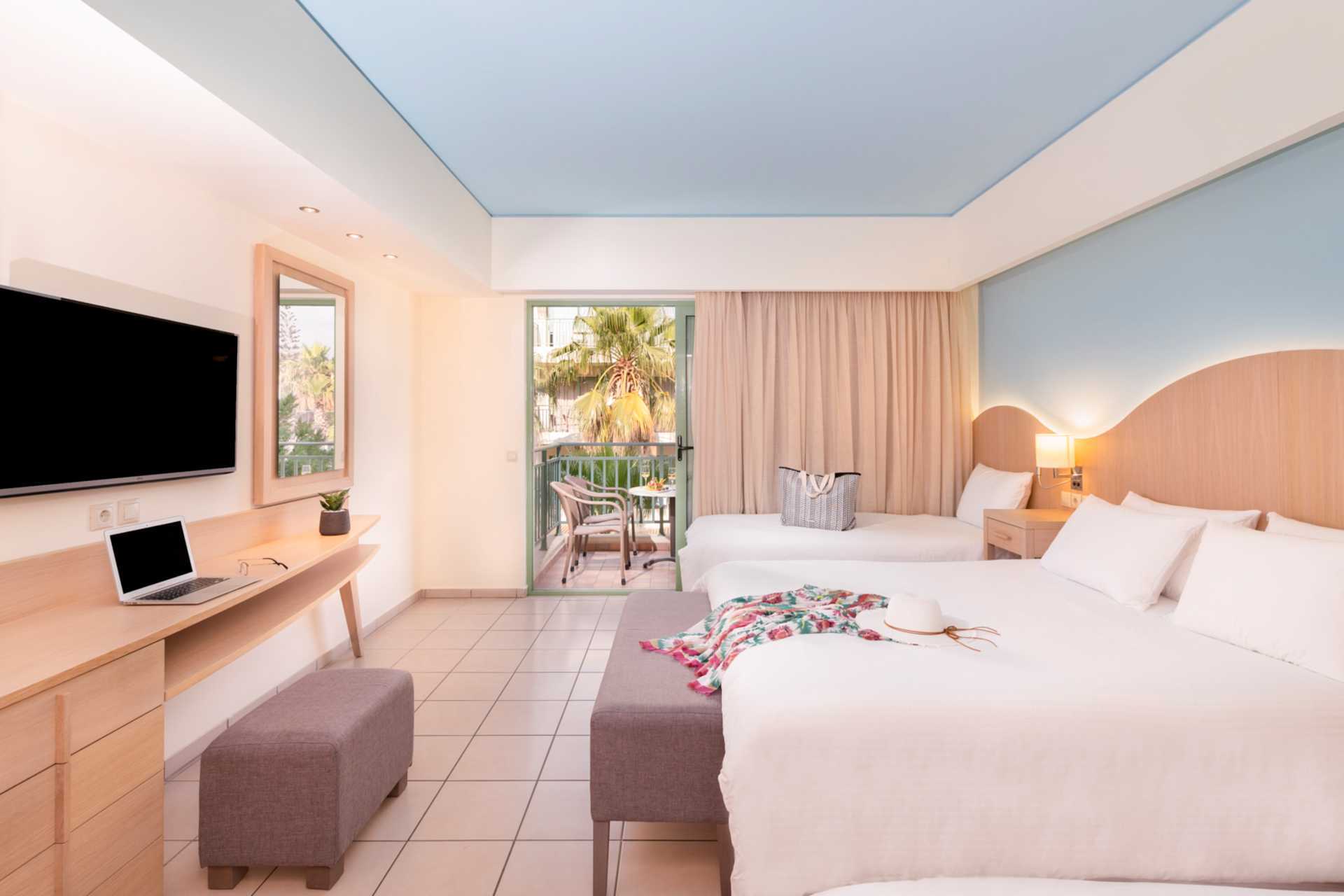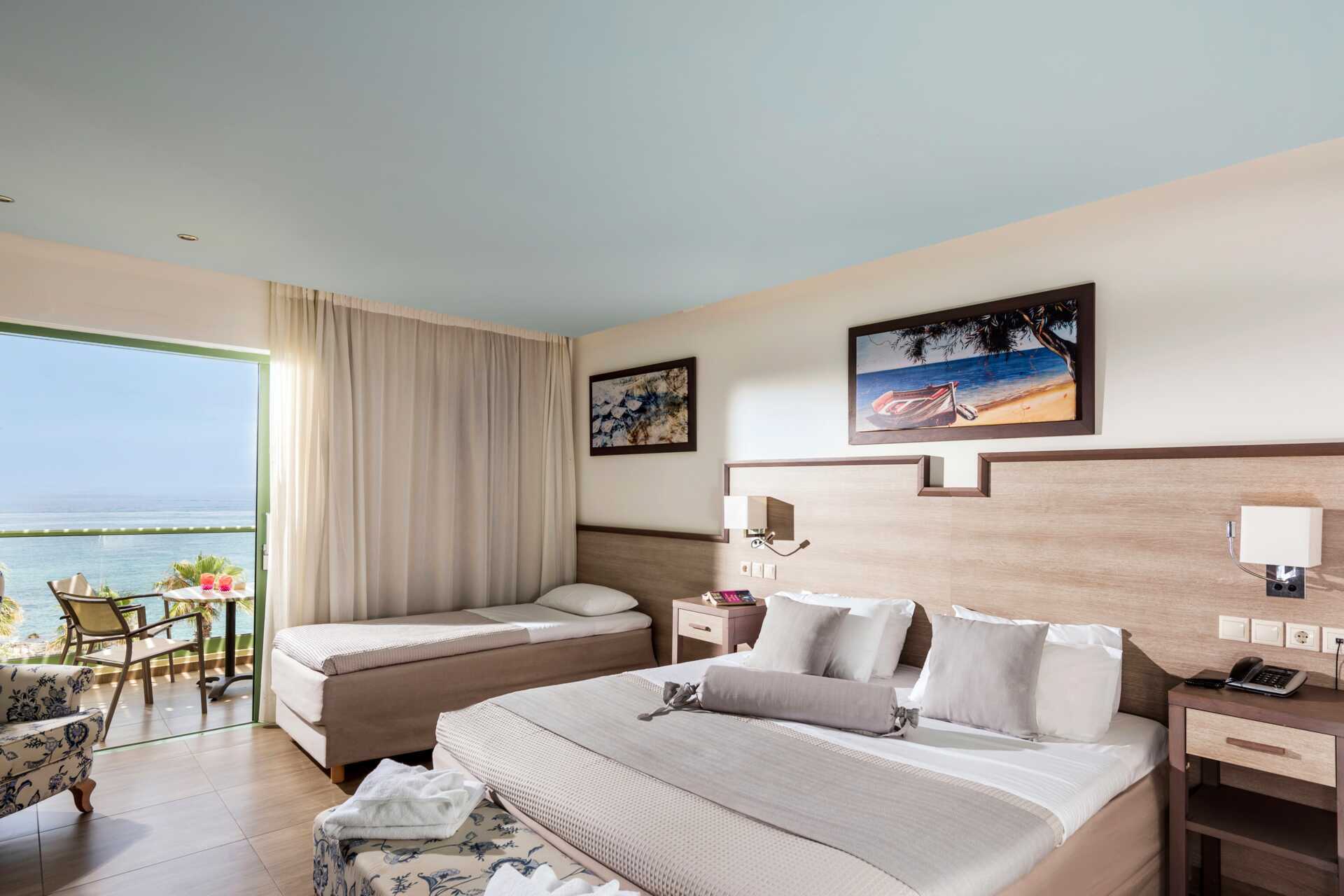 Dubbelrum med balkong, vissa med havsutsikt. En dubbelsäng eller två enkelsängar. Möjlighet till extrabädd i enkelsängar. Wifi, luftkonditionering och deponering ingår. Kylskåp - två flaskor med vatten ingår och fylls på varje dag. Mikrovågsugn, vattenkokare samt kaffe och te. Tv med internationella kanaler. Hårtork. Badrum med badkar eller dusch samt wc. Städning 7 ggr/vecka. Barn under två år räknas in i maxantalet personer i rummet.