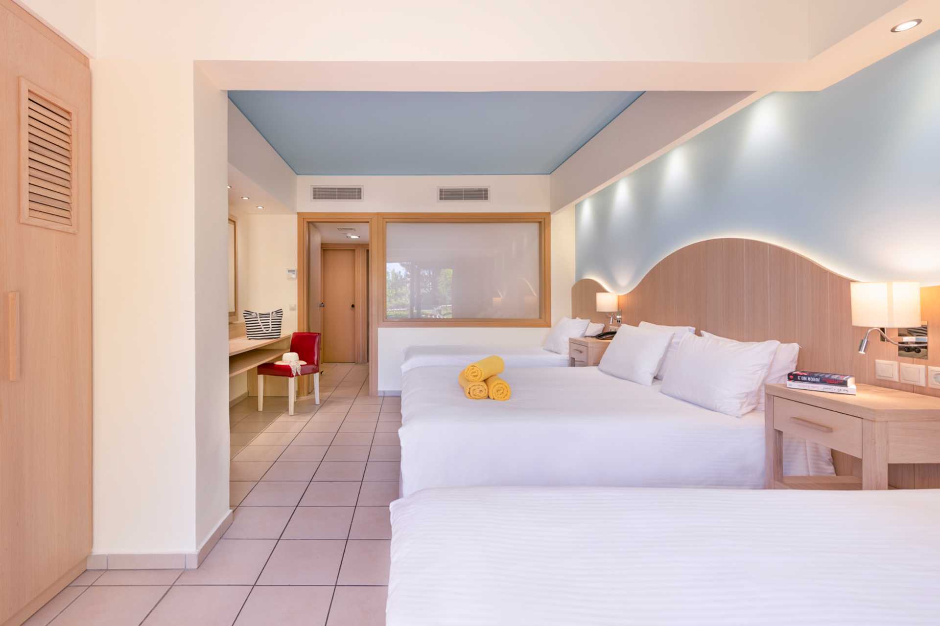 Familjerum med markterrass. Ett sovrum med en dubbelsäng och två enkelsängar samt ett sovrum med två enkelsängar. Wifi, luftkonditionering och deponering ingår. Kylskåp - två flaskor med vatten ingår och fylls på varje dag. Mikrovågsugn. Vattenkokare samt kaffe och te. Tv med internationella kanaler. Hårtork. Badrum med badkar eller dusch samt wc. Städning 7 ggr/vecka. Barn under två år räknas in i maxantalet personer i rummet.