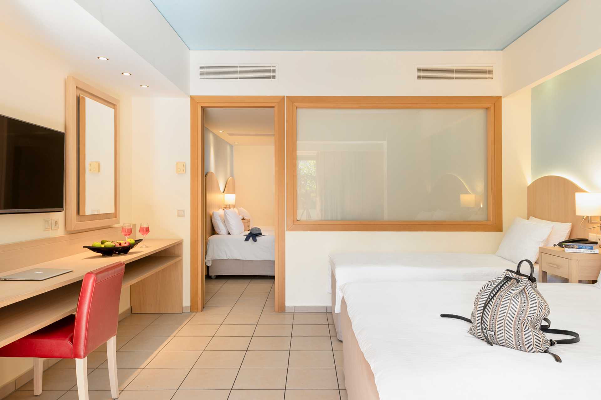 Familjerum superior med markterrass eller balkong. Rummen med markterrass har ingång via terrassen. Sovrum och vardagsrum. En dubbelsäng. Möjlighet till extrabäddar i tre och/eller fyra enkelsängar. Kylskåp - två flaskor med vatten ingår och fylls på varje dag. Mikrovågsugn. Vattenkokare samt kaffe och te. Tv med internationella kanaler. Hårtork. Badrum med badkar eller dusch samt wc. Städning 7 ggr/vecka. Barn under två år räknas in i maxantalet personer i rummet.
