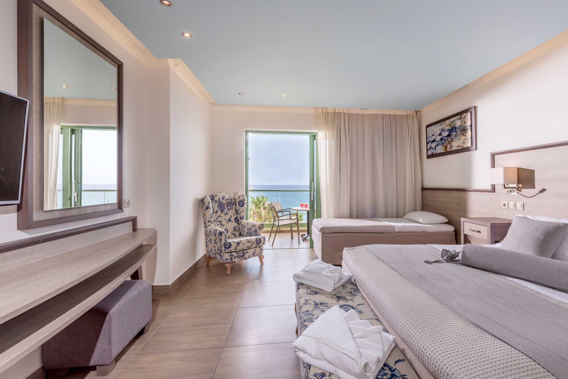 Svit med balkong och havsutsikt. En dubbelsäng. Möjlighet till extrabädd i enkelsäng. Wifi, luftkonditionering och deponering ingår. Kylskåp - två flaskor med vatten ingår och fylls på varje dag. Mikrovågsugn. Vattenkokare samt kaffe och te. Tv med internationella kanaler. Hårtork. Badrum med badkar eller dusch samt wc. Städning 7 ggr/vecka. Barn under två år räknas in i maxantalet personer i rummet.