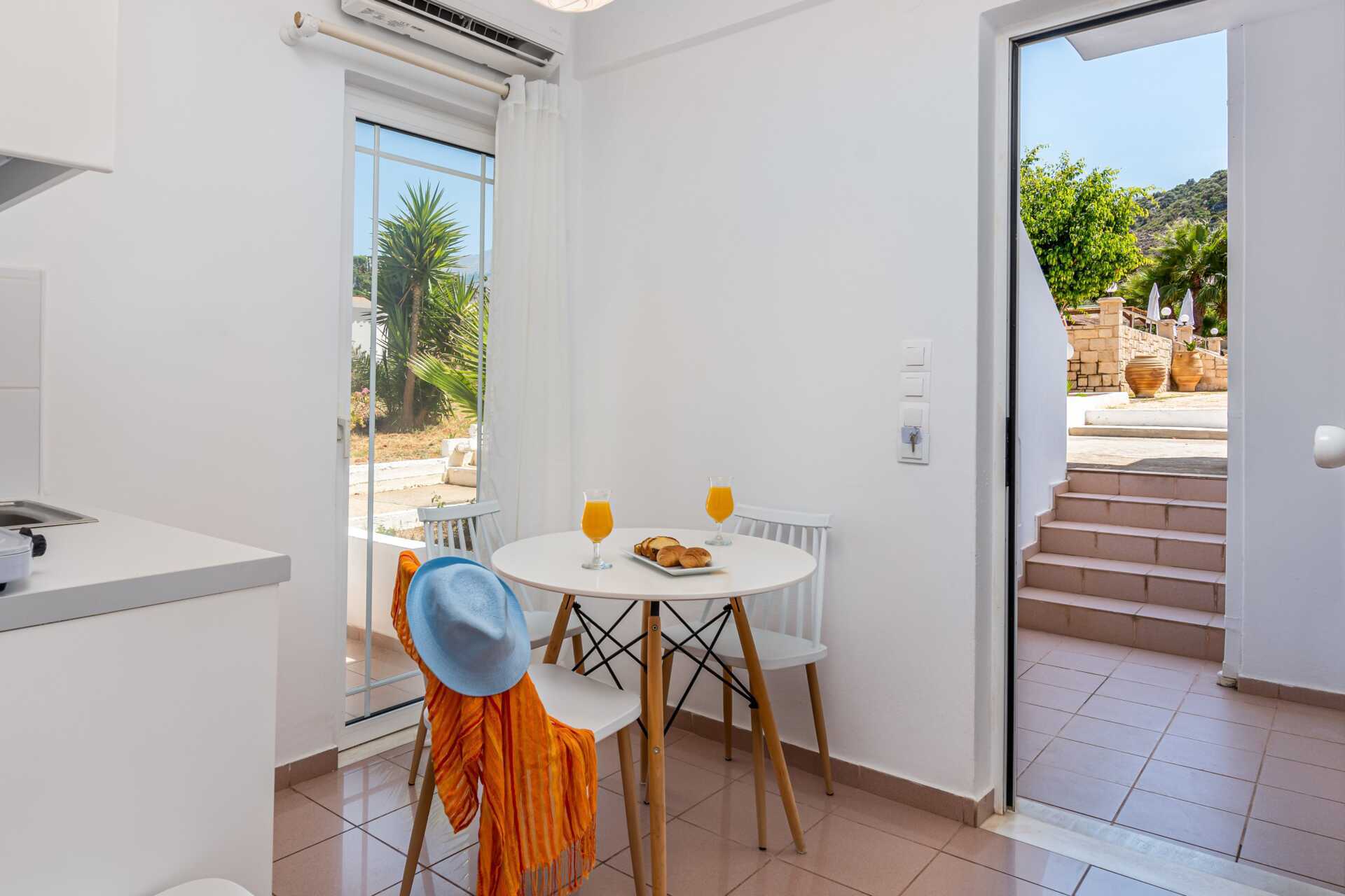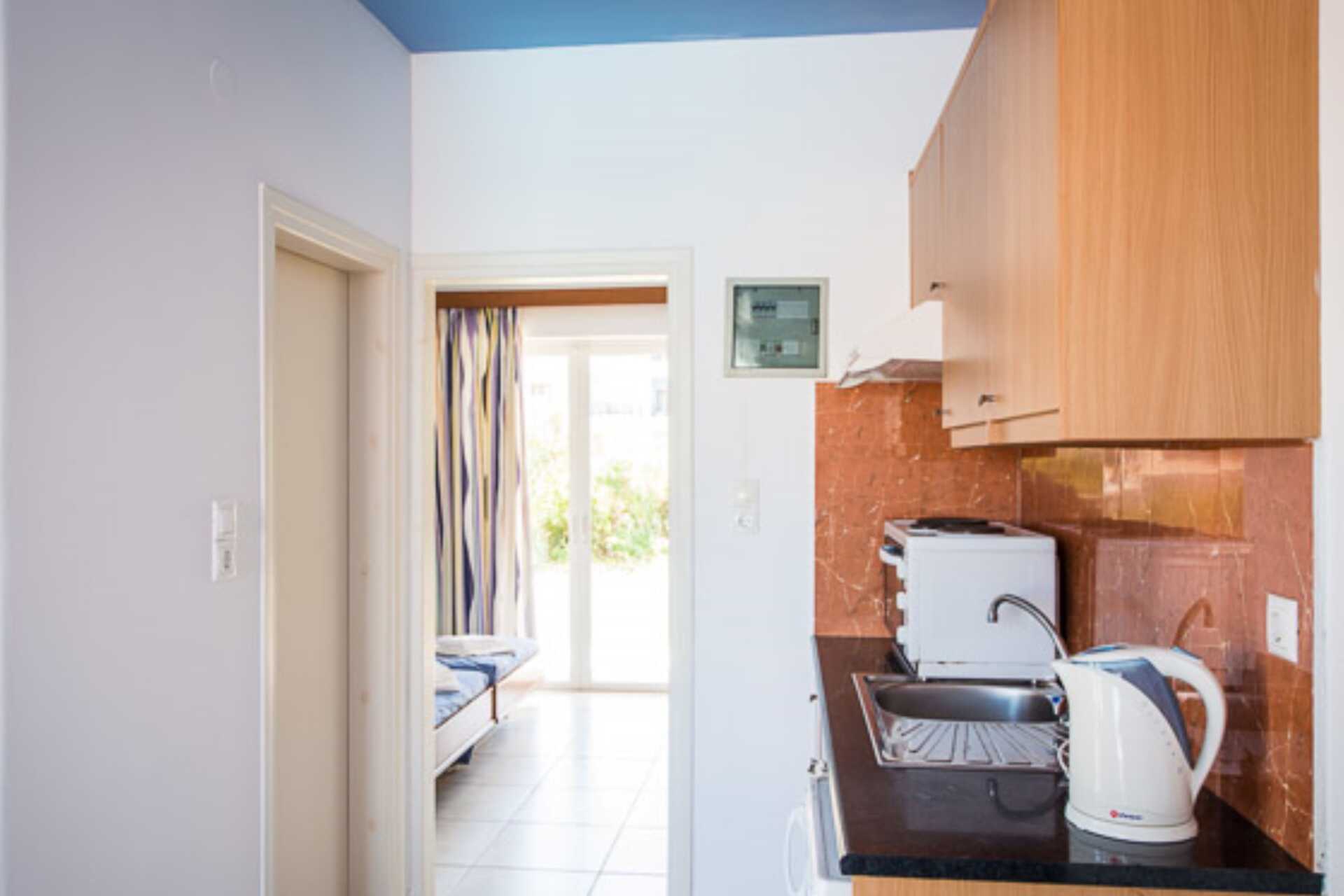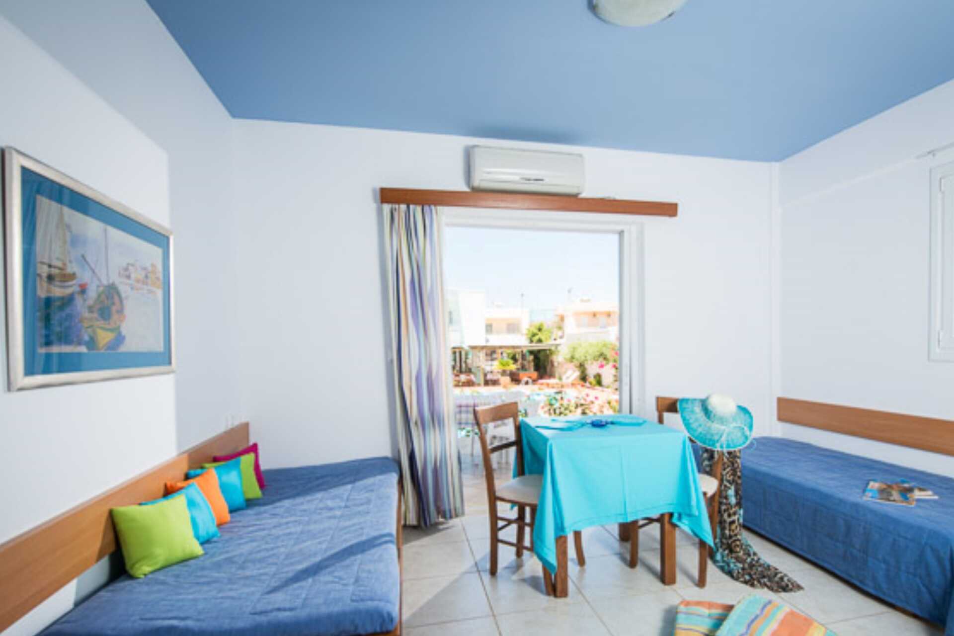Tvårumslägenhet med balkong eller terrass. Sovrum och kombinerat vardagsrum med minikök. Två enkelsängar. Möjlighet till två extrabäddar i två enkelsängar. Minikök med kokplattor, kylskåp, kaffebryggare, vattenkokare, brödrost och enkel köksutrusting. . Wifi och deponering ingår. Luftkonditionering mot avgift. Tv med internationella kanaler. Hårtork. Badrum med dusch och wc. Städning 7 ggr/vecka.