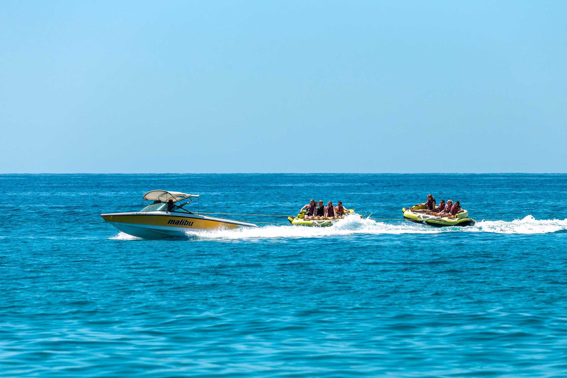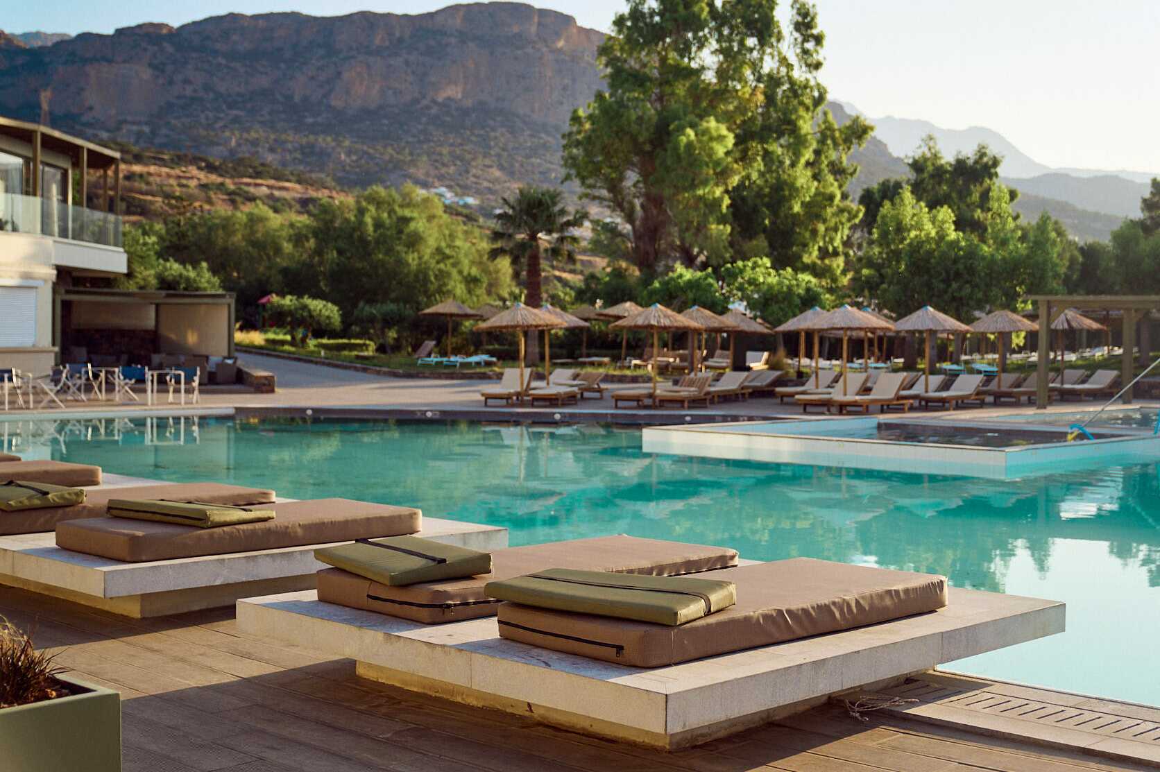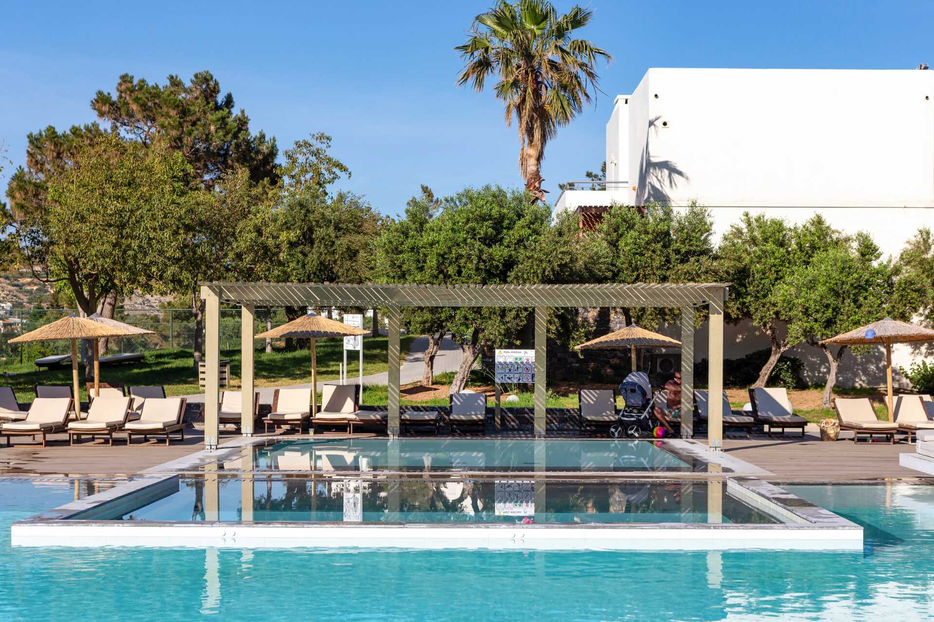 Efter ett intensivt träningspass väntar svalkande dopp i något av hotellets två stora poolområden. För barn finns en barnpool med vattenrutschkana och en mindre pool med skugga. På den privata delen av stranden kan du njuta av kristallklart vatten, grovkornig sandstrand och en mysig strandbar. Solstolar och parasoller ingår både vid poolerna och stranden. Poolhanddukar mot deposition.