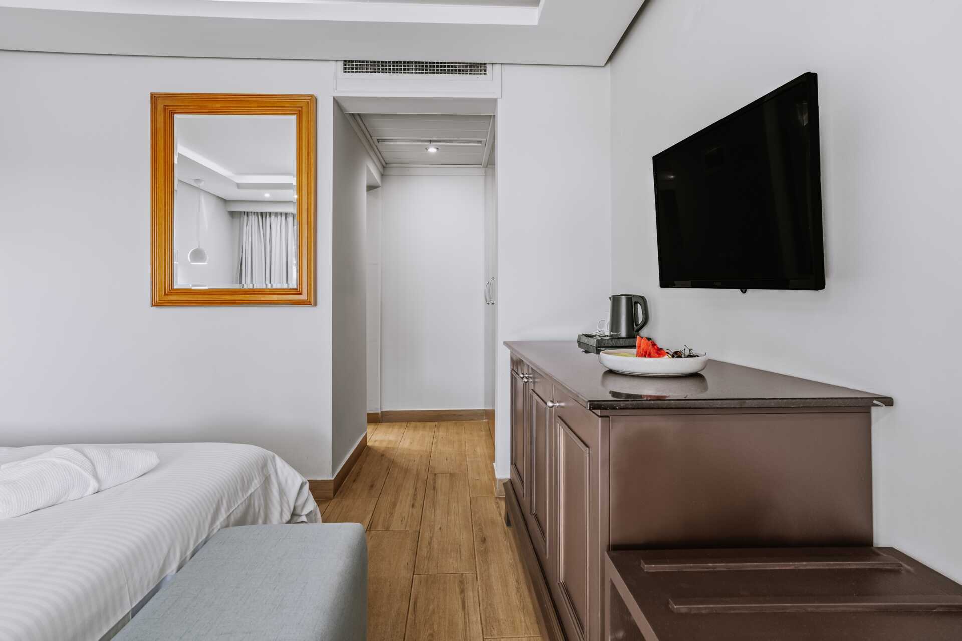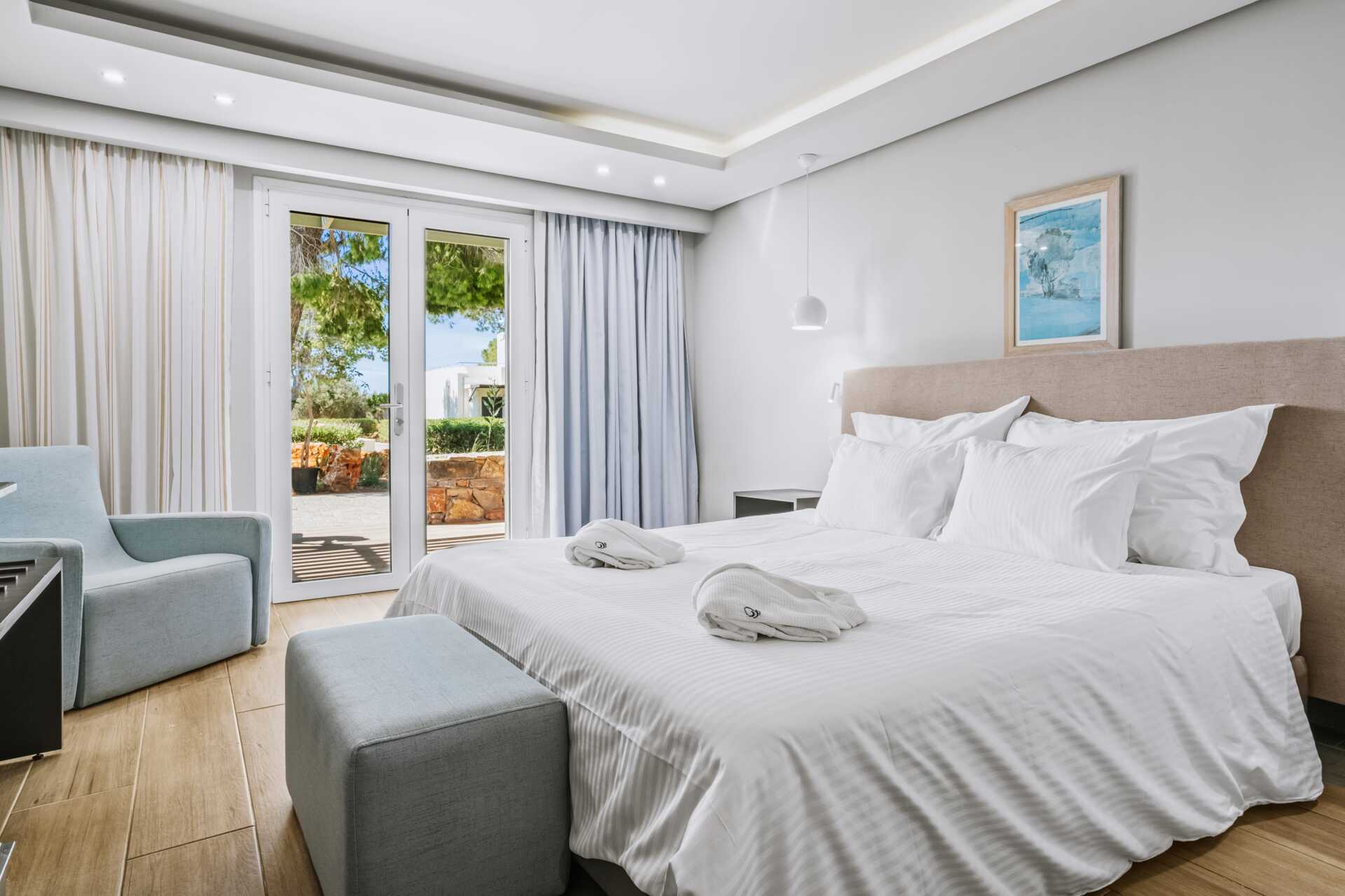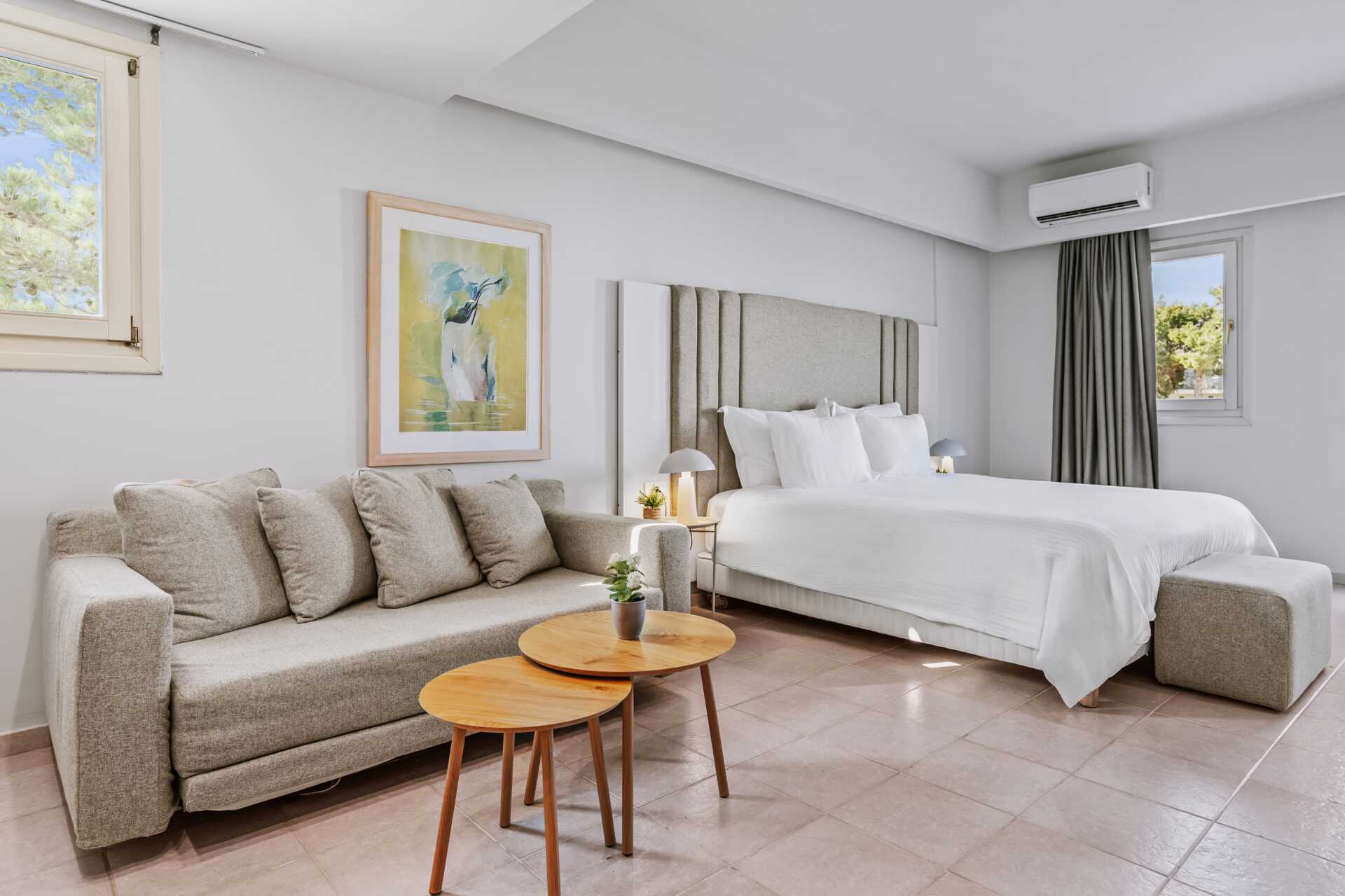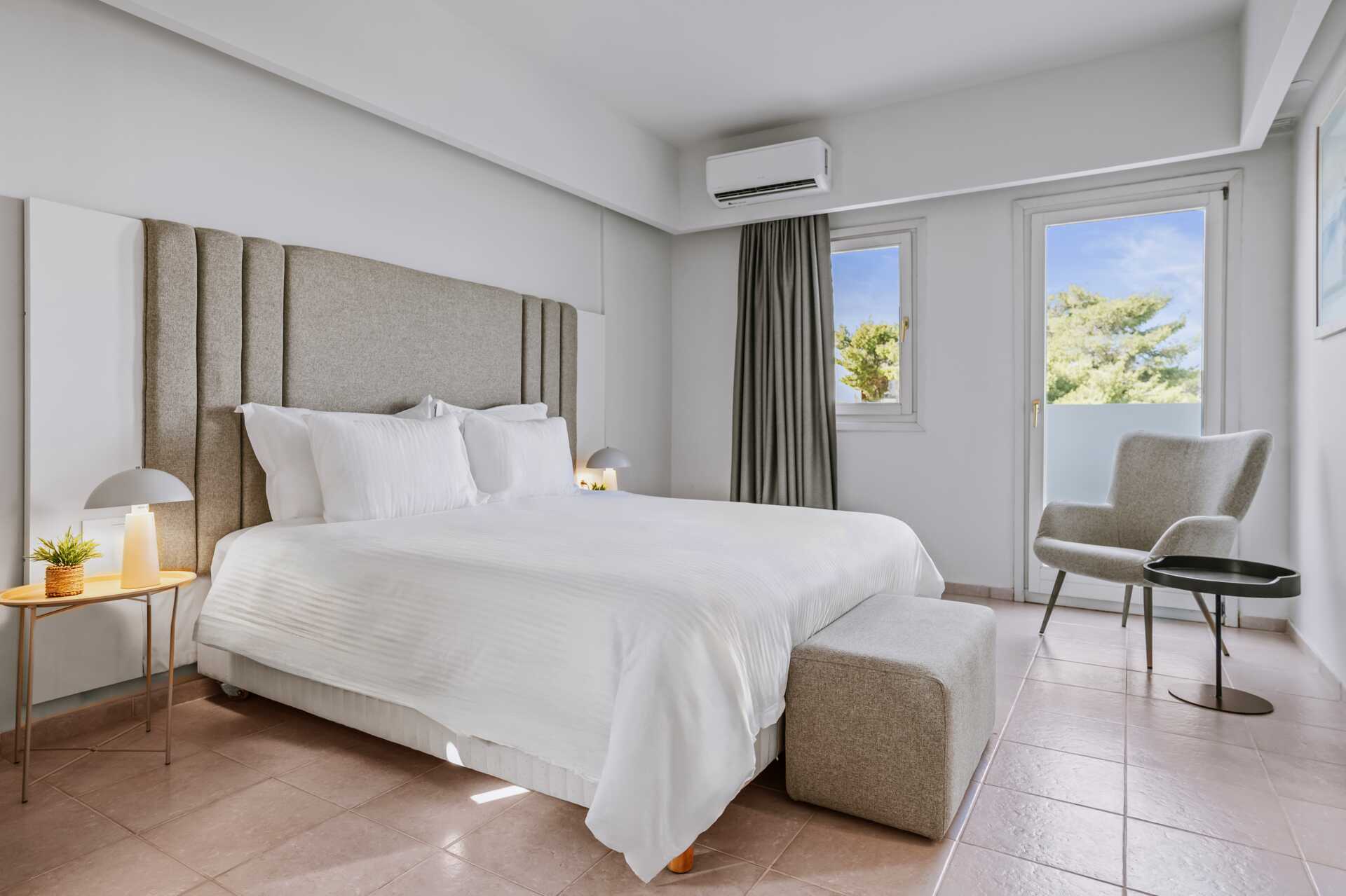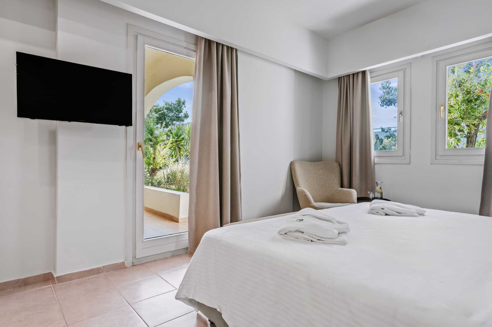 Dubbelrum med balkong eller markterrass. Vissa balkonger vetter mot havet och vissa har begränsad havsutsikt. Balkongerna varierar i storlek. En dubbelsäng eller två enkelsängar. Möjlighet till extrabädd i enkelsäng. Några rum har en extrabädd som inte går att ta bort. Wifi, luftkonditionering och deponering ingår. Kylskåp. Tv med internationella kanaler, Hårtork. Badrum med badkar eller dusch samt wc. Städning 7 ggr/vecka.