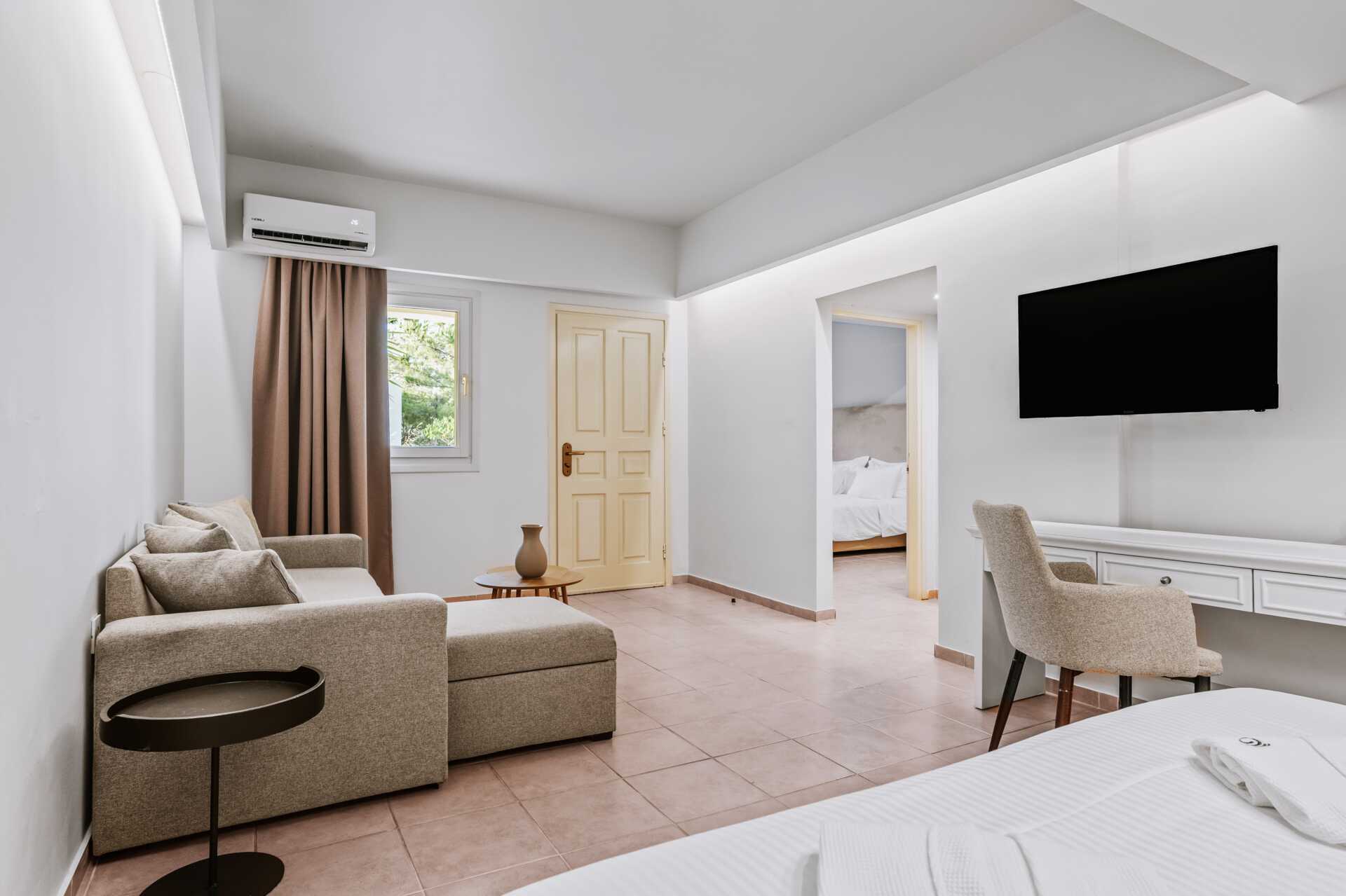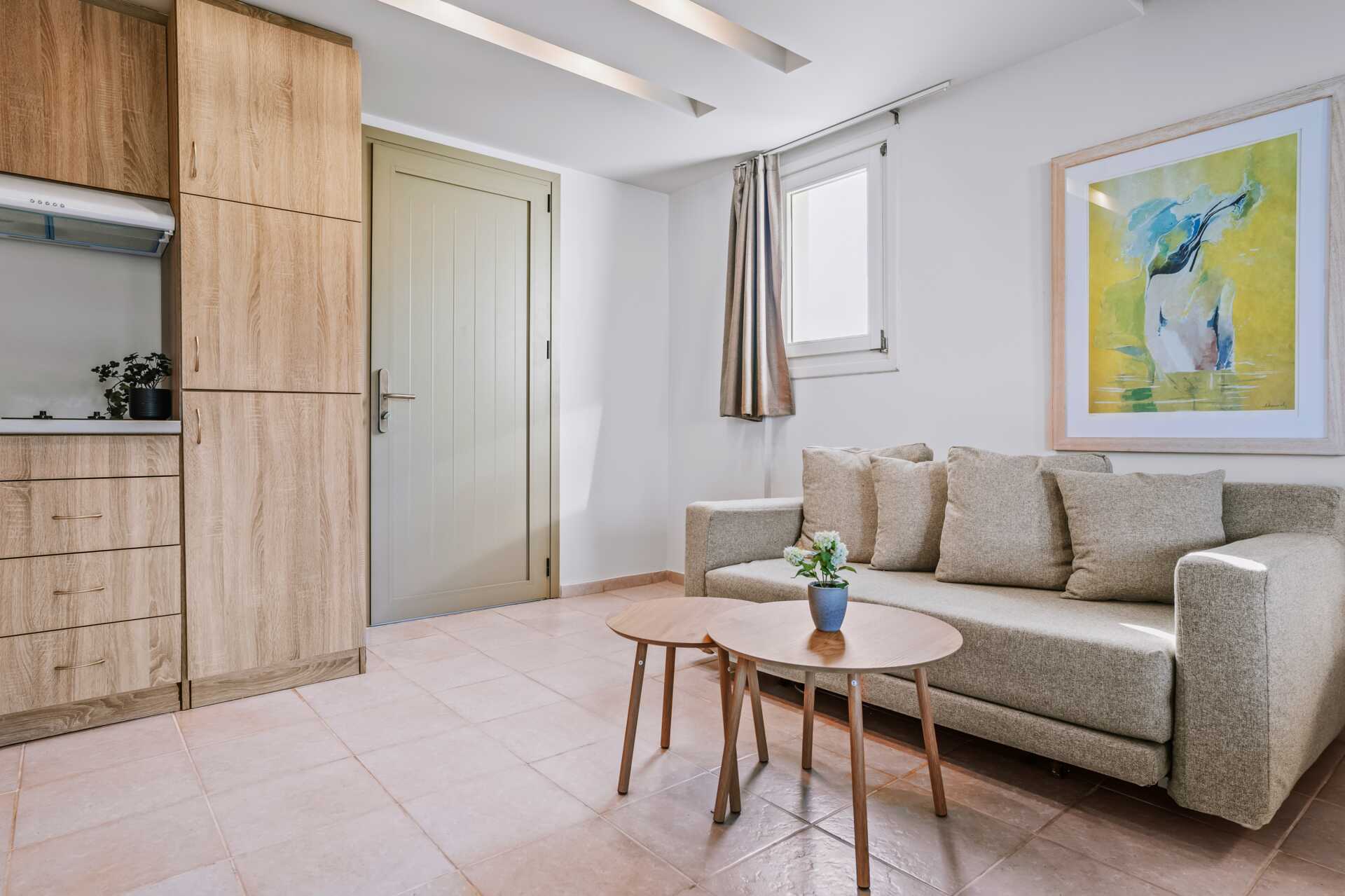 Tvårumslägenhet med balkong, vissa med begränsad havsutsikt. Balkongerna varierar i storlek. Ett sovrum och ett kombinerat vardagsrum/minikök. Två enkelsängar. Möjlighet till extrabädd i bäddsoffa. Minikök med kokplattor, kylskåp samt enklare köksutrustning. Mikrovågsugn finns att låna mot förfrågan (begränsat antal). Vattenkokare samt kaffe och te. Wifi, deponering och luftkonditionering ingår. Tv med internationella kanaler. Hårtork. Badrum med badkar och wc. Städning 7 ggr/vecka.