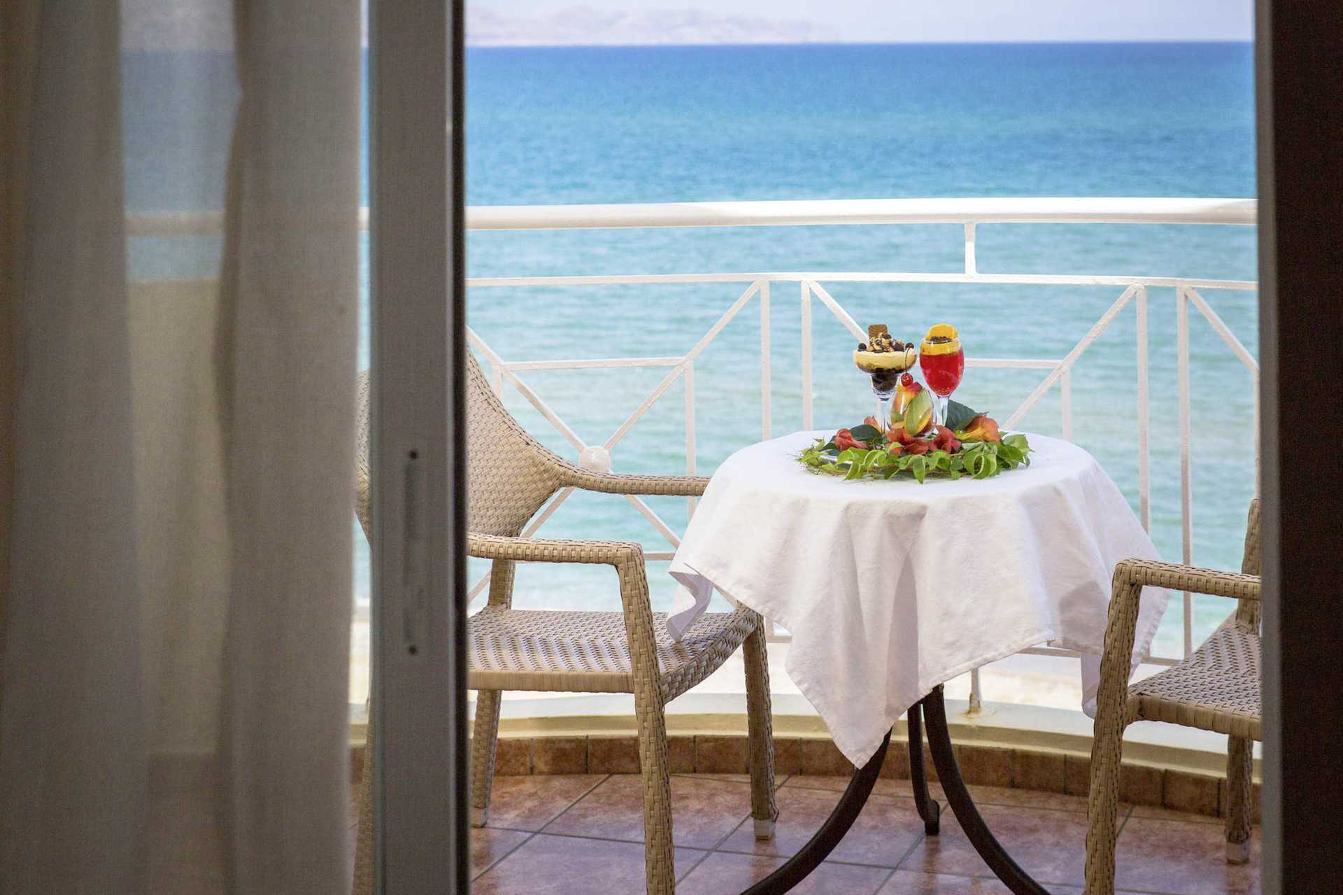 Dubbelrum med balkong med havsutsikt, med begränsad havsutsikt eller med poolutsikt. En dubbelsäng eller två enkelsängar. Möjlighet till extrabädd i bäddsoffa. Wifi och luftkonditionering ingår. Deponering mot avgift. Kylskåp. Tv med internationella kanaler. Hårtork. Badrum med badkar eller dusch samt wc. Städning 6 ggr/vecka.